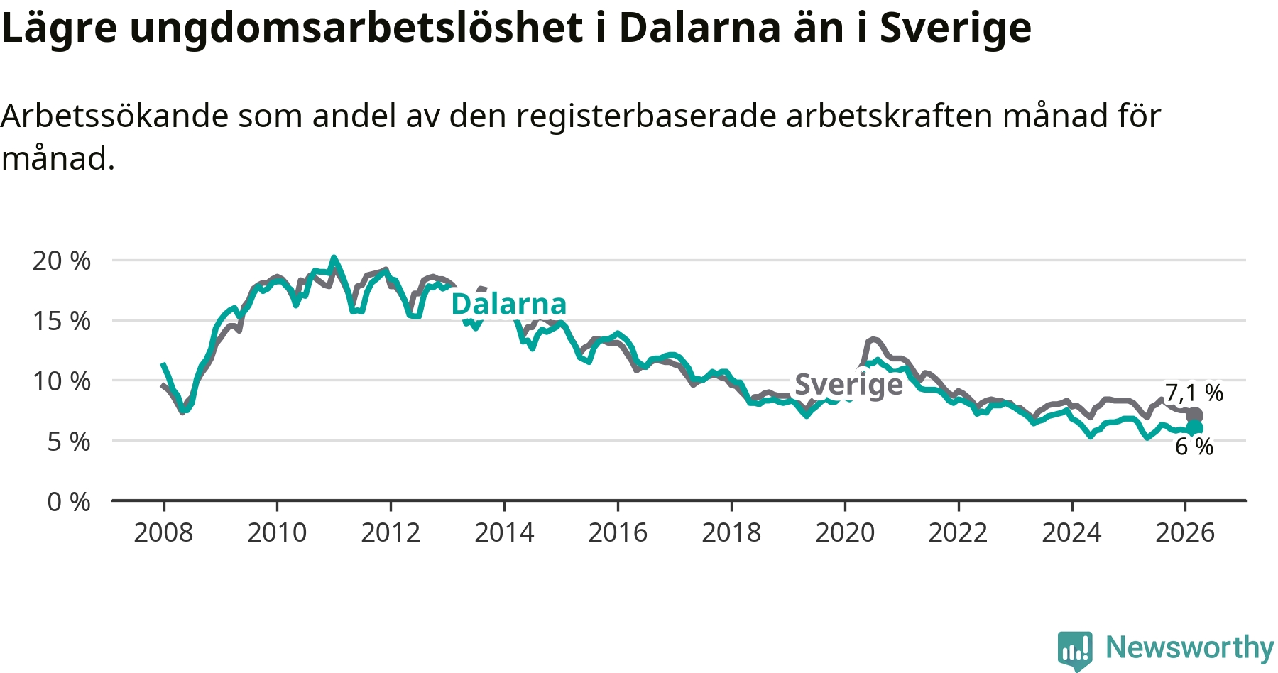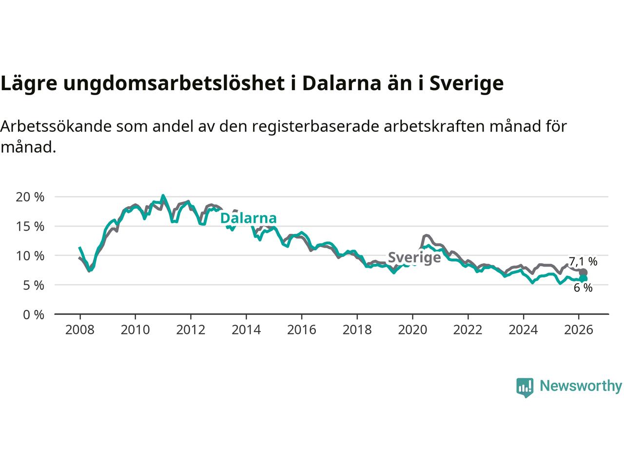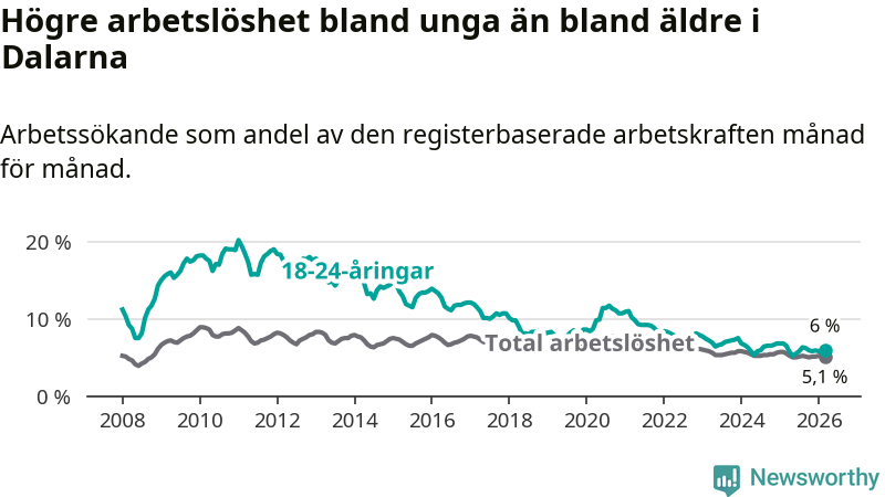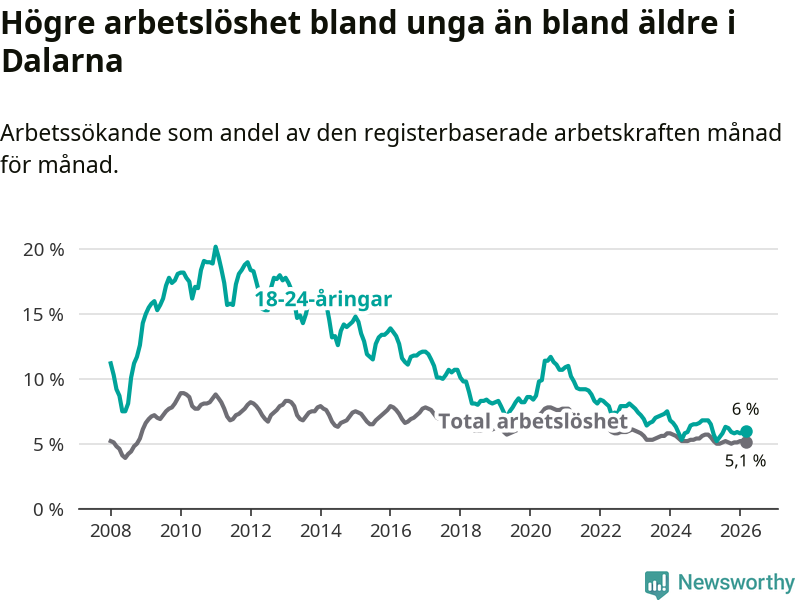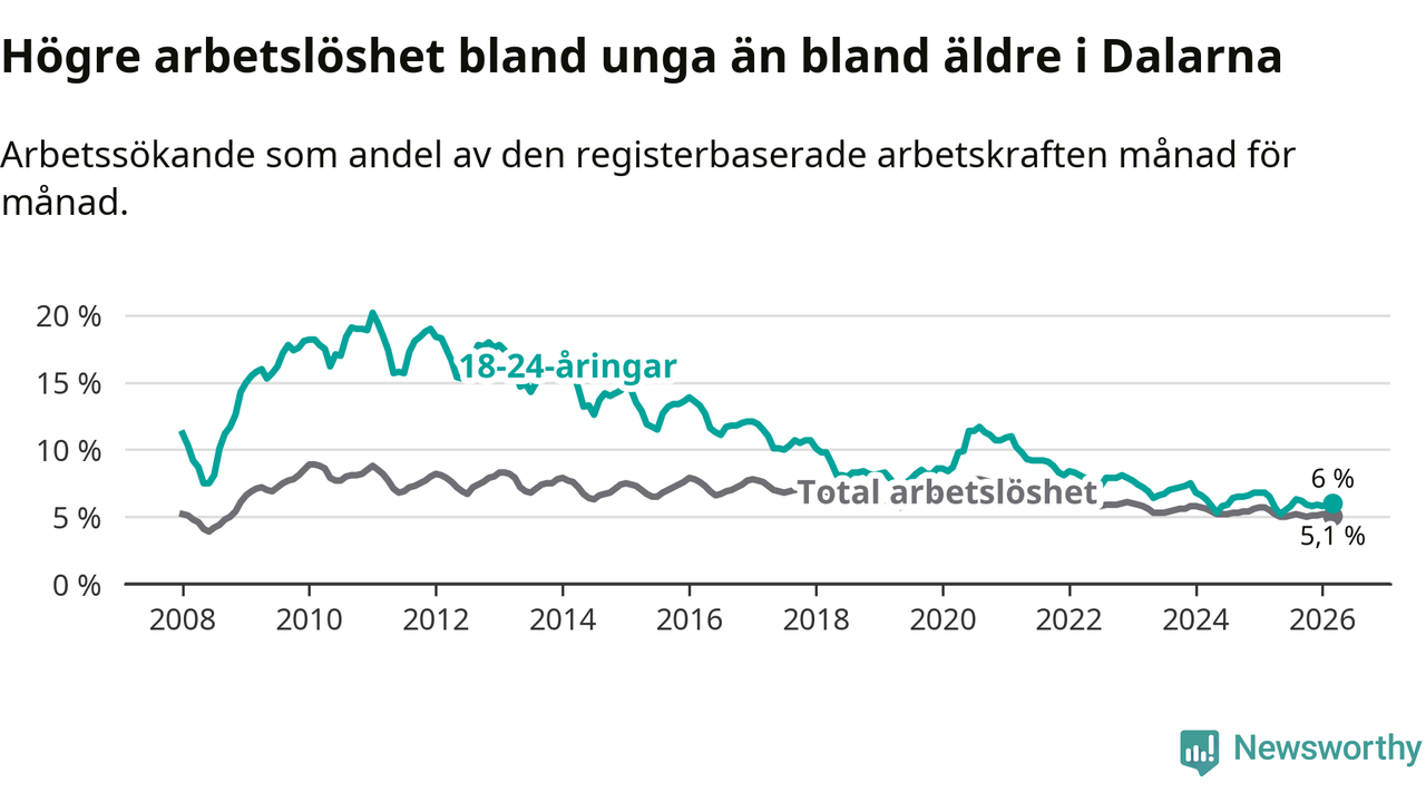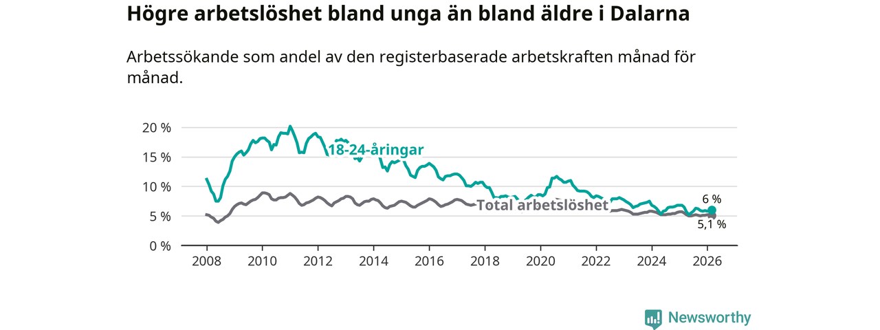 I och med den senaste månadens nedgång har de ungas arbetslöshet i Dalarna sjunkit tolv månader i följd (ner från 6,5 procent i mars 2025 till 6,0 procent nu).
