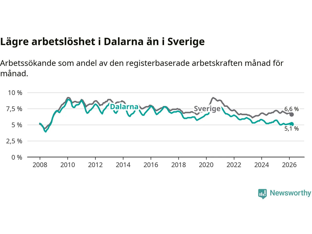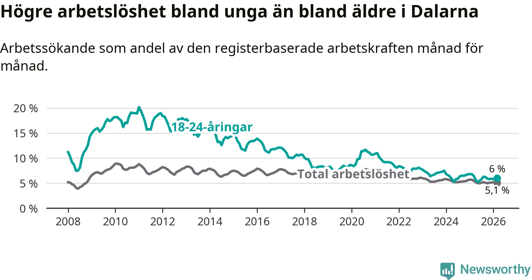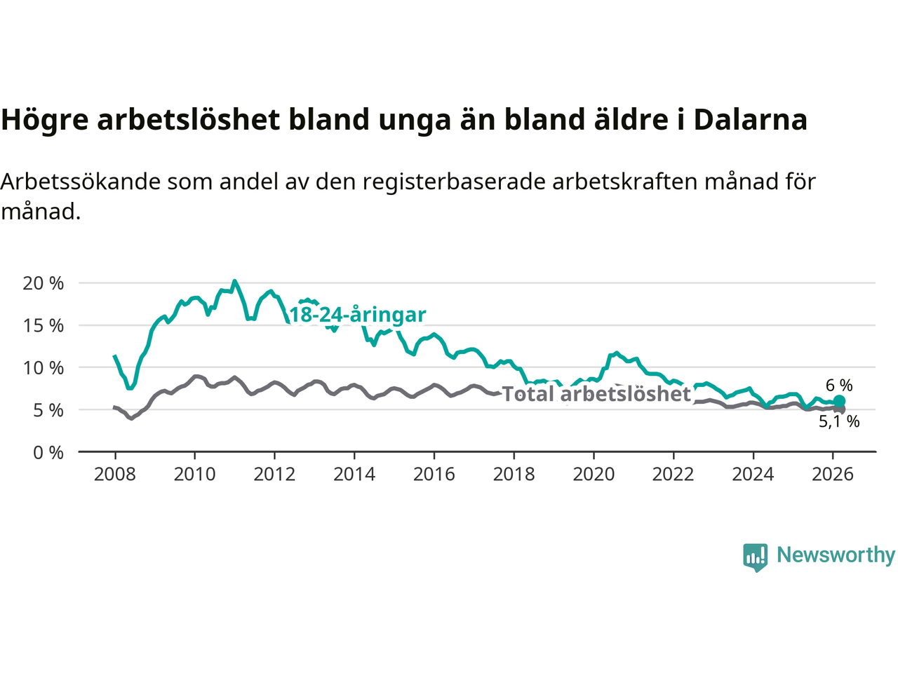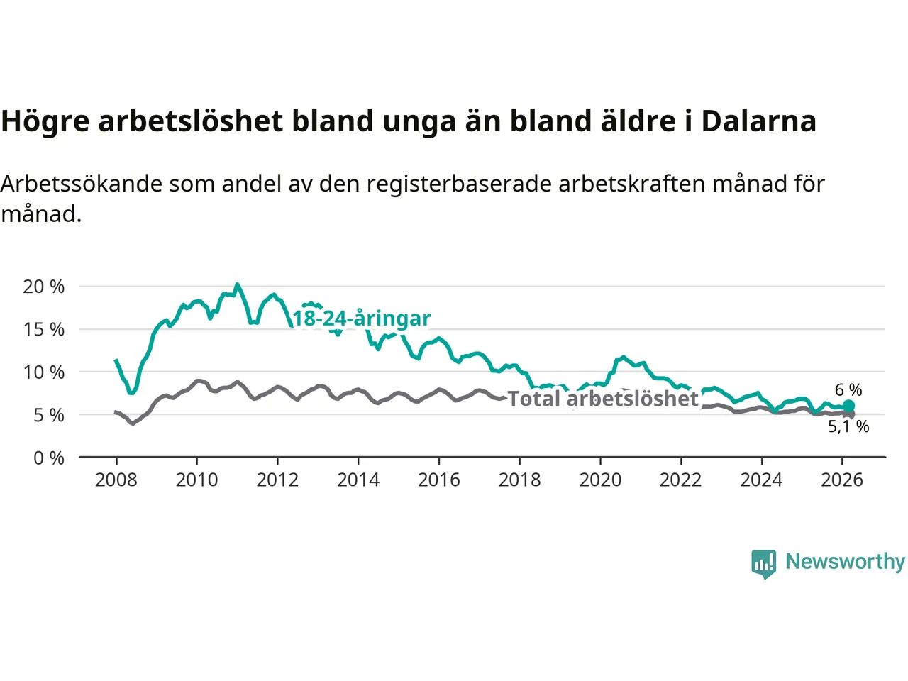 I och med den senaste månadens nedgång har de ungas arbetslöshet i Dalarna sjunkit tolv månader i följd (ner från 6,5 procent i mars 2025 till 6,0 procent nu).