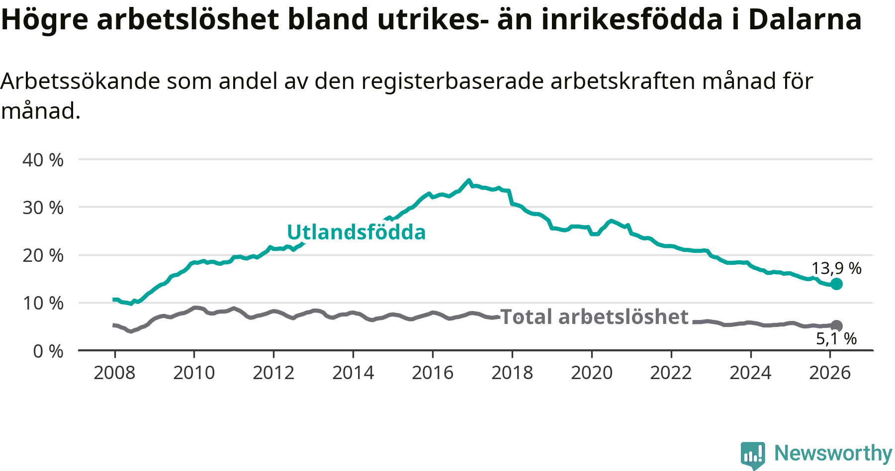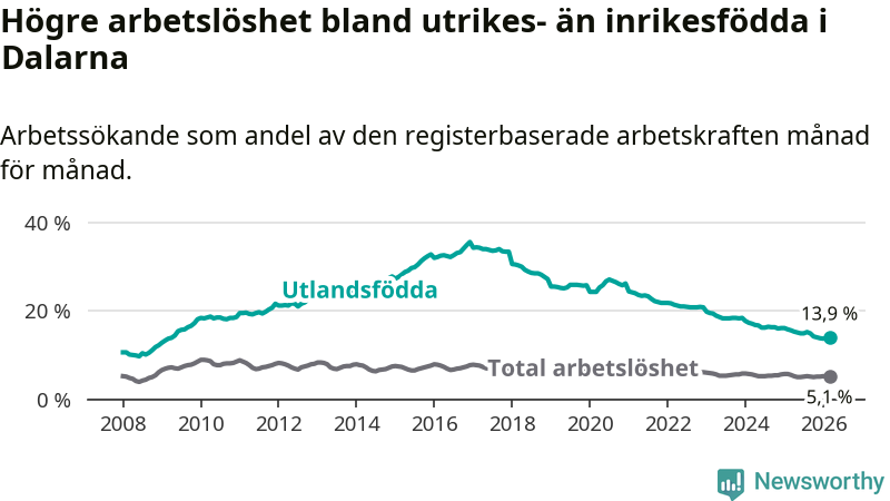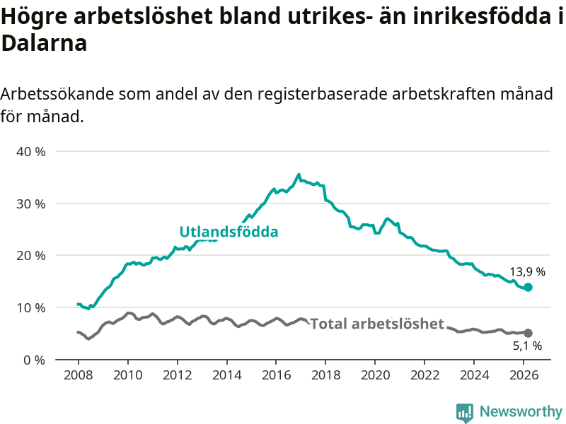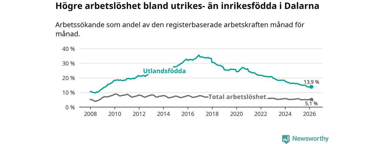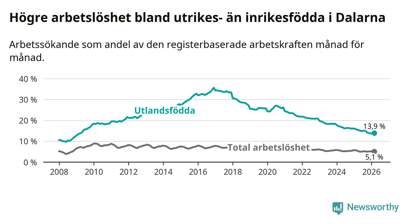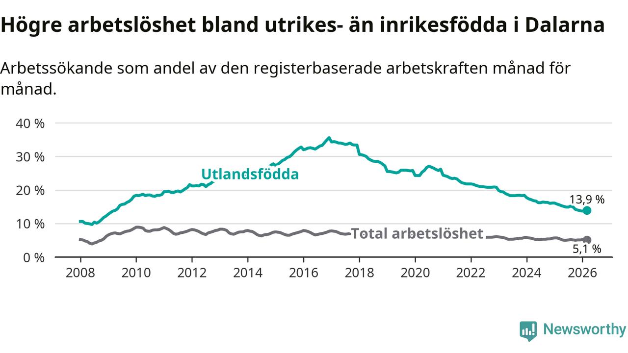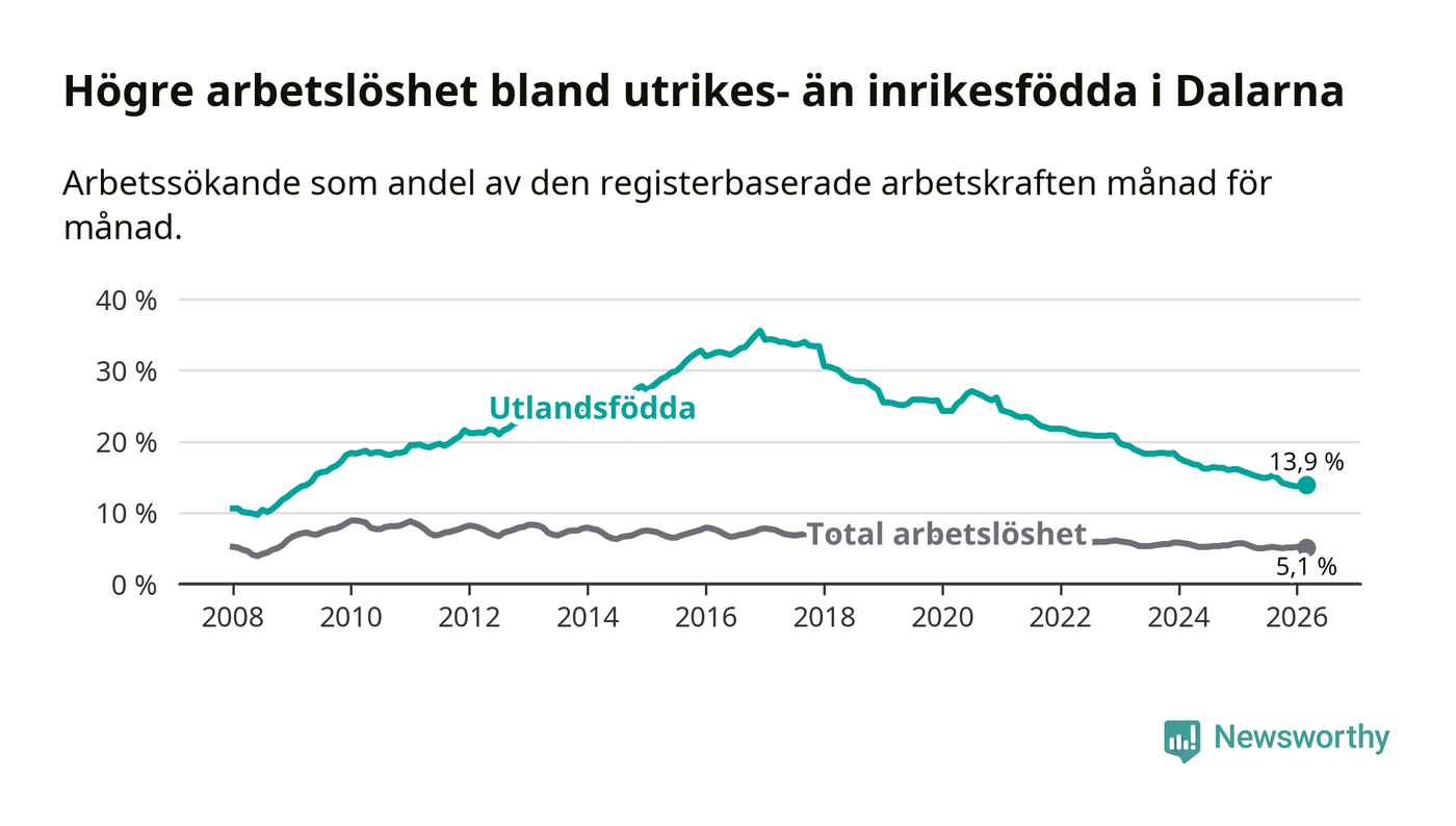 Arbetslösheten bland utlandsfödda var 13,9 procent i Dalarna under mars månad, motsvarande 2 963 av 21 317 personer. Det är 1,7 procentenheter färre än vid samma tidpunkt i fjol (−320 om man räknar personer). Därmed har de utlandsföddas arbetslöshet varit lägre än vid samma tidpunkt i fjol i över fem år i sträck. Sedan januari 2021 har arbetslösheten bland utlandsfödda minskat från 24,4 till 13,9 procent.