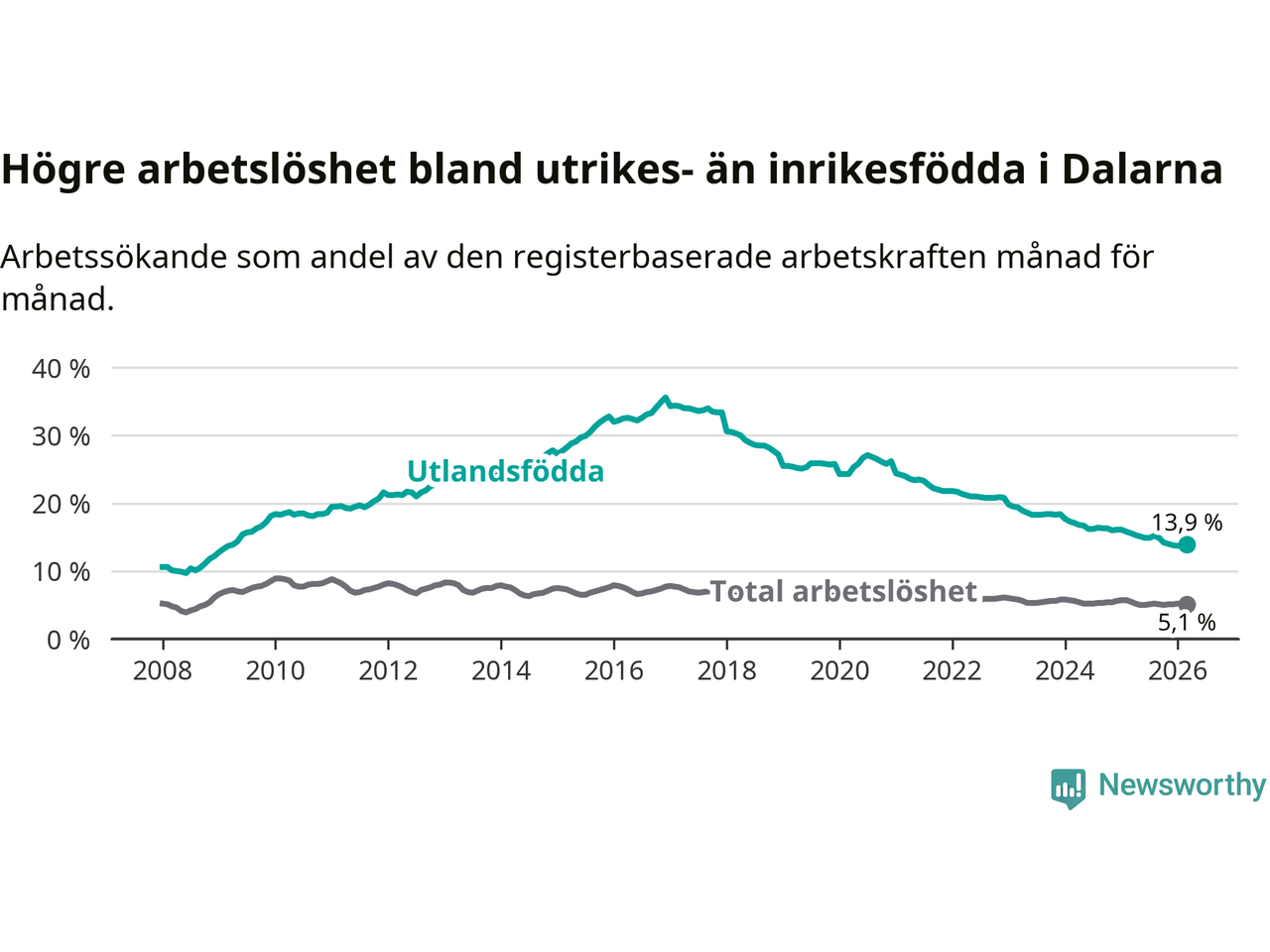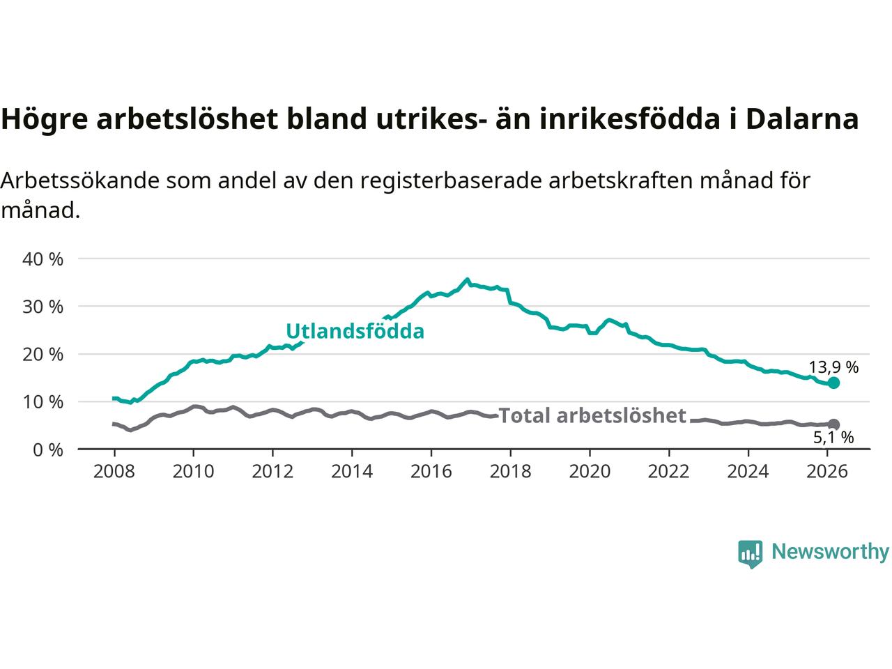 Graf: Skillnad i arbetslöshet mellan utrikesfödda och hela befolkningen i Dalarnas län