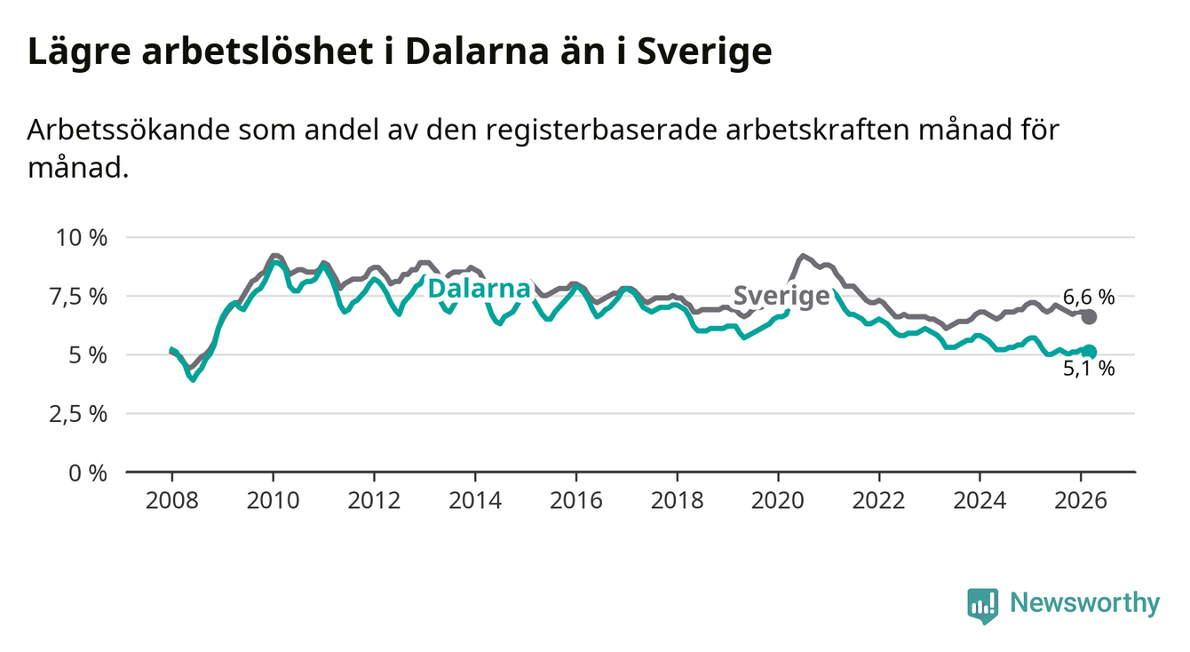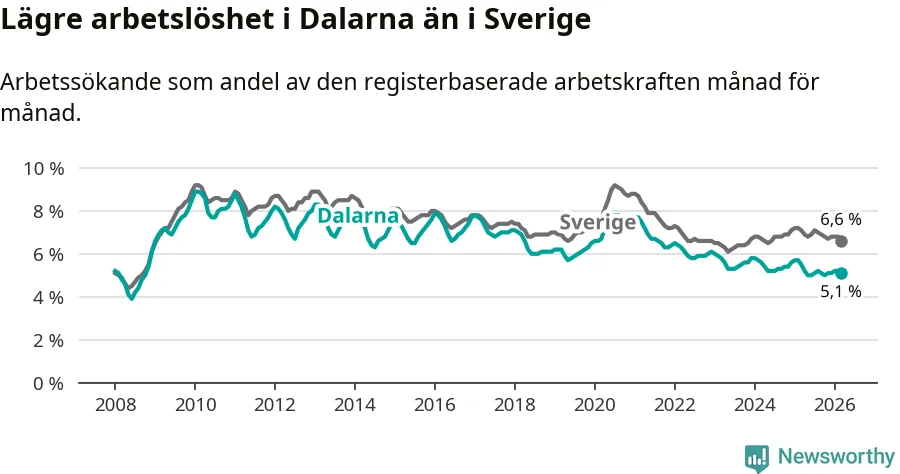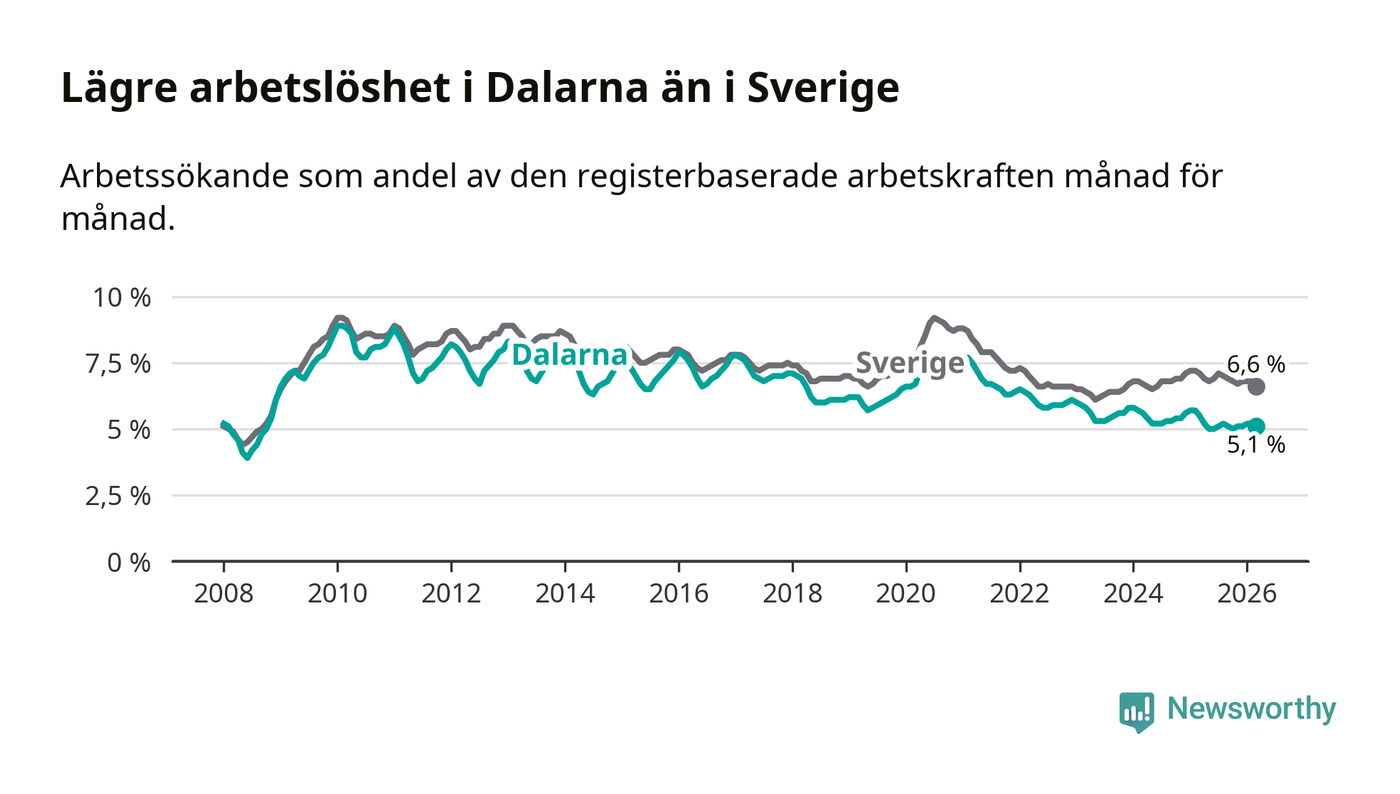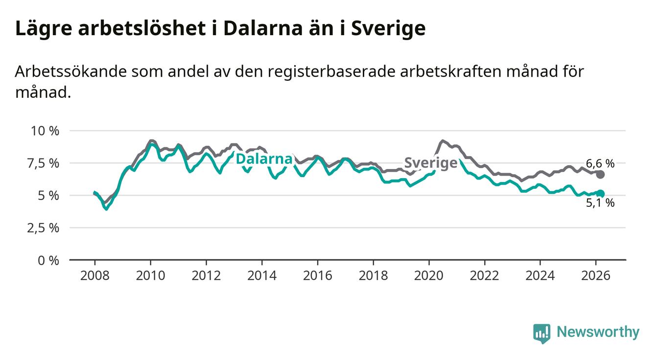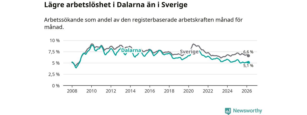 Under mars månad rapporterade Dalarnas län en total arbetslöshet på 5,1 procent. Det är en minskning jämfört med samma tidpunkt i fjol (−0,4 procentenheter). Även i Sverige sjunker arbetslösheten .