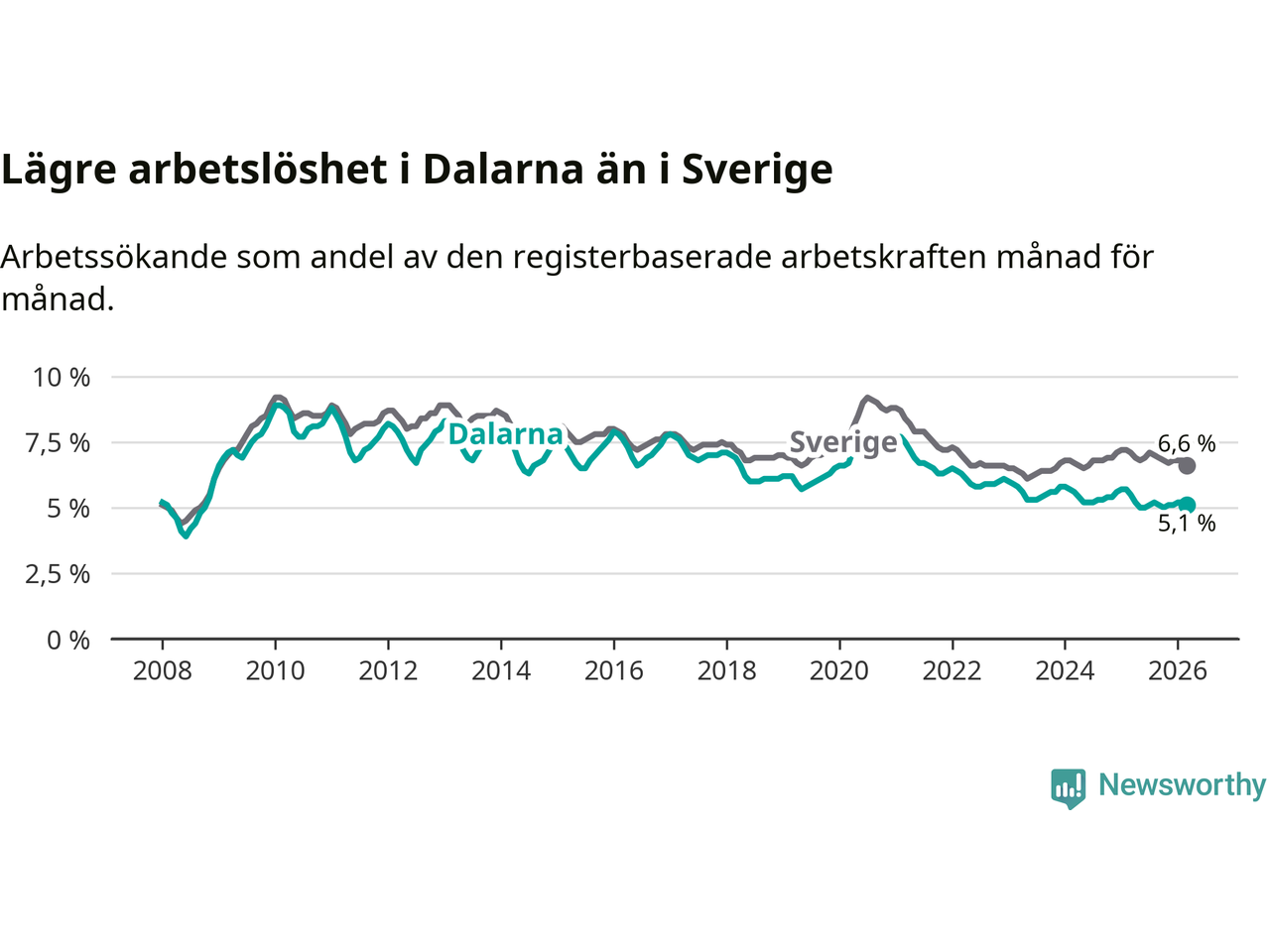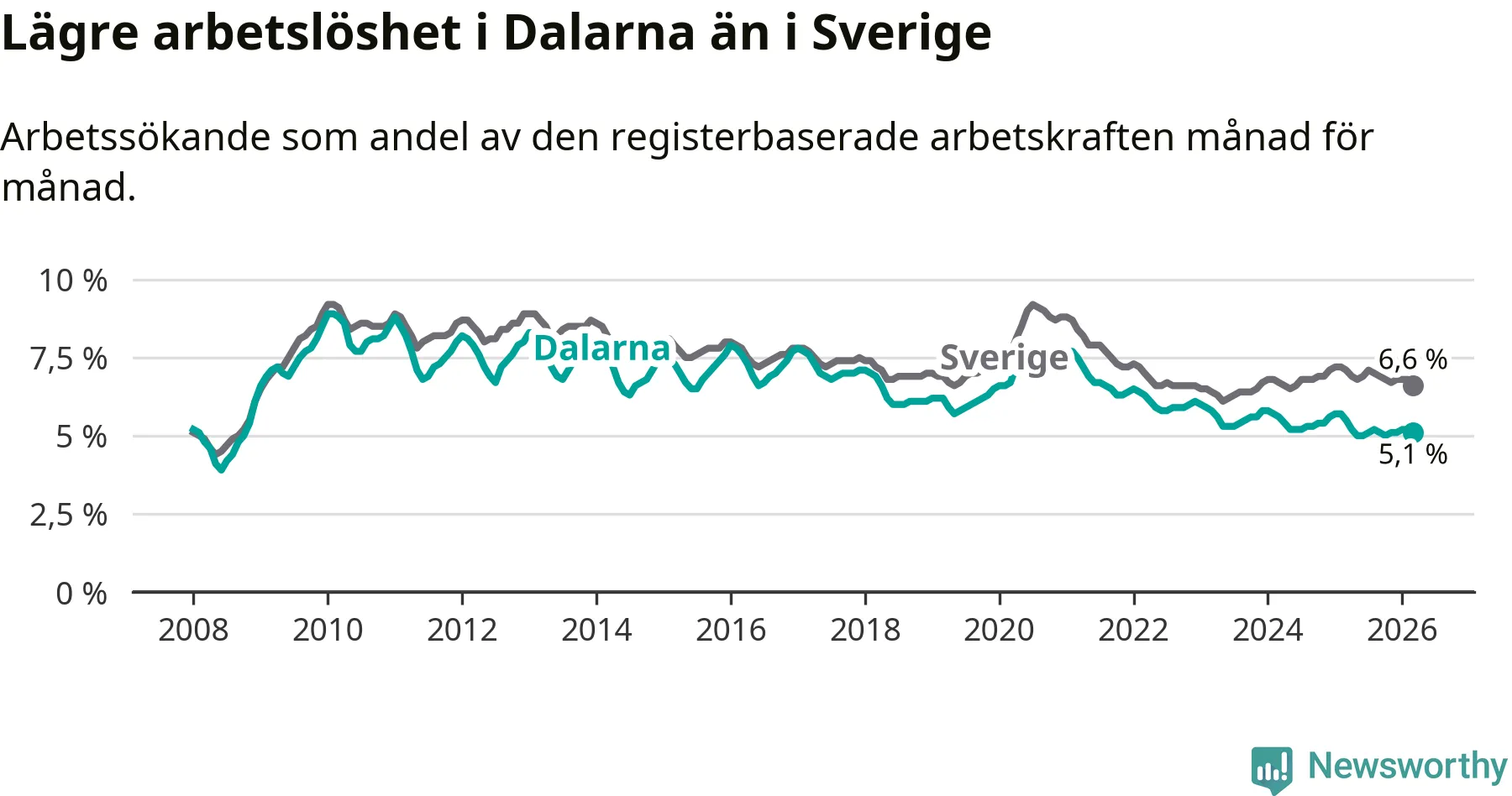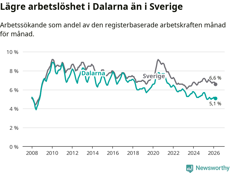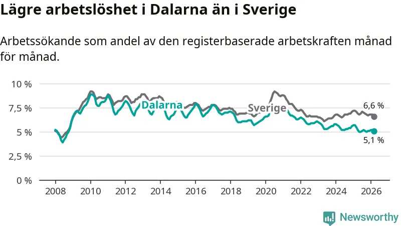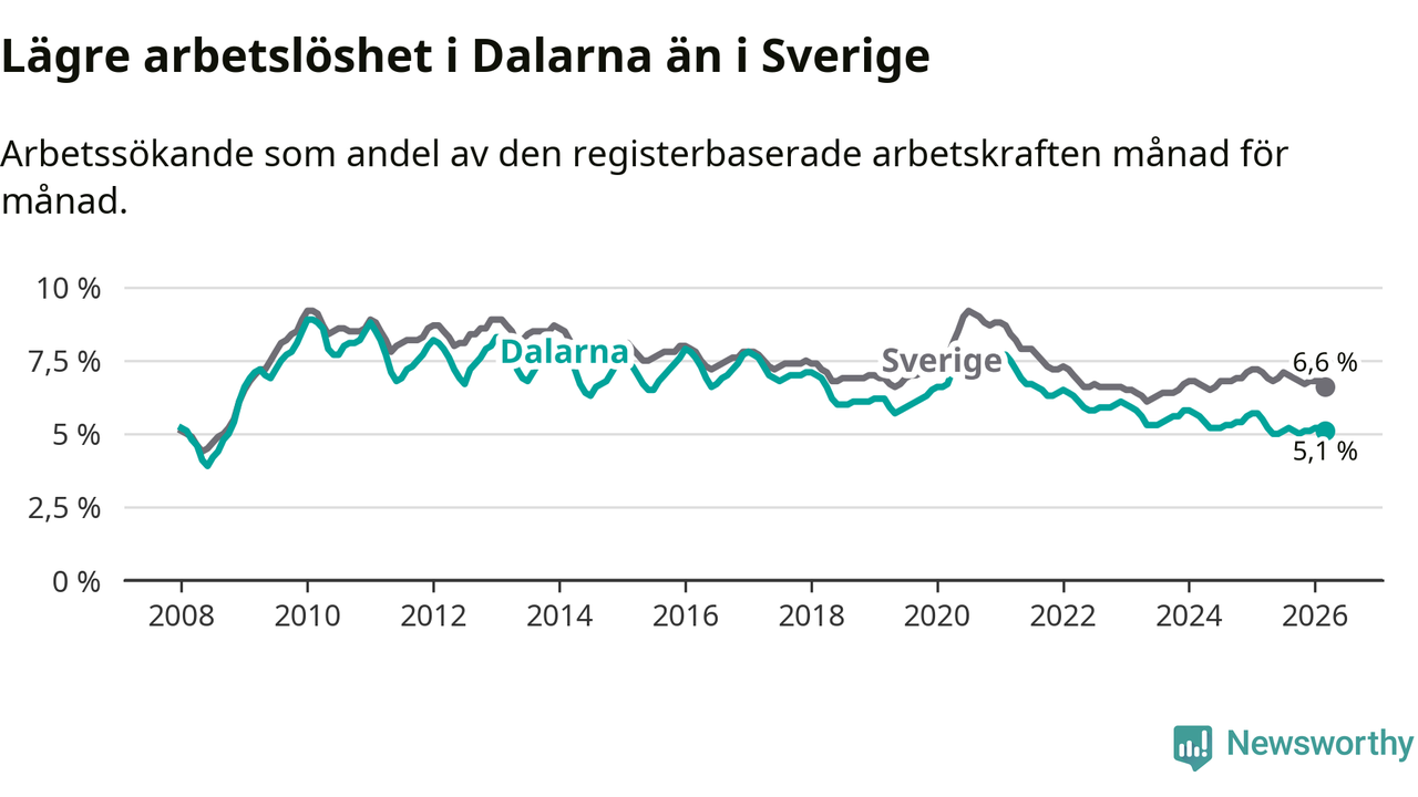 Under mars månad rapporterade Dalarnas län en total arbetslöshet på 5,1 procent. Det är en minskning jämfört med samma tidpunkt i fjol (−0,4 procentenheter). Även i Sverige sjunker arbetslösheten .