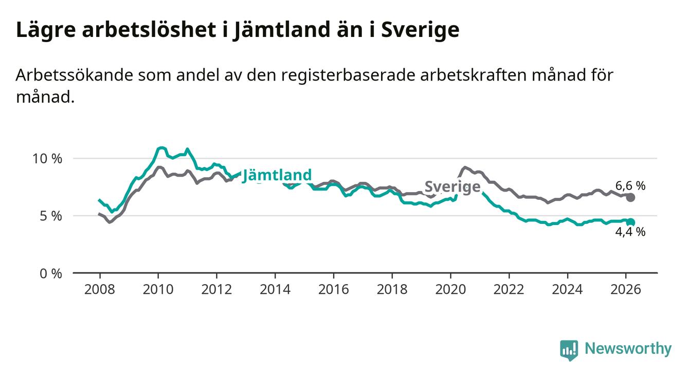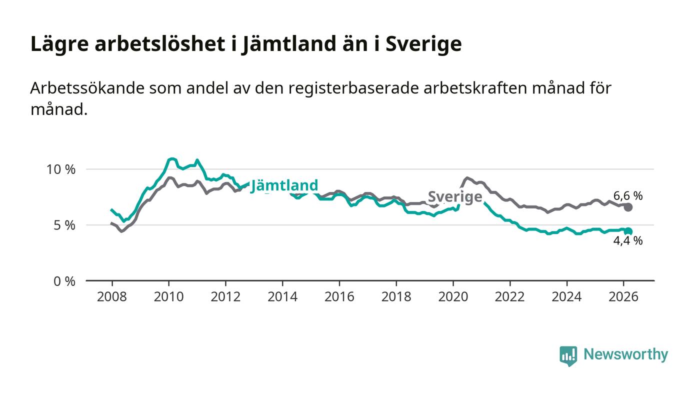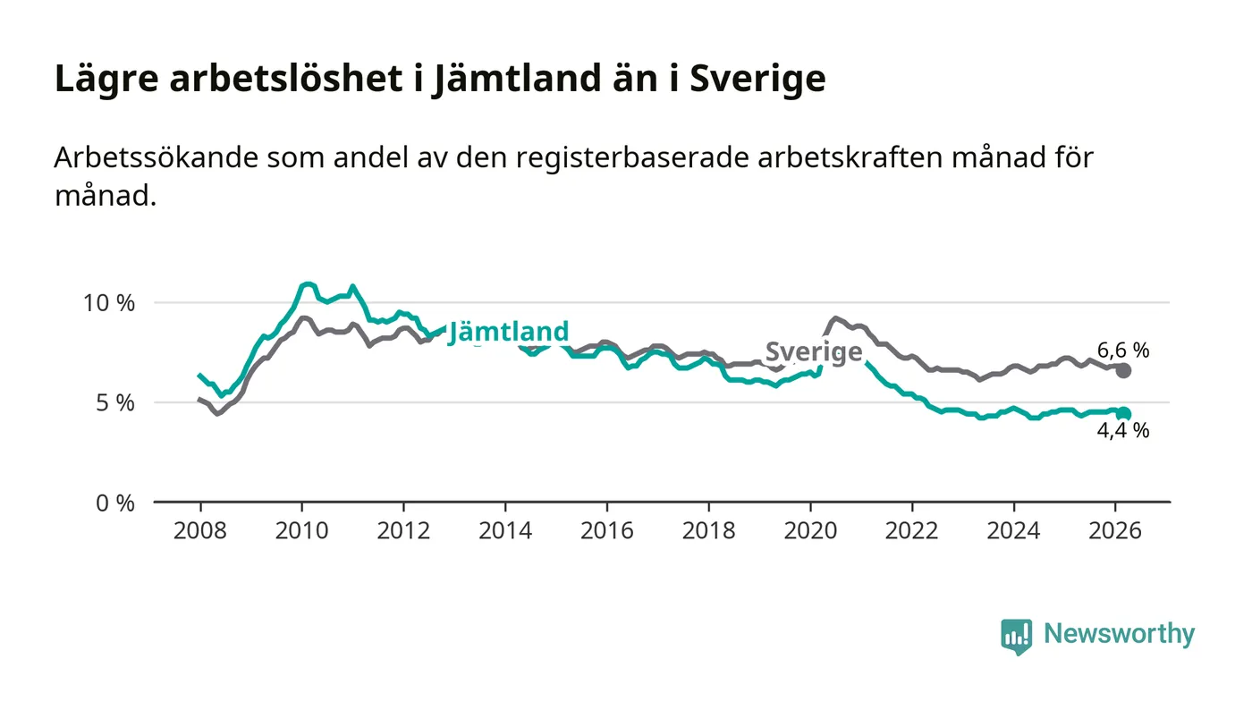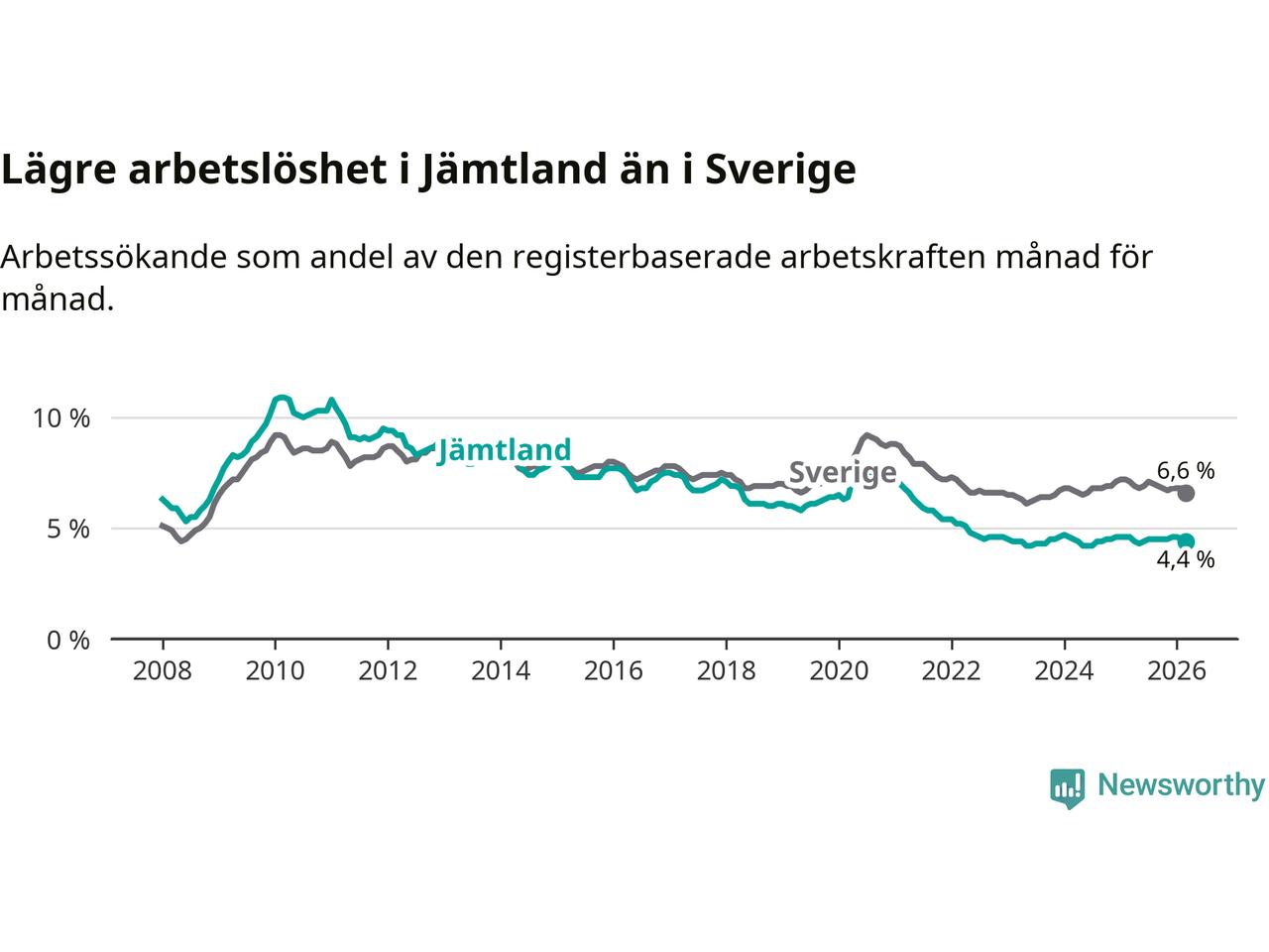 Under mars månad rapporterade Jämtlands län en total arbetslöshet på 4,4 procent. Det är en minskning jämfört med samma tidpunkt i fjol (−0,2 procentenheter). Även i Sverige sjunker arbetslösheten .