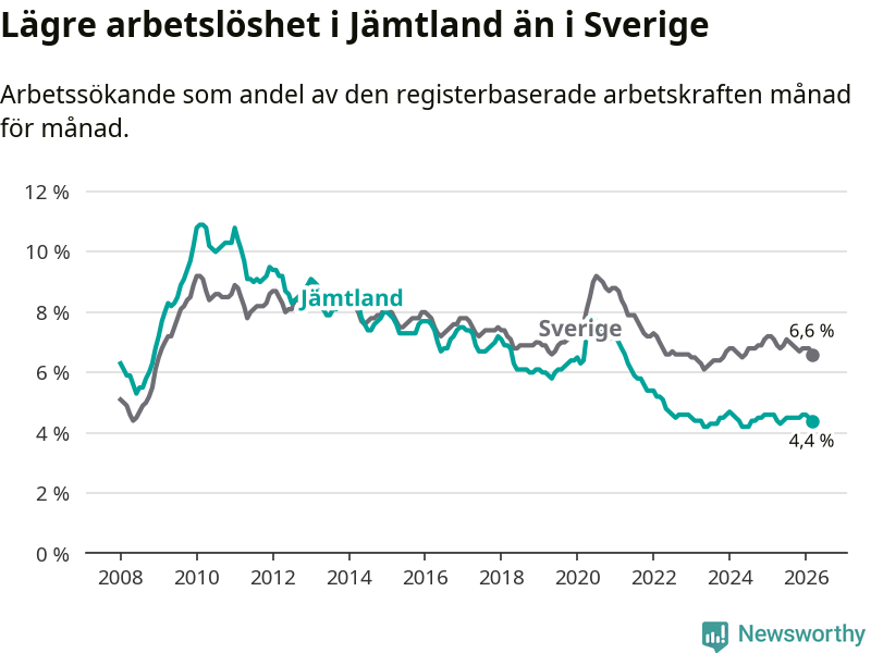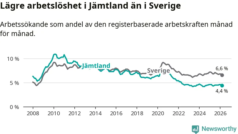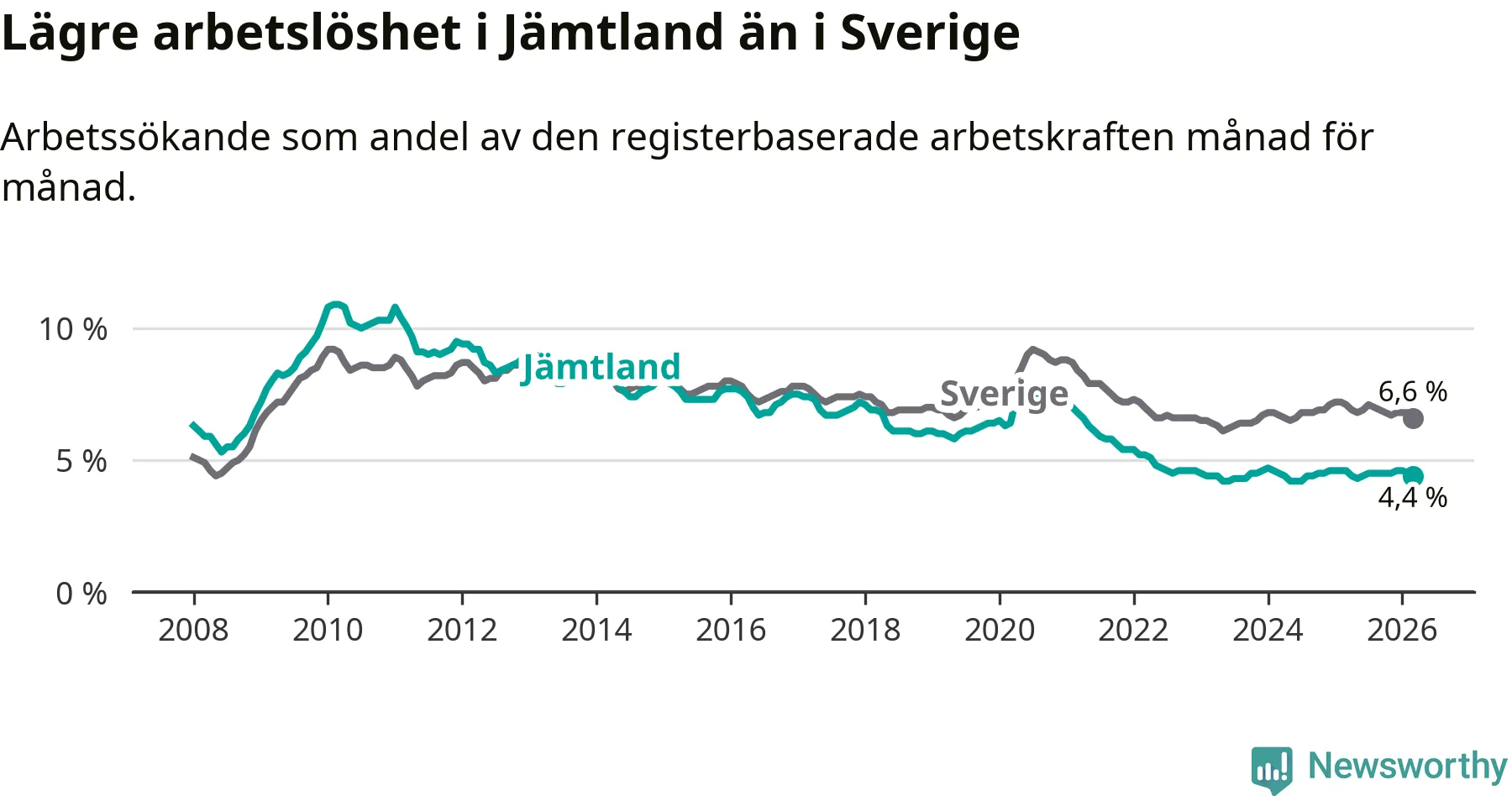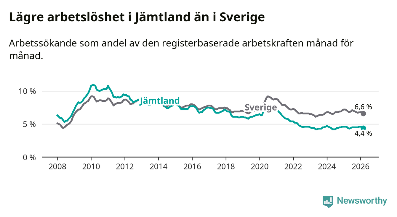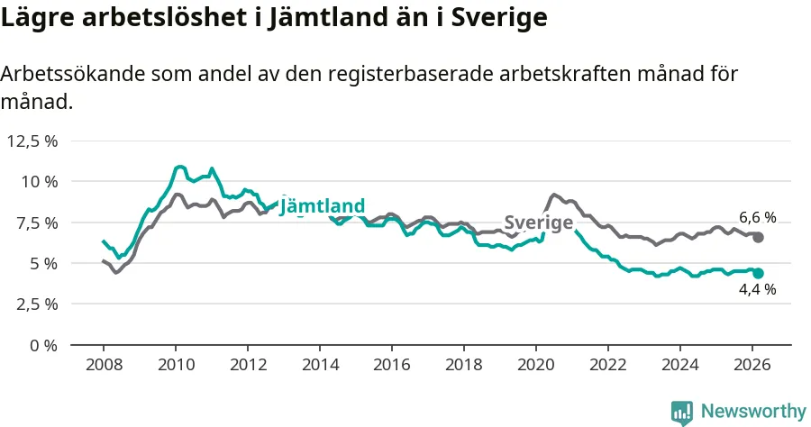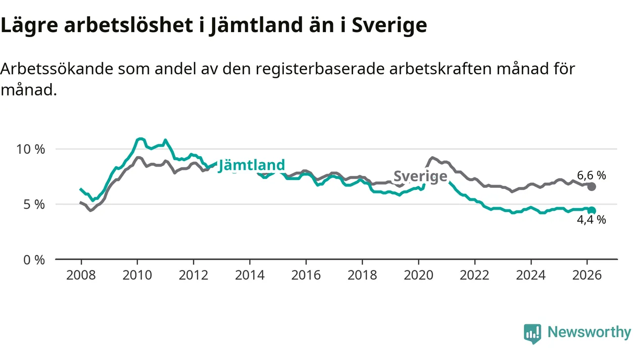 Under mars månad rapporterade Jämtlands län en total arbetslöshet på 4,4 procent. Det är en minskning jämfört med samma tidpunkt i fjol (−0,2 procentenheter). Även i Sverige sjunker arbetslösheten .