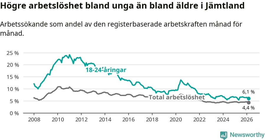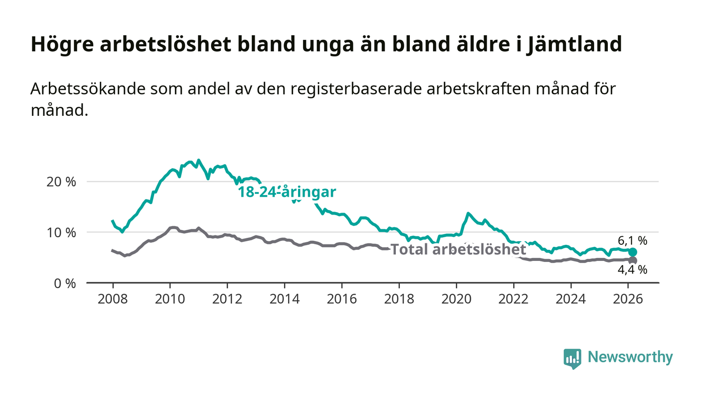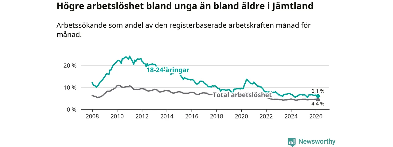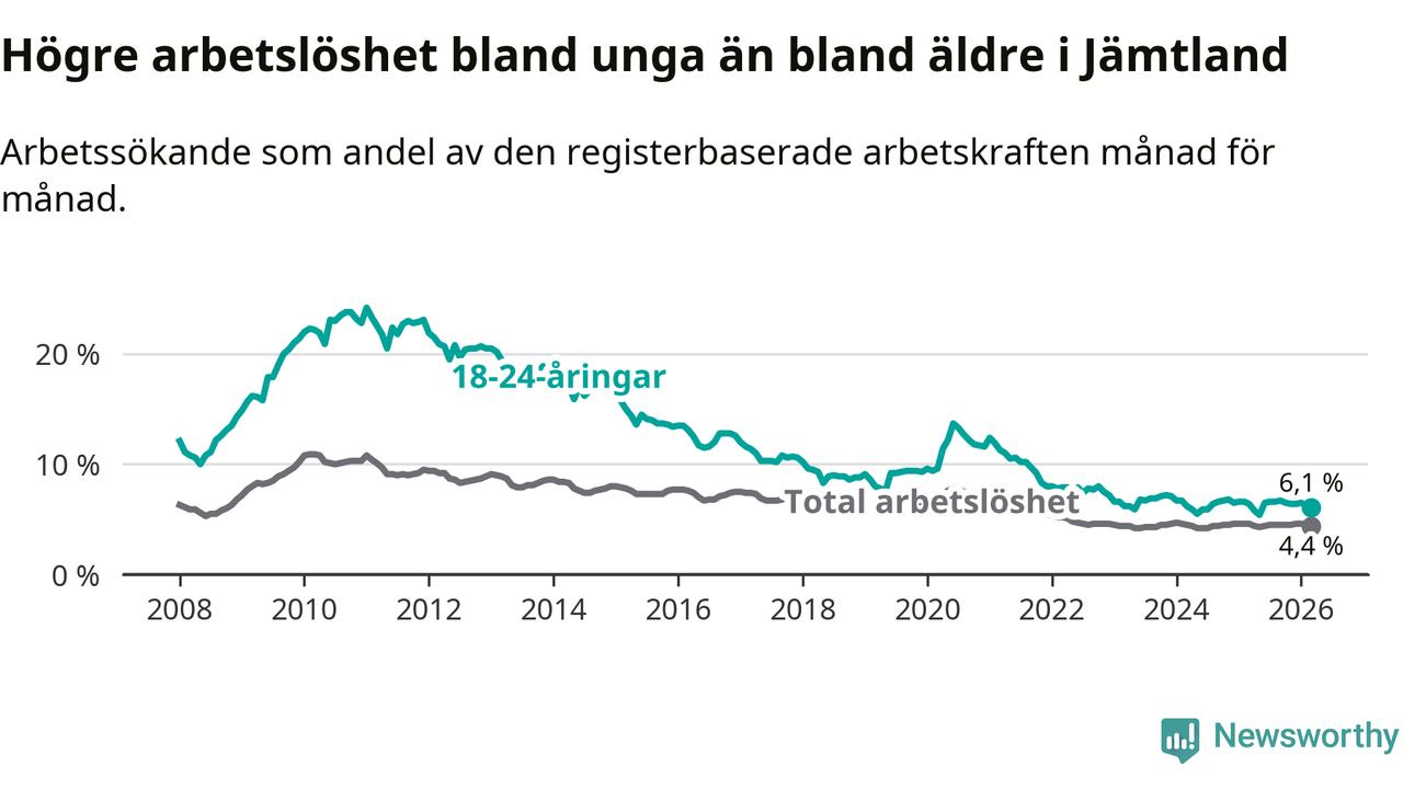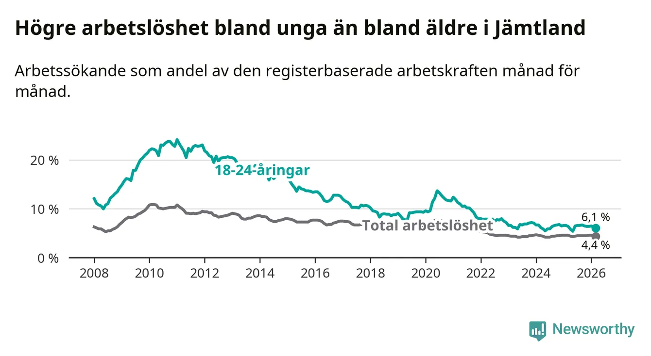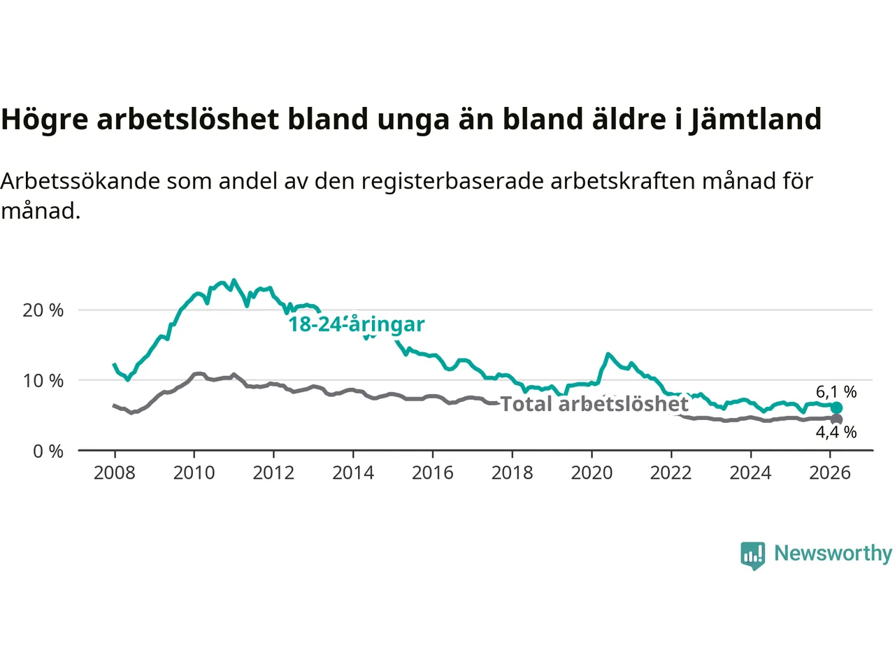 Under mars månad rapporterade Jämtlands län en total arbetslöshet på 4,4 procent. Det är en minskning jämfört med samma tidpunkt i fjol (−0,2 procentenheter). Även i Sverige sjunker arbetslösheten .