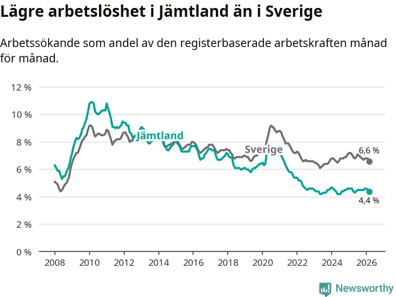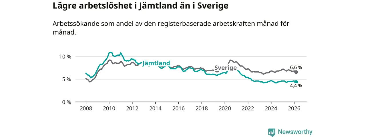 Jämtland hade redan tidigare lägre arbetslöshet än snittet i hela Sverige och nu växer klyftan (4,4 procent i länet, jämfört med 6,6 procent i hela riket). Norrbotten har den lägsta arbetslösheten i riket (3,8 procent), medan Skåne har den högsta (8,6 procent). För att Jämtland skulle komma ner i samma arbetslöshetsnivå som Norrbotten skulle 394 personer behöva sysselsättas.