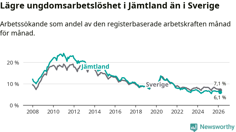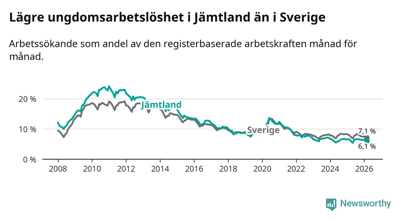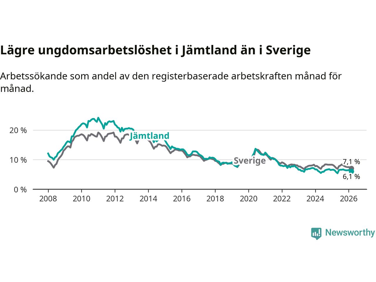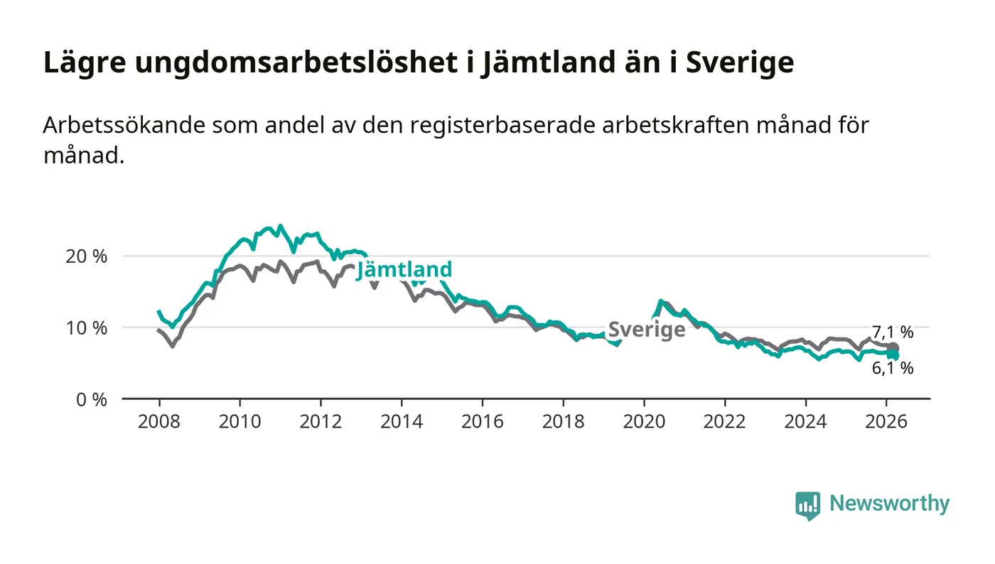 Precis som den totala arbetslösheten ligger ungdomsarbetslösheten i Jämtland lägre än i Sverige som helhet. Skillnaden mellan länet och riket är 1,0 procentenheter.