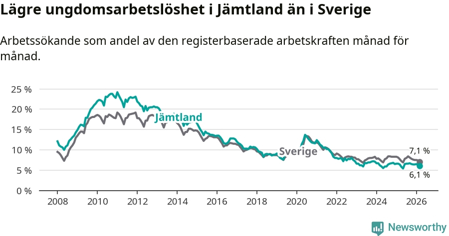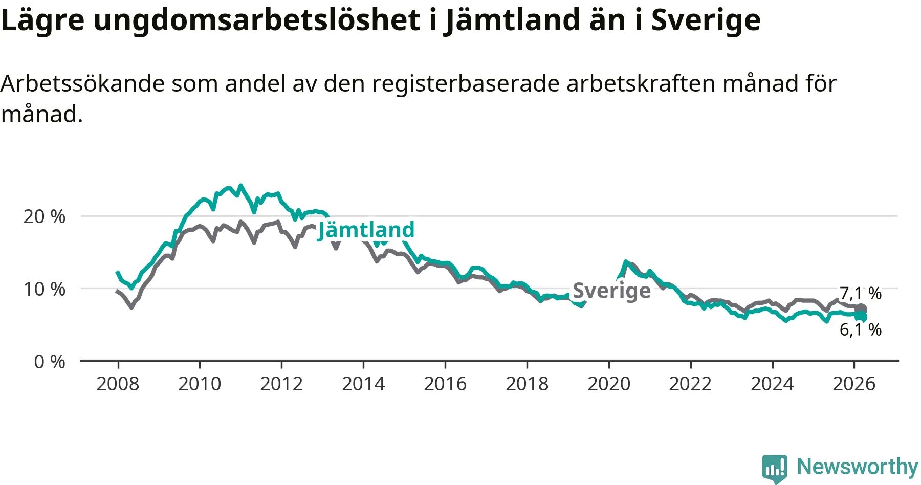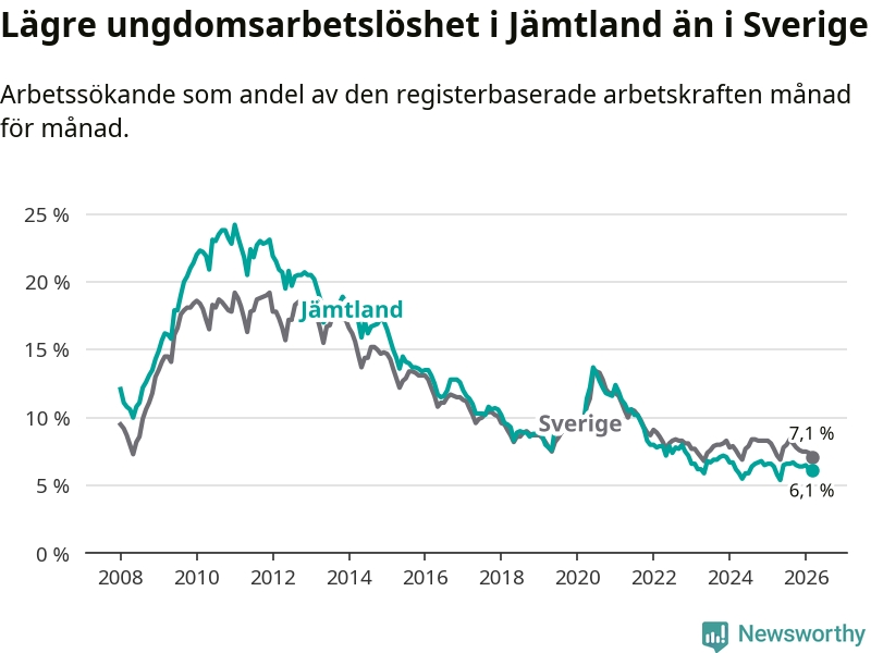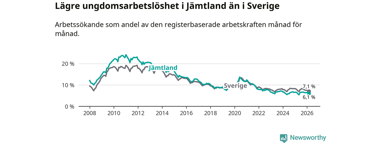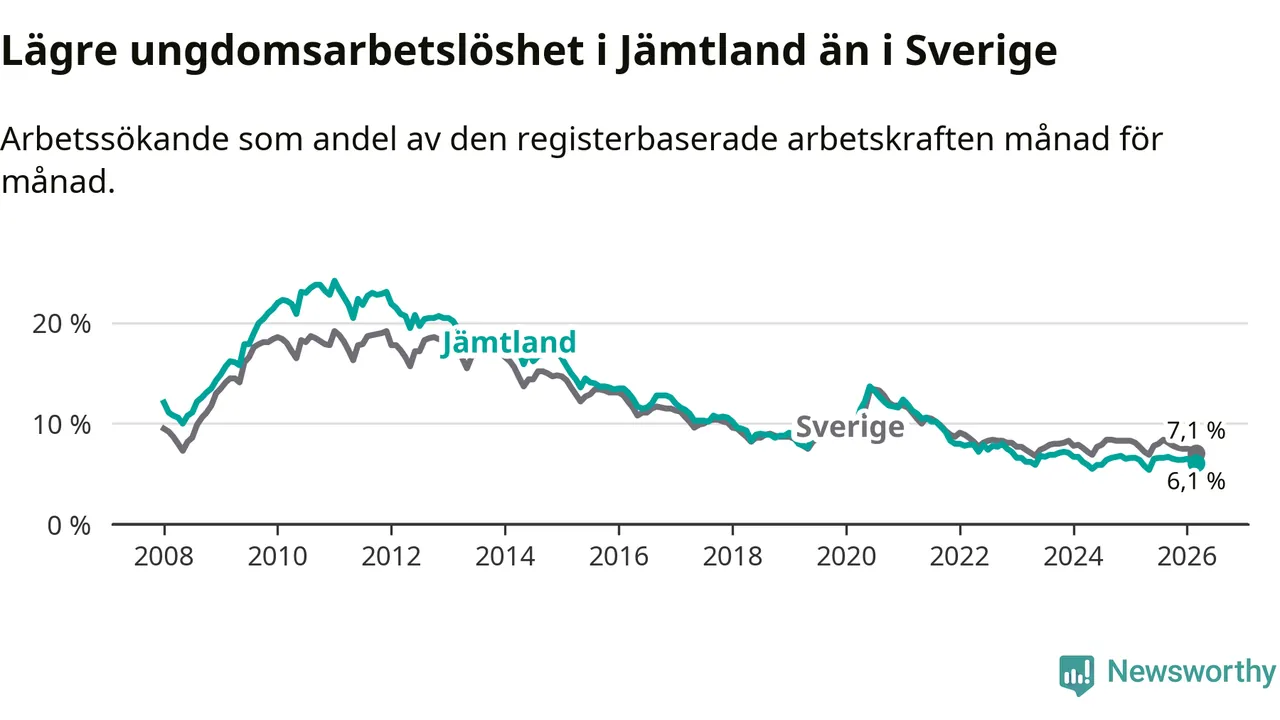 Precis som den totala arbetslösheten ligger ungdomsarbetslösheten i Jämtland lägre än i Sverige som helhet. Skillnaden mellan länet och riket är 1,0 procentenheter.