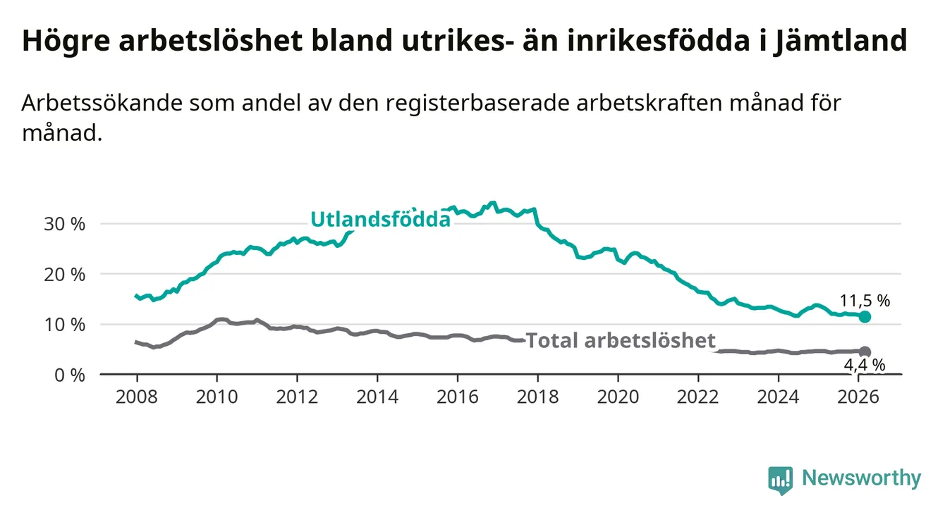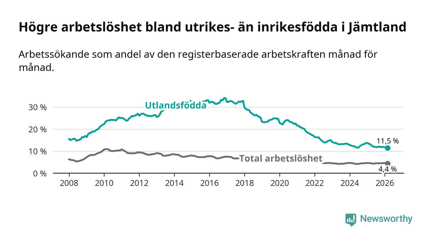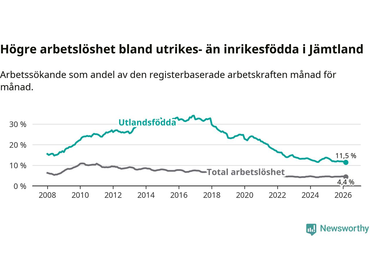 Arbetslösheten bland utlandsfödda var 11,5 procent i Jämtland under mars månad, motsvarande 982 av 8 539 personer. Det är 1,6 procentenheter färre än vid samma tidpunkt i fjol (−96 om man räknar personer). Därmed är de utlandsföddas arbetslöshet lägre än vid samma tidpunkt i fjol för åttonde månaden i följd. Den nuvarande arbetslöshetsnivån är den lägsta sedan januari 2008.