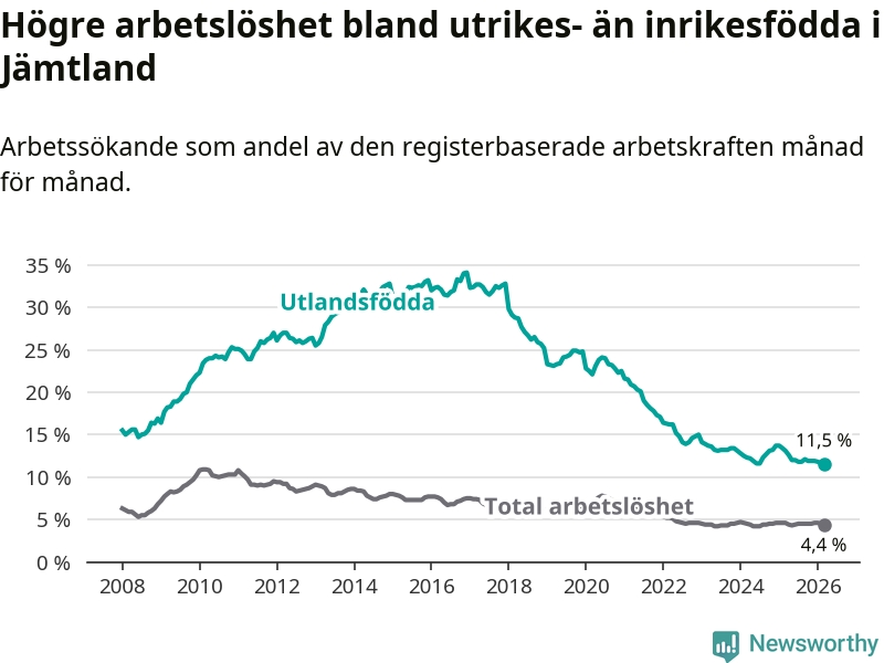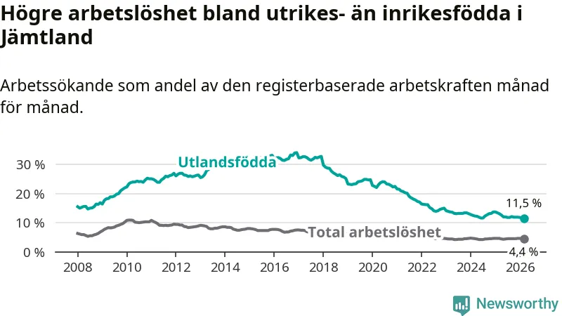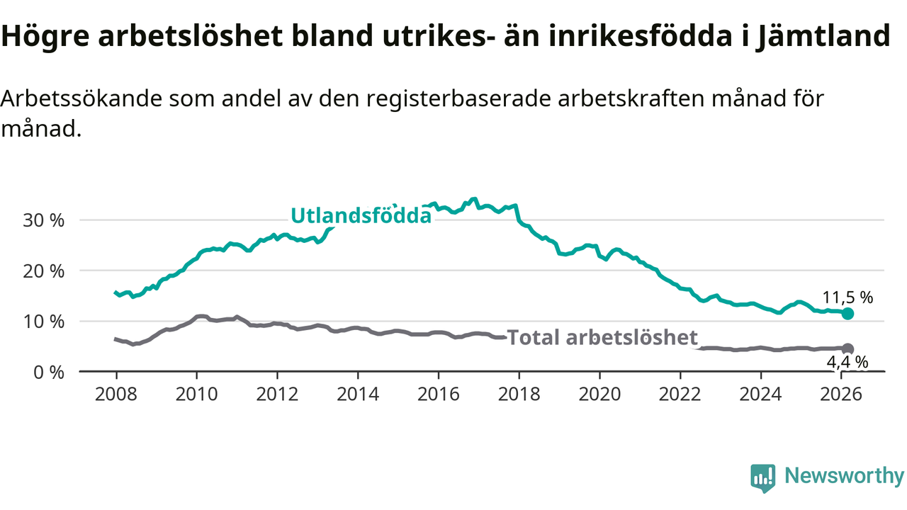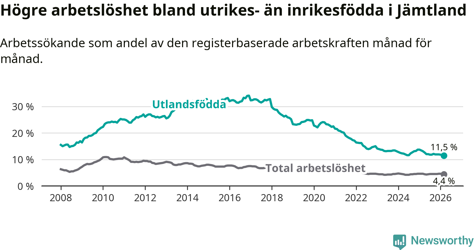 Arbetslösheten bland utlandsfödda var 11,5 procent i Jämtland under mars månad, motsvarande 982 av 8 539 personer. Det är 1,6 procentenheter färre än vid samma tidpunkt i fjol (−96 om man räknar personer). Därmed är de utlandsföddas arbetslöshet lägre än vid samma tidpunkt i fjol för åttonde månaden i följd. Den nuvarande arbetslöshetsnivån är den lägsta sedan januari 2008.