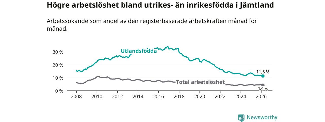 Skillnaden i arbetslöshet mellan utrikesfödda och hela befolkningen är 7,1 procentenheter i Jämtland. Det är en mindre skillnad än för ett år sedan (−1,4 procentenheter).
