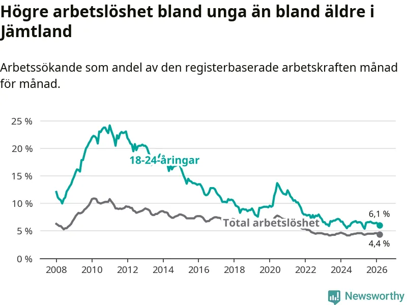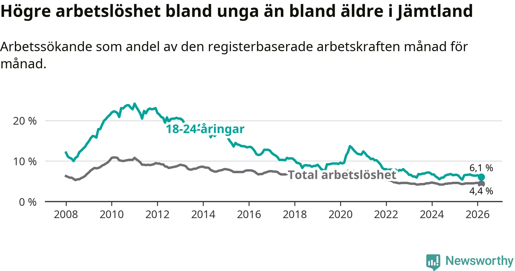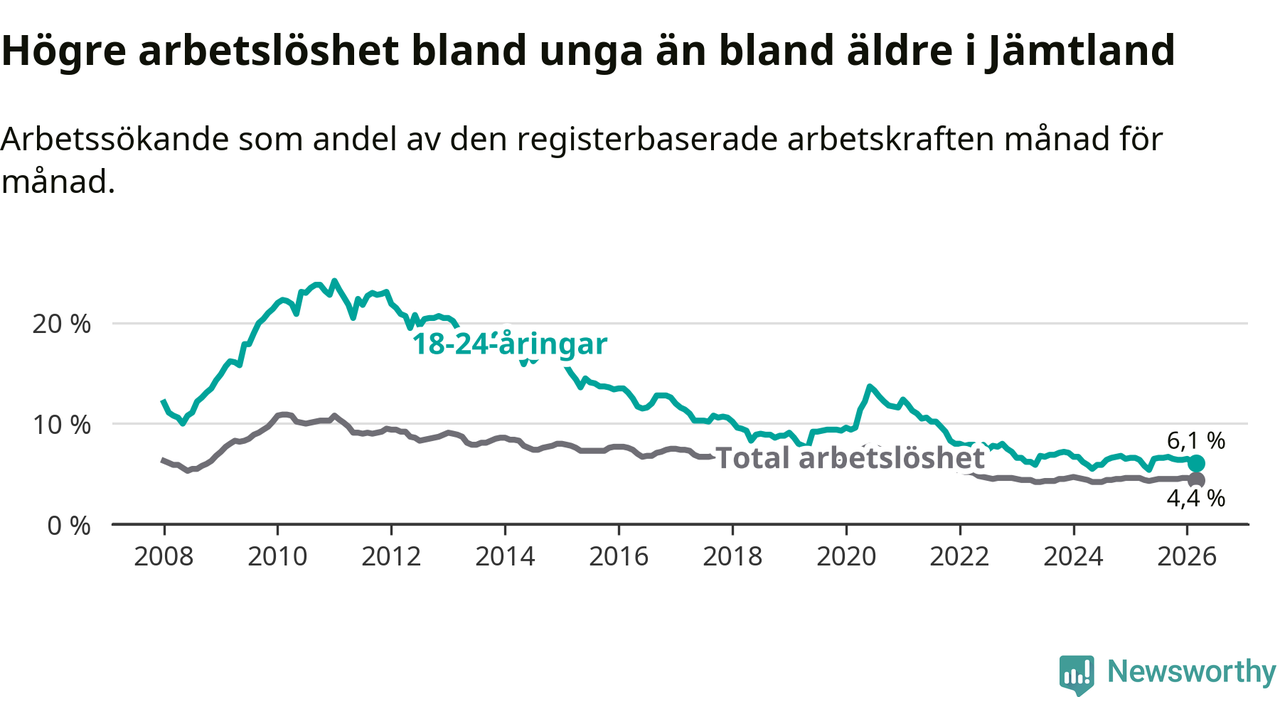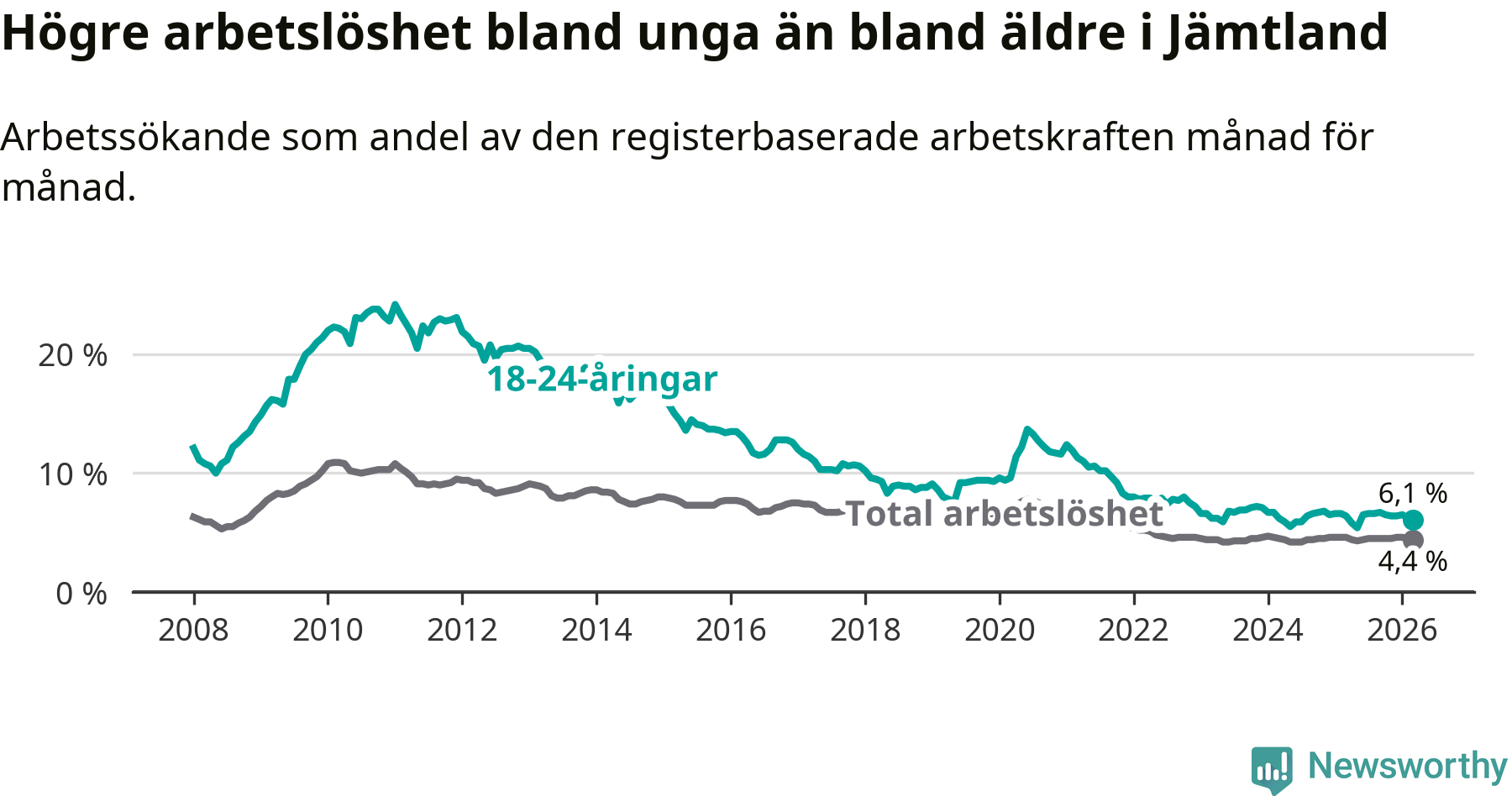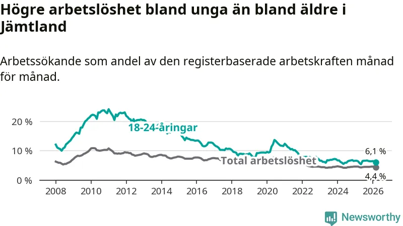 Precis som den totala arbetslösheten sjunker arbetslösheten bland unga (−0,3 procentenheter). I mars var 6,1 procent av 18–24-åringarna inskrivna som arbetssökande (motsvarande 411 personer). Mäter vi antalet inskrivna ser vi en minskning med elva personer på ett års sikt.