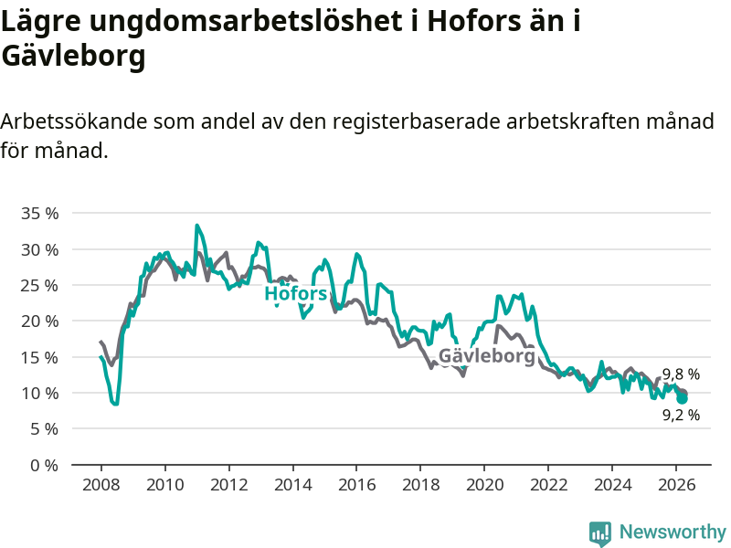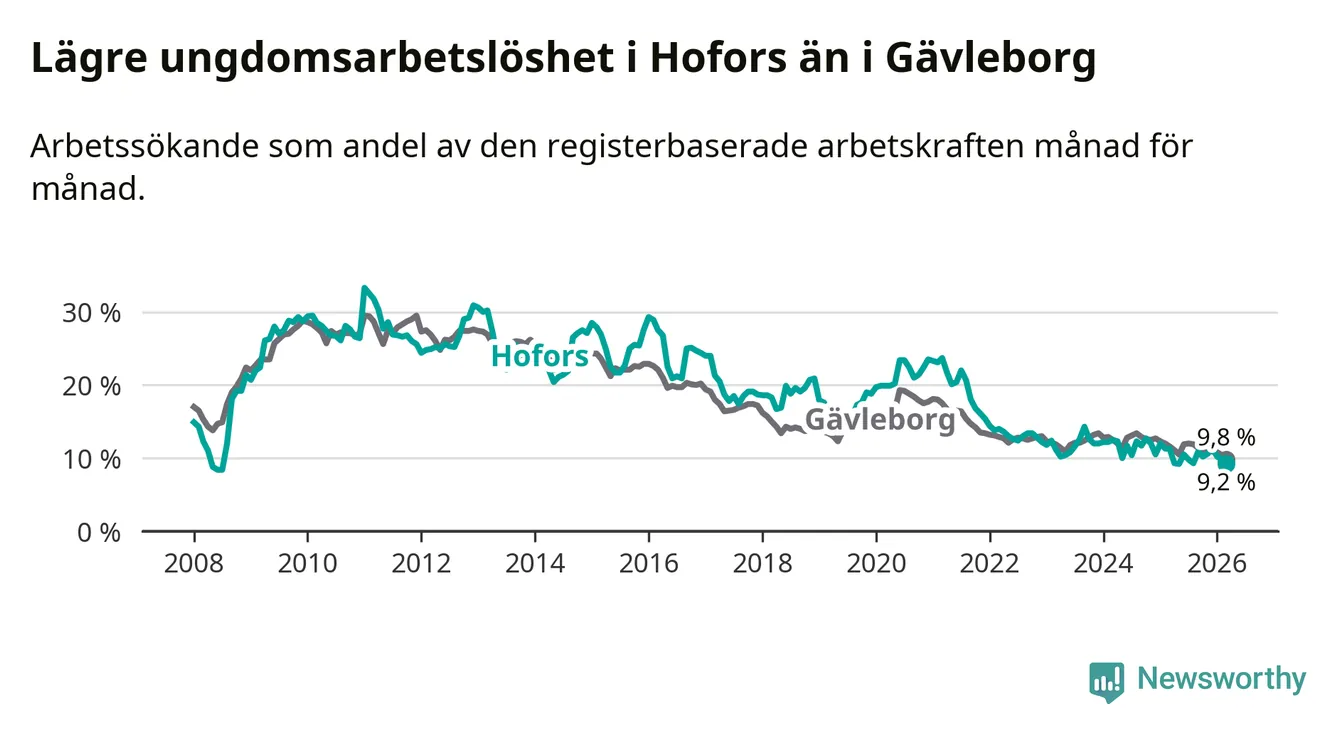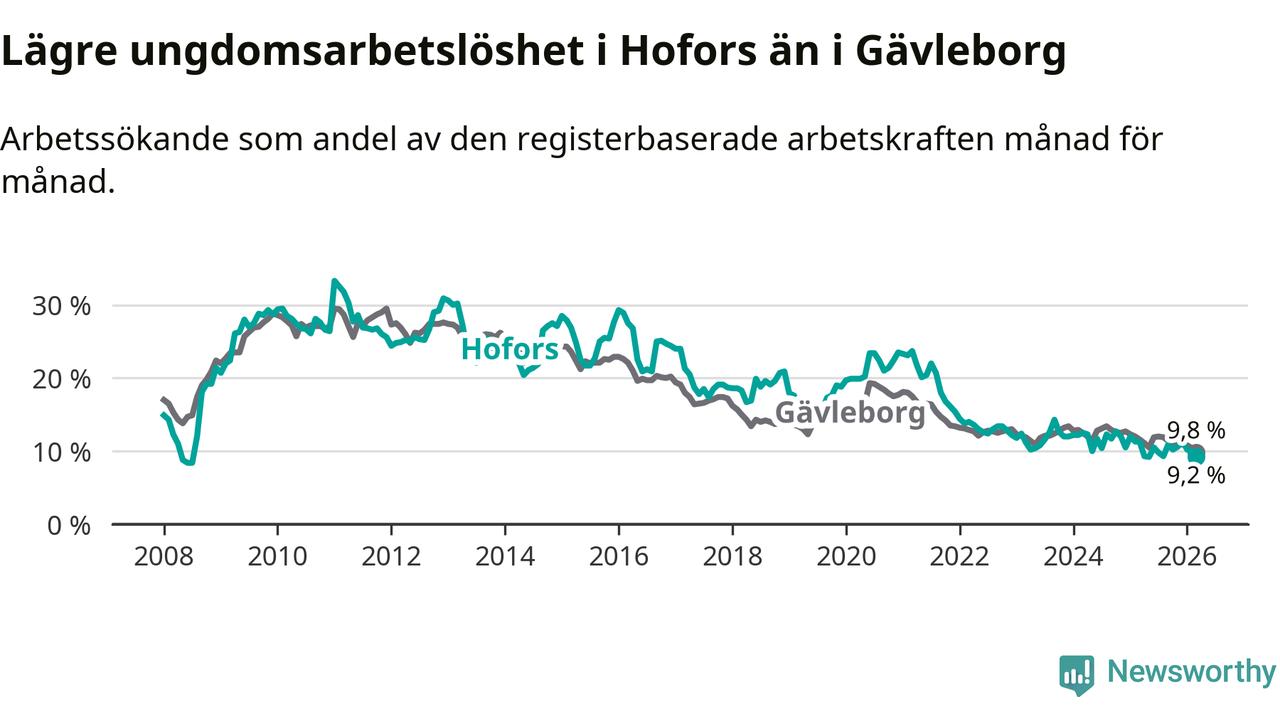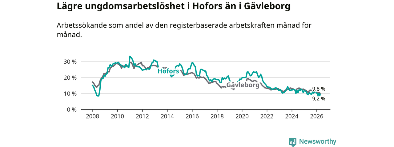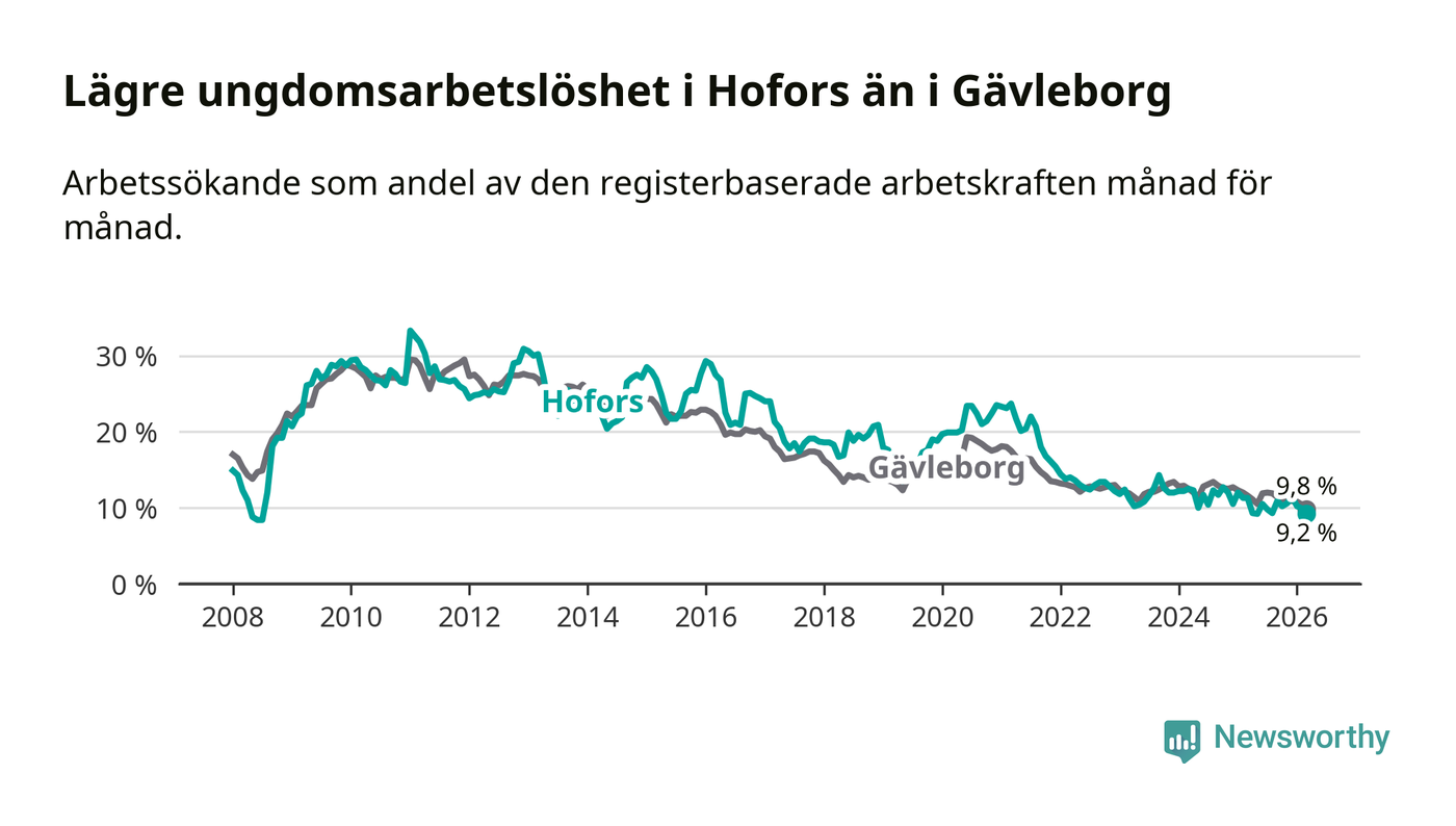 Precis som den totala arbetslösheten ligger ungdomsarbetslösheten i Hofors lägre än i Gävleborg som helhet. Skillnaden mellan kommunen och länet är 0,6 procentenheter.