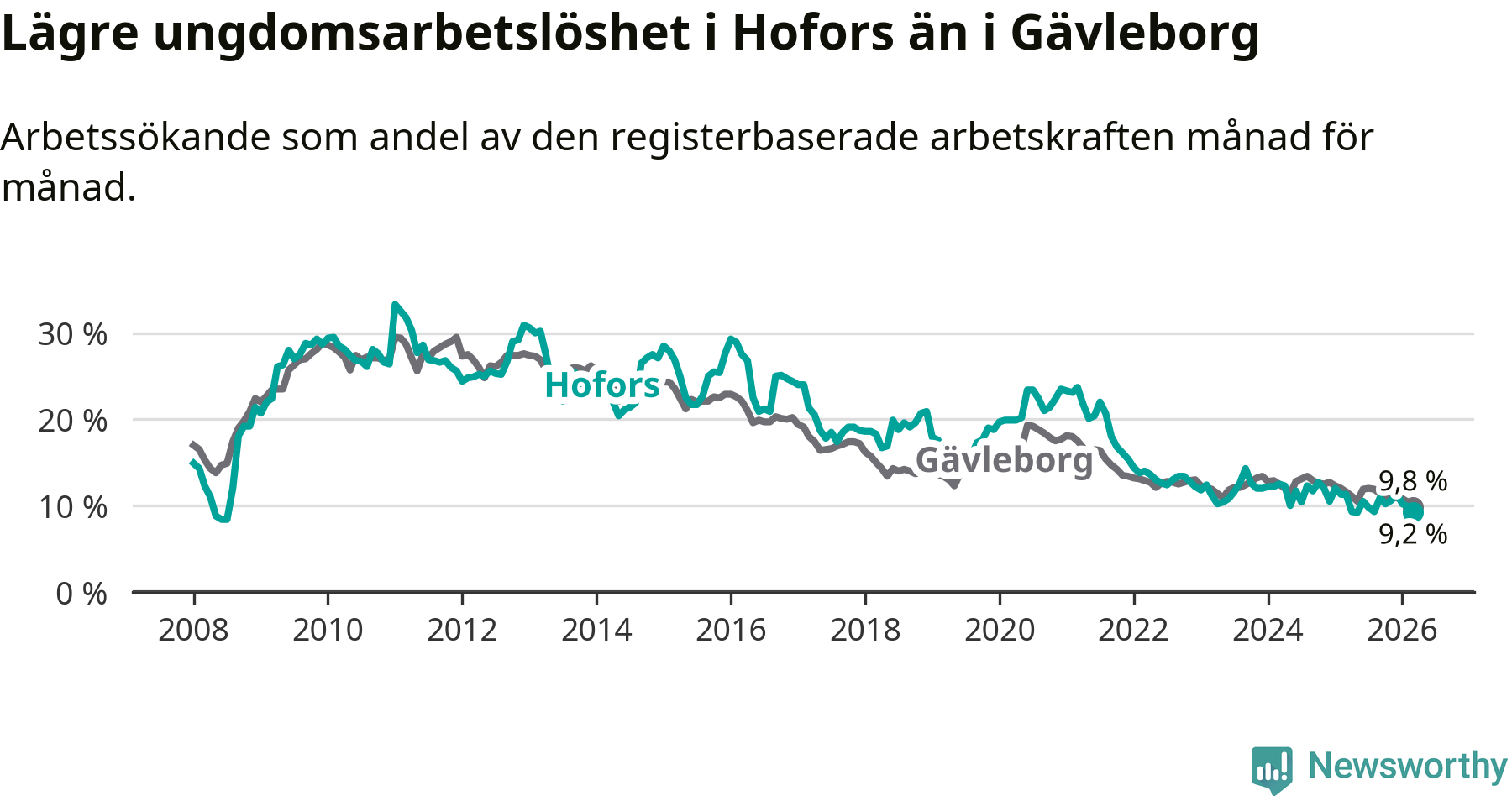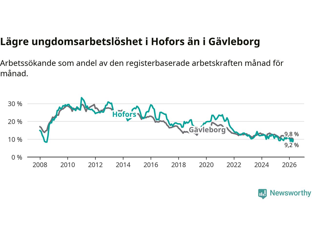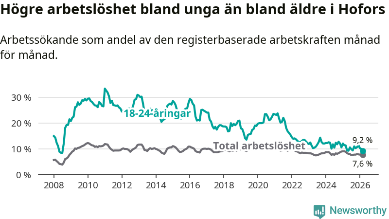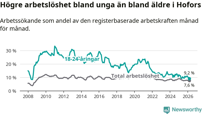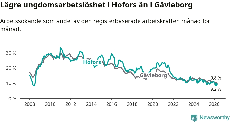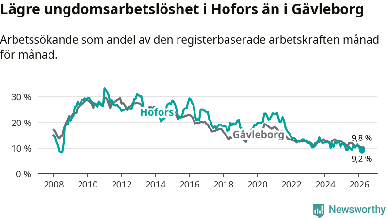 Precis som den totala arbetslösheten ligger ungdomsarbetslösheten i Hofors lägre än i Gävleborg som helhet. Skillnaden mellan kommunen och länet är 0,6 procentenheter.