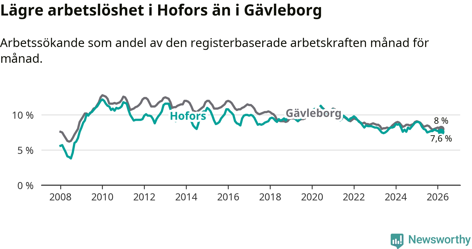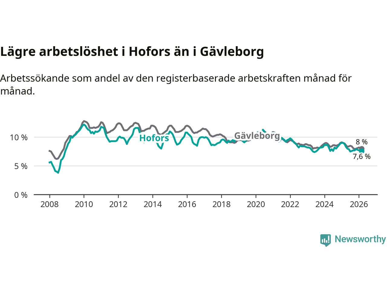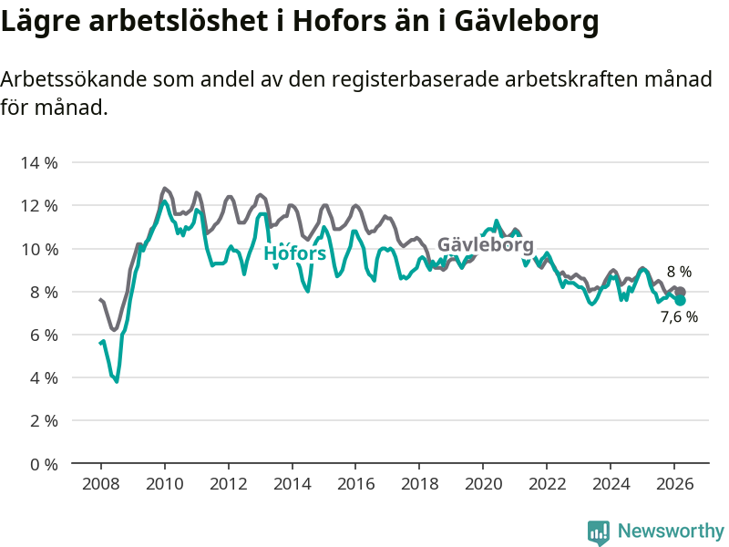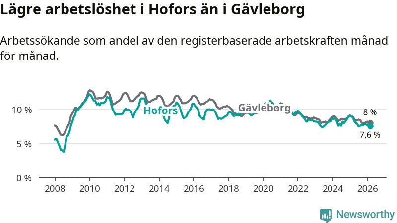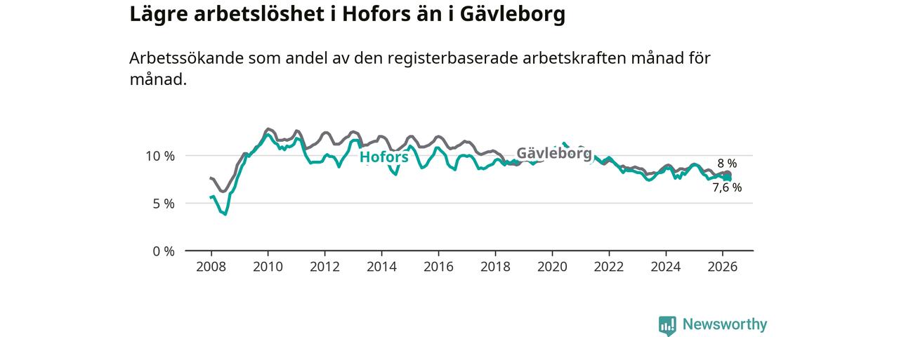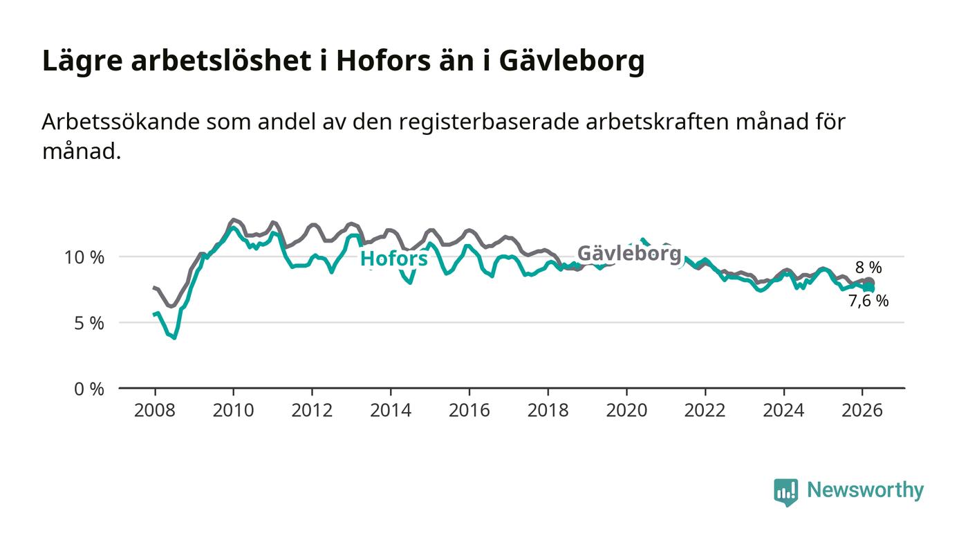 Hofors hade redan tidigare lägre arbetslöshet än snittet i hela Gävleborgs län och nu växer klyftan (7,6 procent i kommunen, jämfört med 8,0 procent i hela länet). Hudiksvall har den lägsta arbetslösheten i länet (5,8 procent), medan Söderhamn har den högsta (9,0 procent). För att Hofors skulle komma ner i samma arbetslöshetsnivå som Hudiksvall skulle 78 personer behöva sysselsättas.