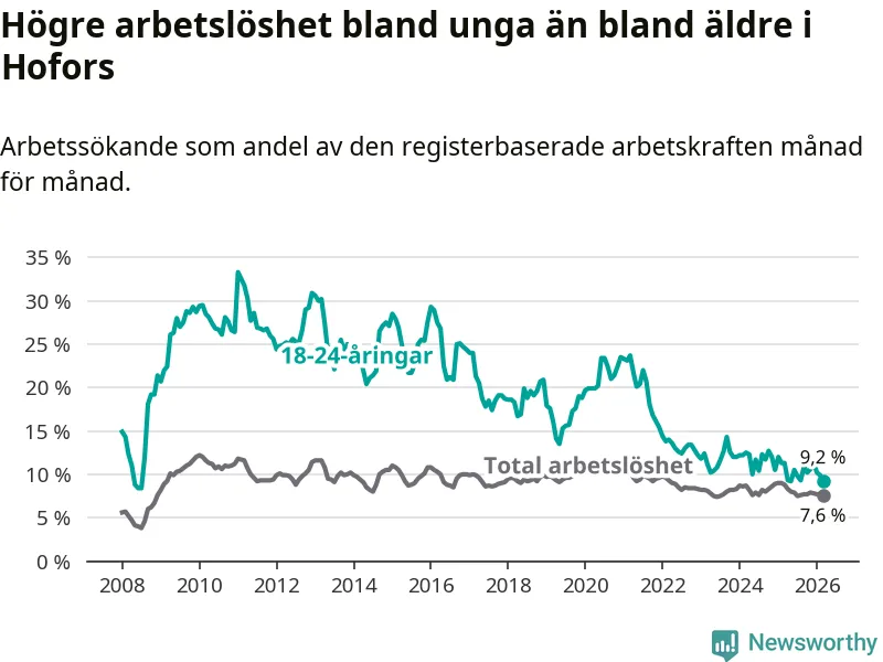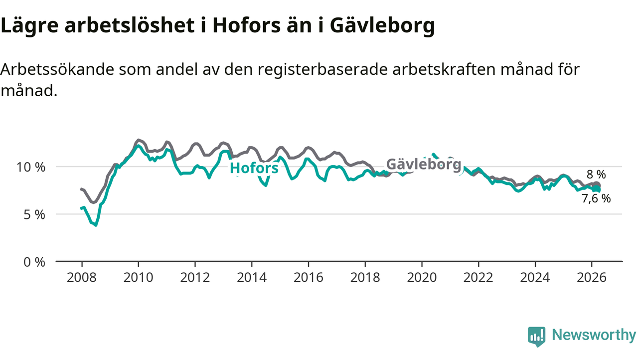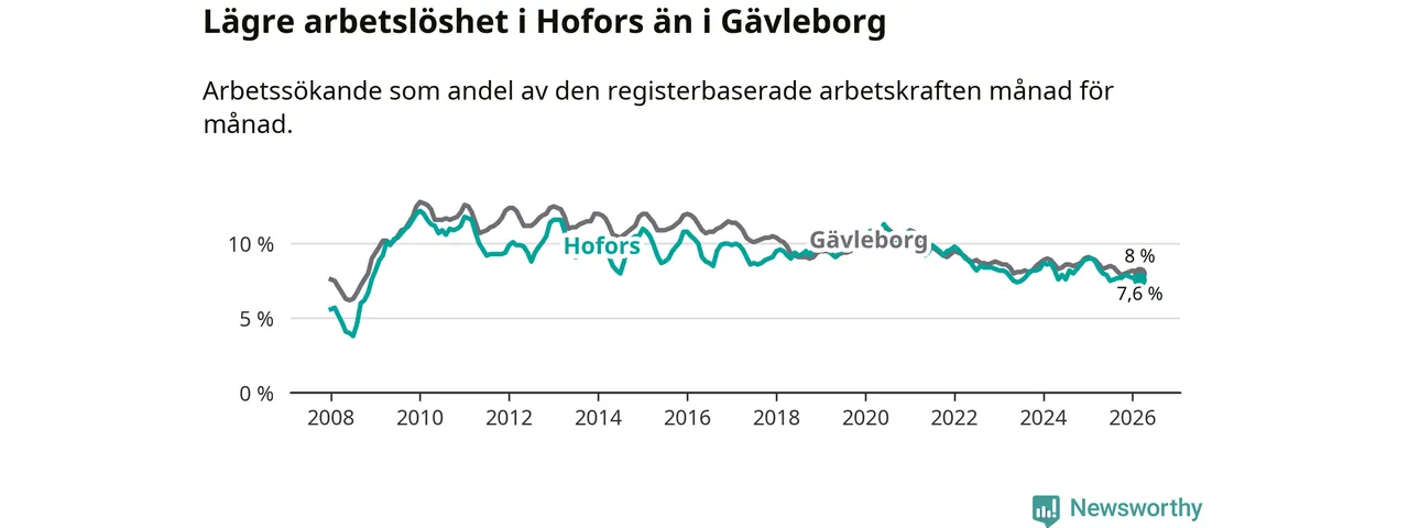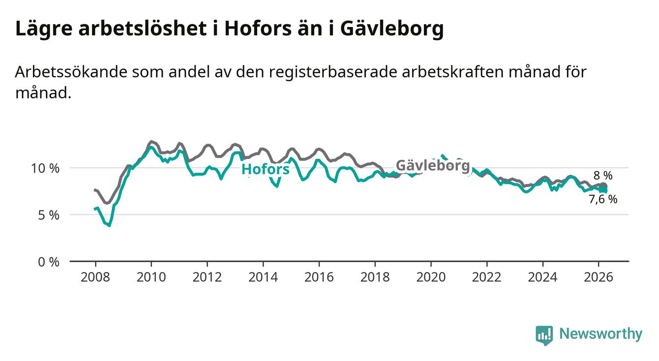 Under mars månad rapporterade Hofors kommun en total arbetslöshet på 7,6 procent. Det är en minskning jämfört med samma tidpunkt i fjol (−1,2 procentenheter). Även i Gävleborgs län sjunker arbetslösheten .