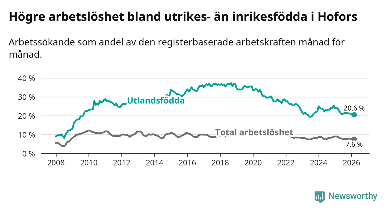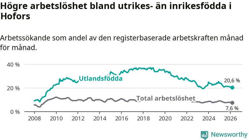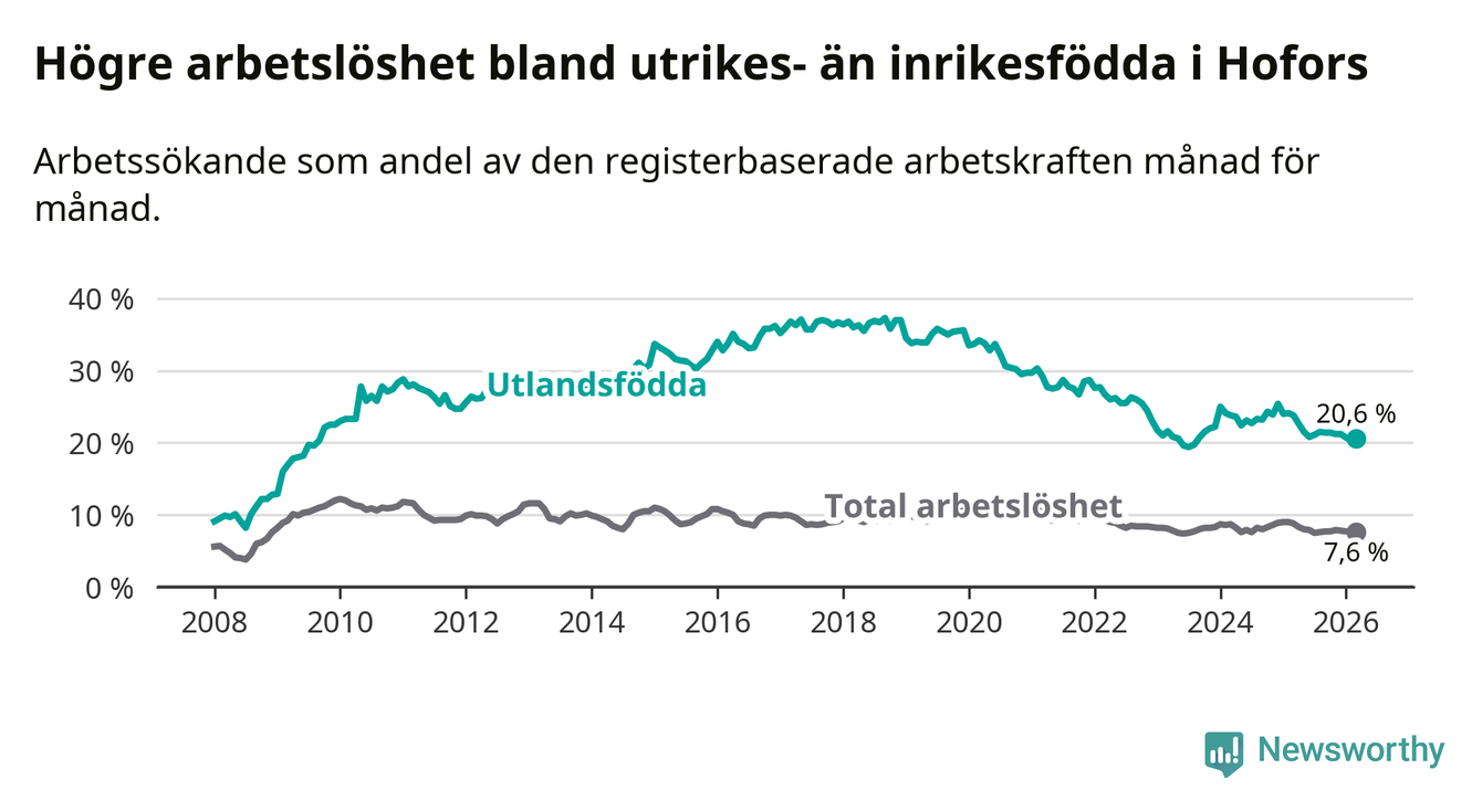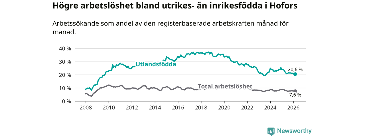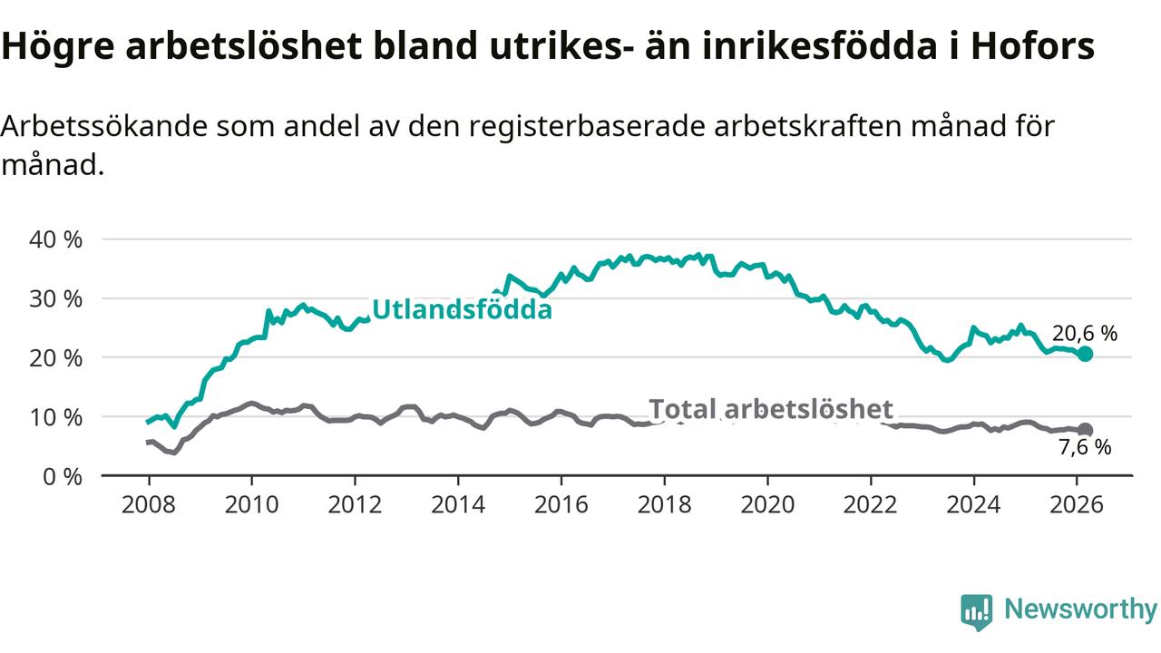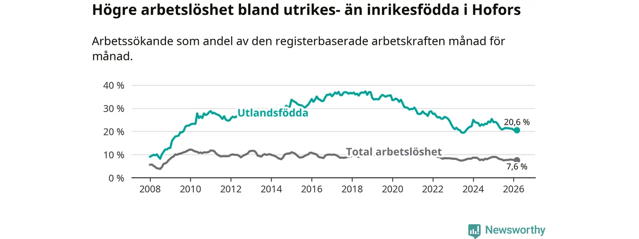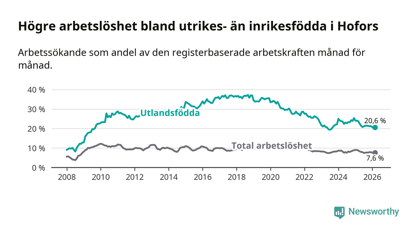 Arbetslösheten bland utlandsfödda var 20,6 procent i Hofors under mars månad, motsvarande 133 av 646 personer. Det är 3,2 procentenheter färre än vid samma tidpunkt i fjol (−25 om man räknar personer). Därmed är de utlandsföddas arbetslöshet lägre än vid samma tidpunkt i fjol för tolfte månaden i följd. Sedan mars 2025 har arbetslösheten bland utlandsfödda minskat från 23,8 till 20,6 procent.