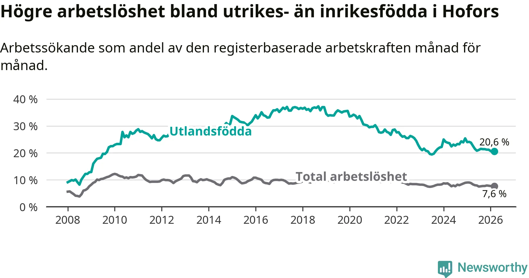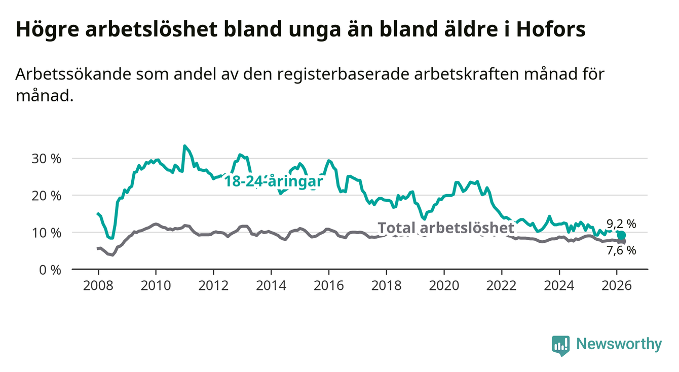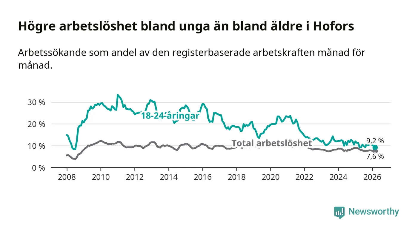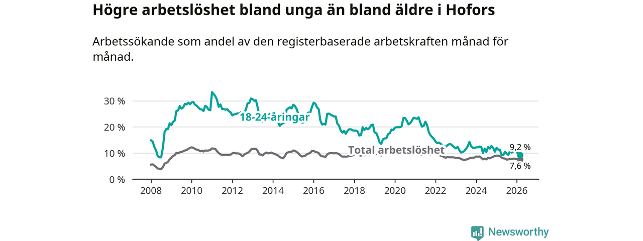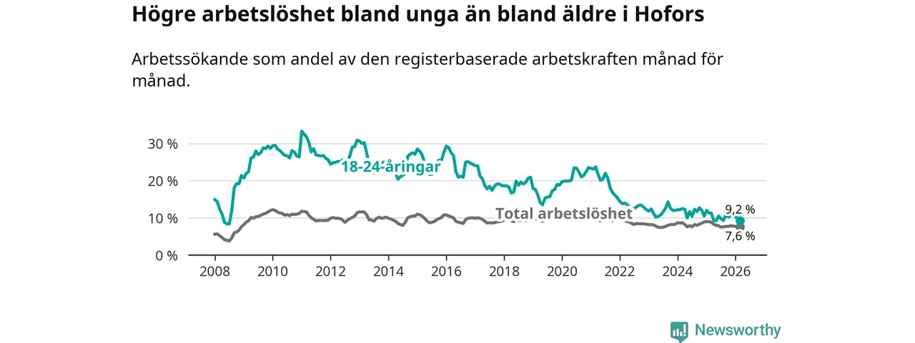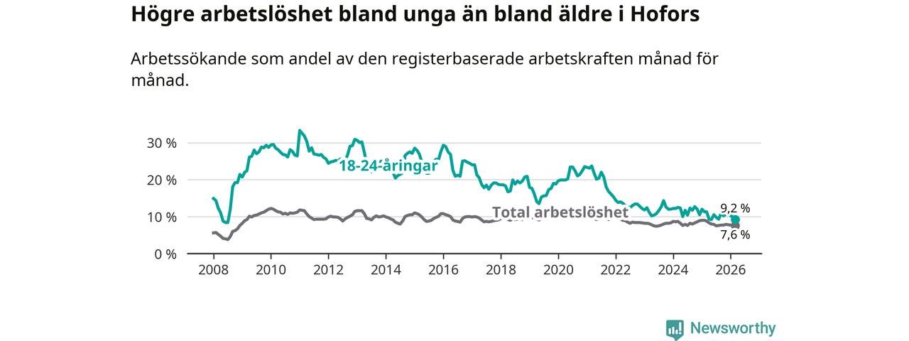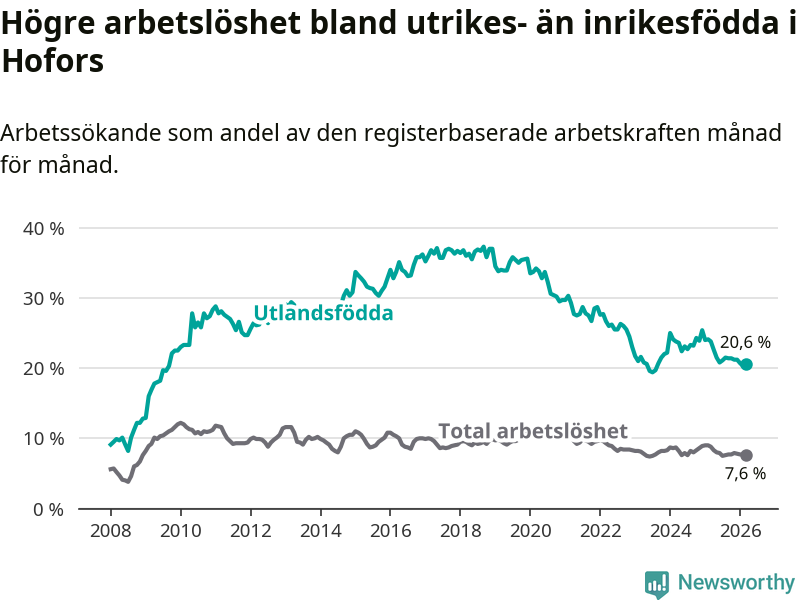 Arbetslösheten bland utlandsfödda var 20,6 procent i Hofors under mars månad, motsvarande 133 av 646 personer. Det är 3,2 procentenheter färre än vid samma tidpunkt i fjol (−25 om man räknar personer). Därmed är de utlandsföddas arbetslöshet lägre än vid samma tidpunkt i fjol för tolfte månaden i följd. Sedan mars 2025 har arbetslösheten bland utlandsfödda minskat från 23,8 till 20,6 procent.