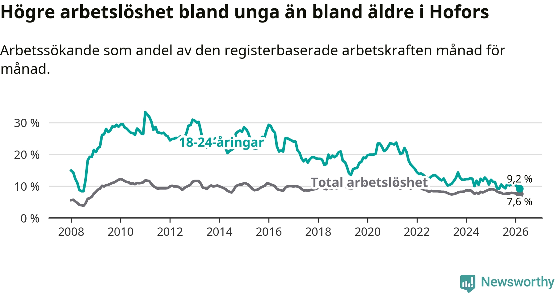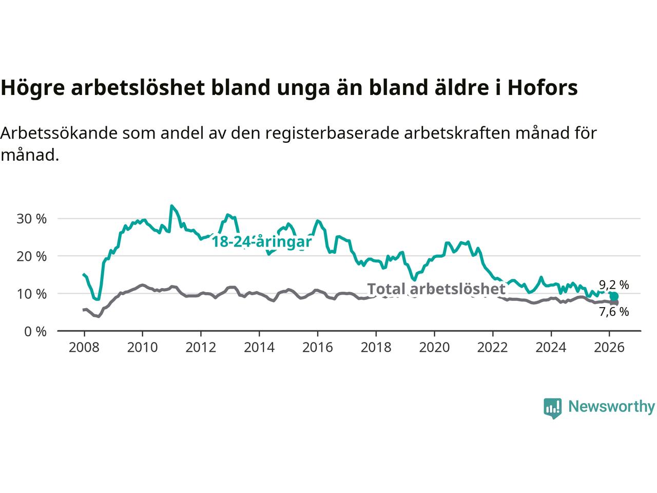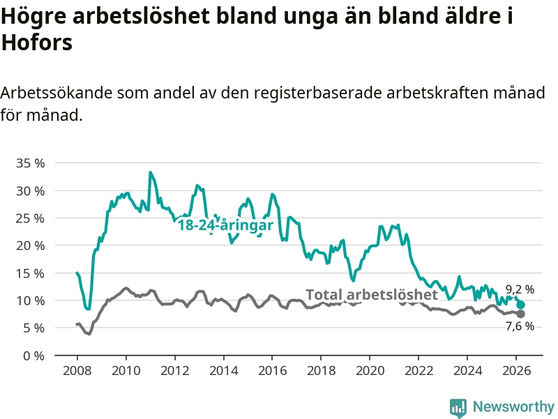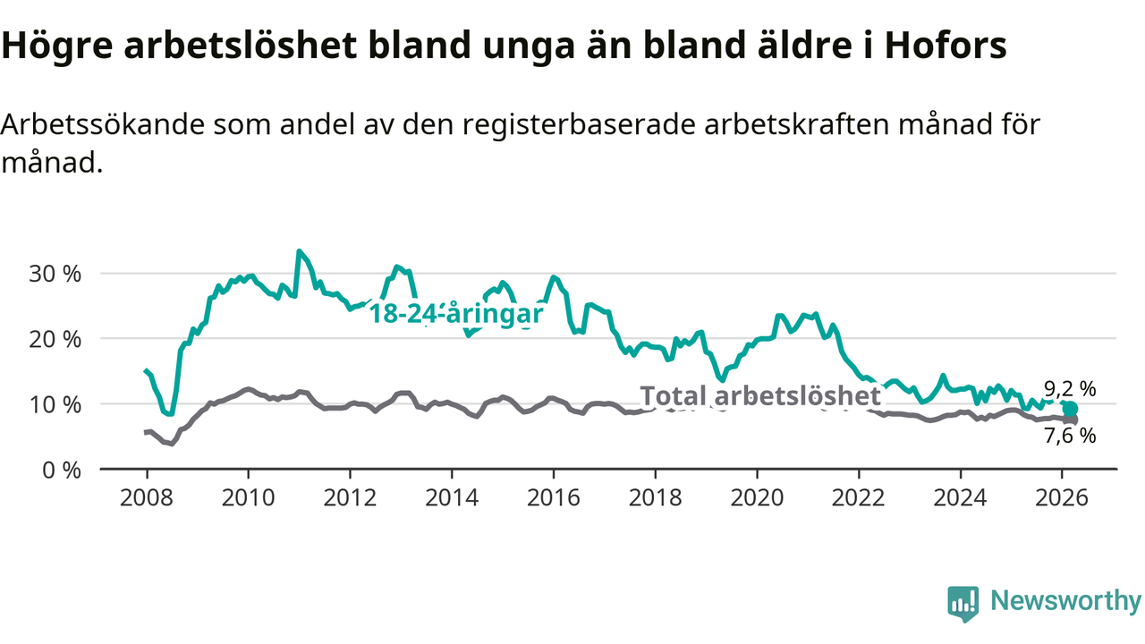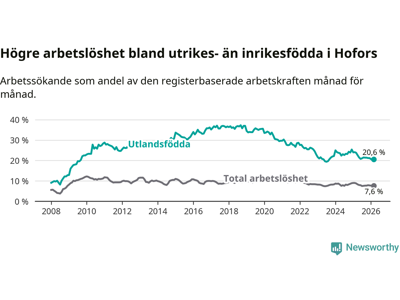 Arbetslösheten bland utlandsfödda var 20,6 procent i Hofors under mars månad, motsvarande 133 av 646 personer. Det är 3,2 procentenheter färre än vid samma tidpunkt i fjol (−25 om man räknar personer). Därmed är de utlandsföddas arbetslöshet lägre än vid samma tidpunkt i fjol för tolfte månaden i följd. Sedan mars 2025 har arbetslösheten bland utlandsfödda minskat från 23,8 till 20,6 procent.