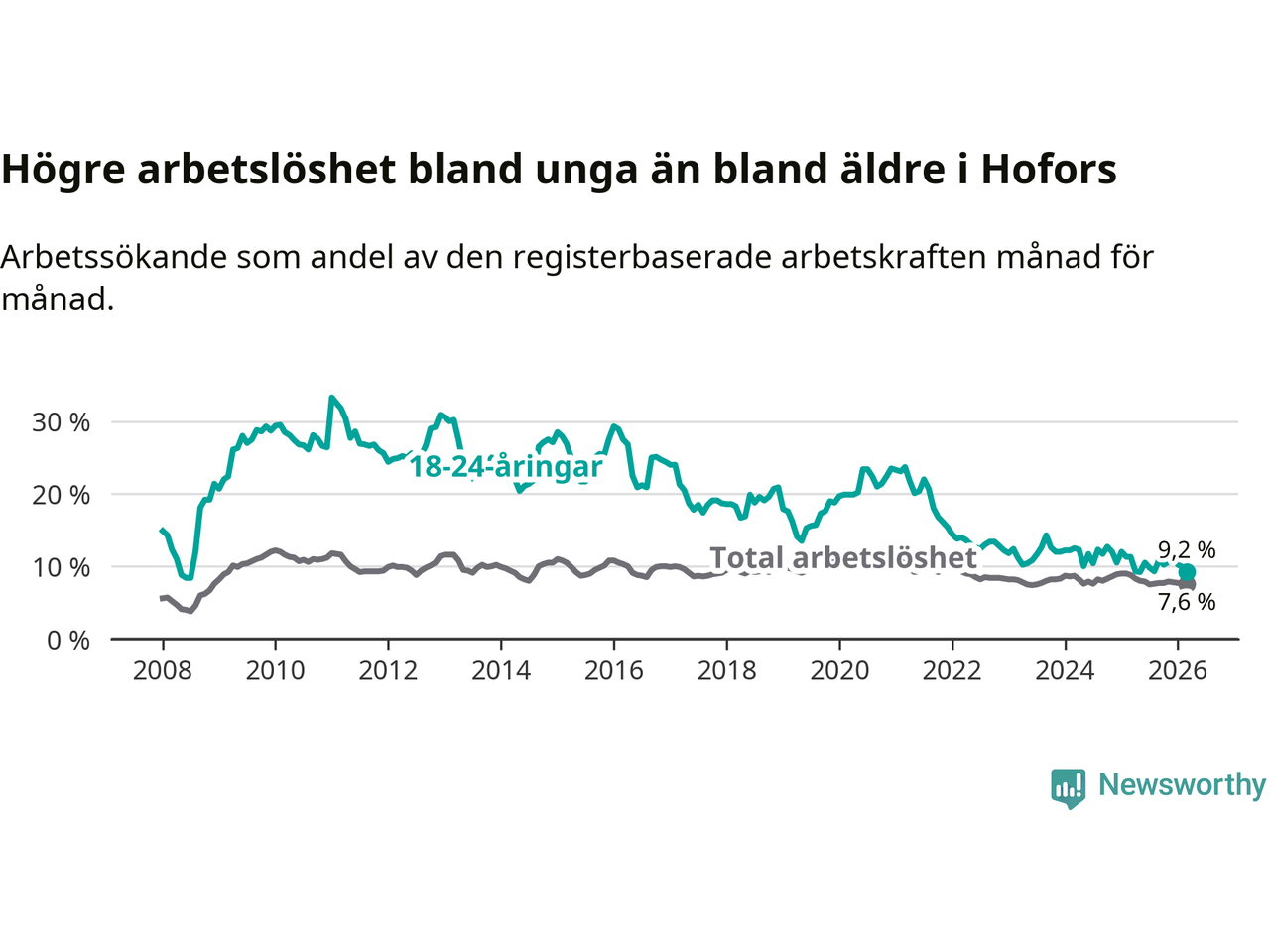Precis som den totala arbetslösheten sjunker arbetslösheten bland unga (−2,1 procentenheter). I mars var 9,2 procent av 18–24-åringarna inskrivna som arbetssökande (motsvarande 35 personer). Mäter vi antalet inskrivna ser vi en minskning med elva personer på ett års sikt.