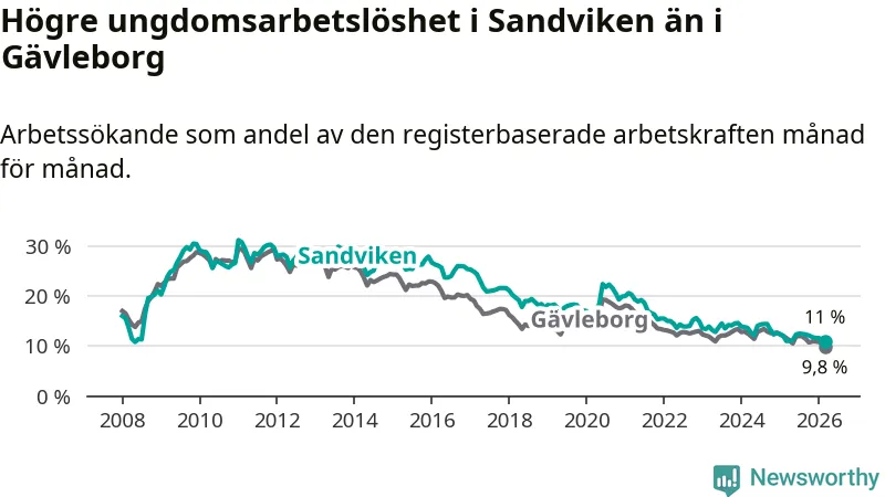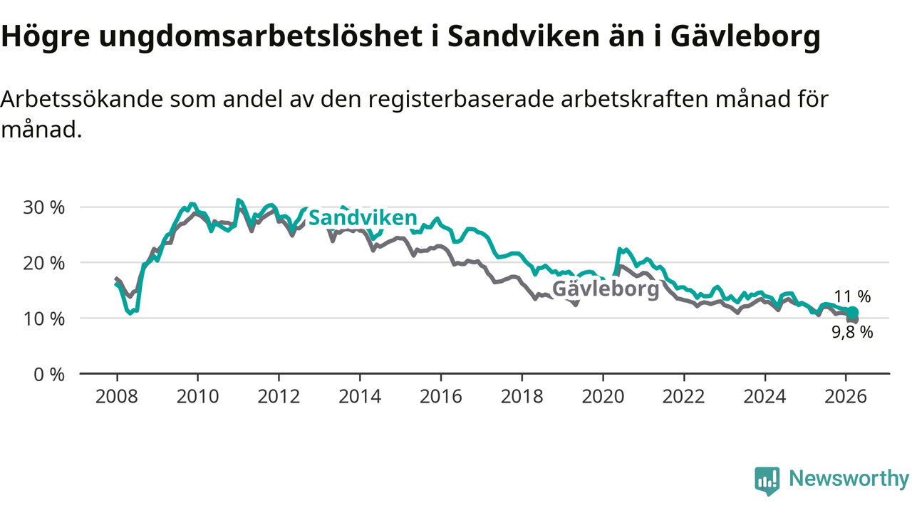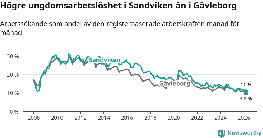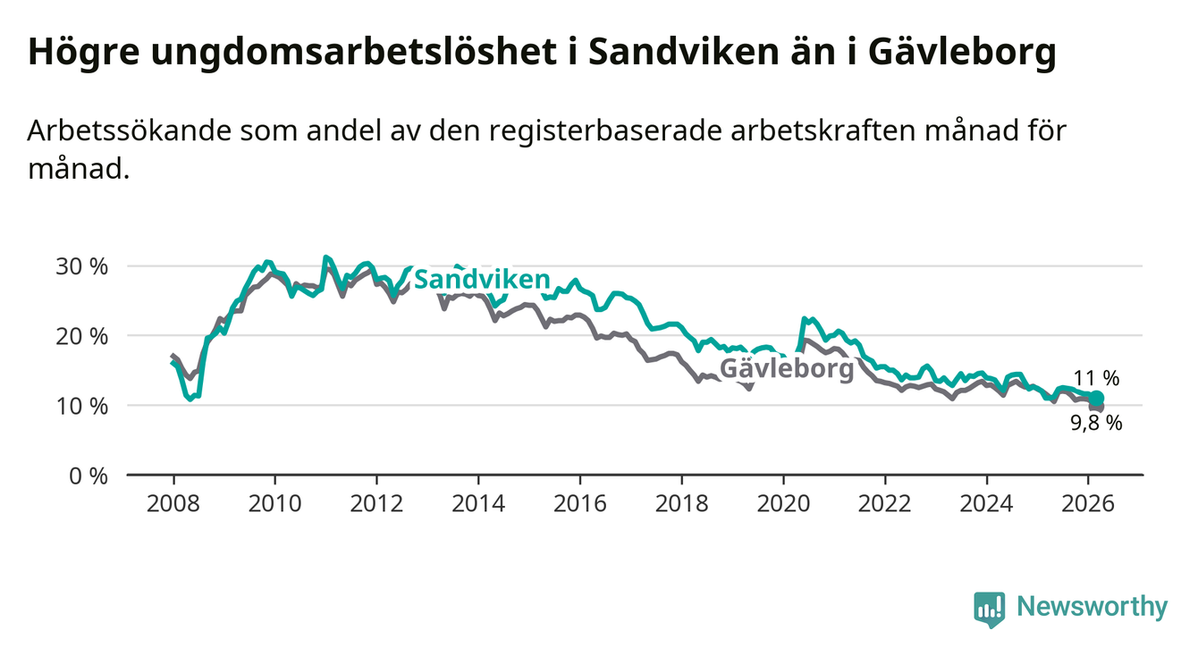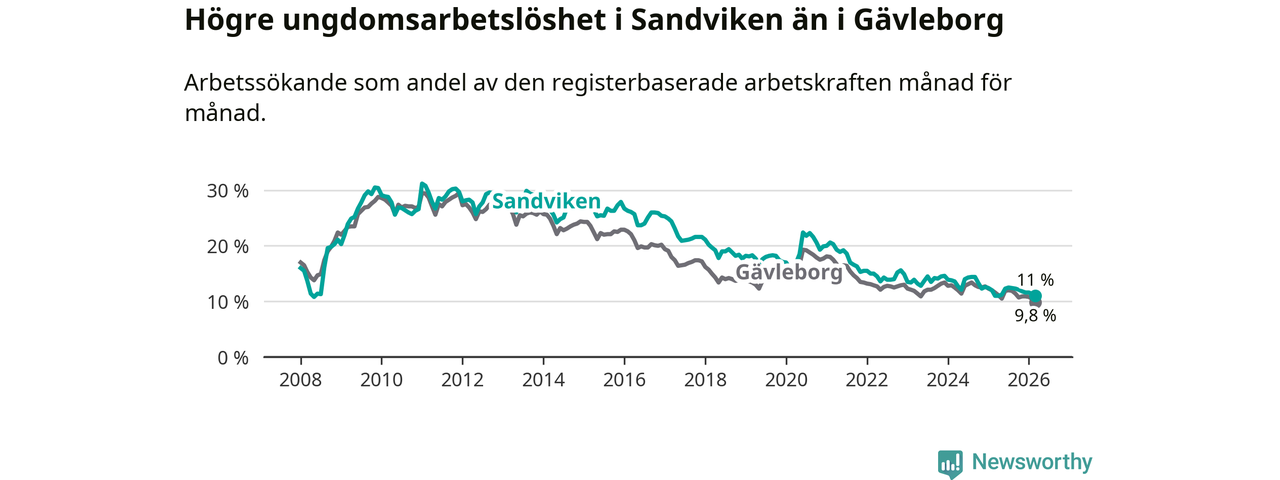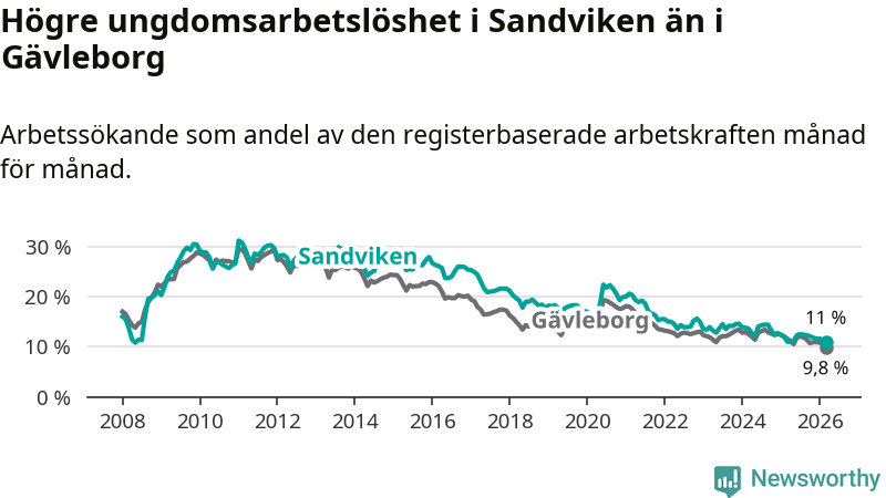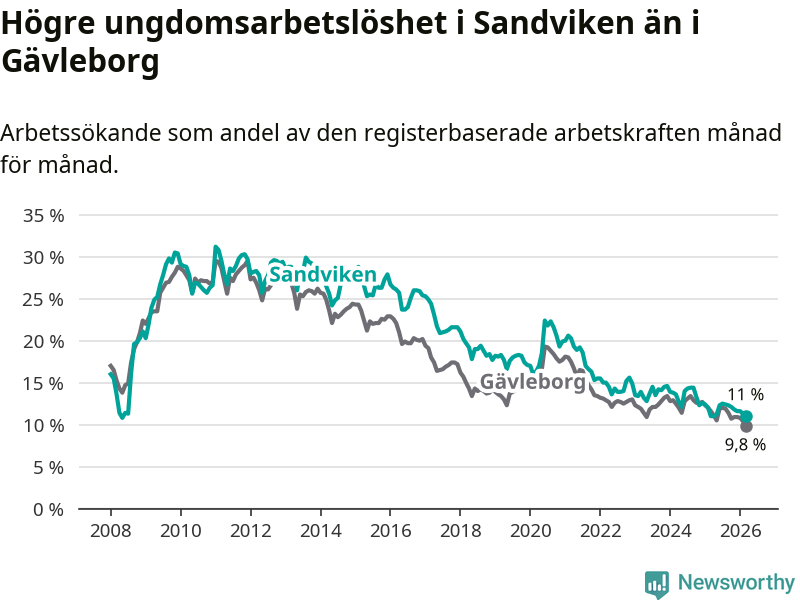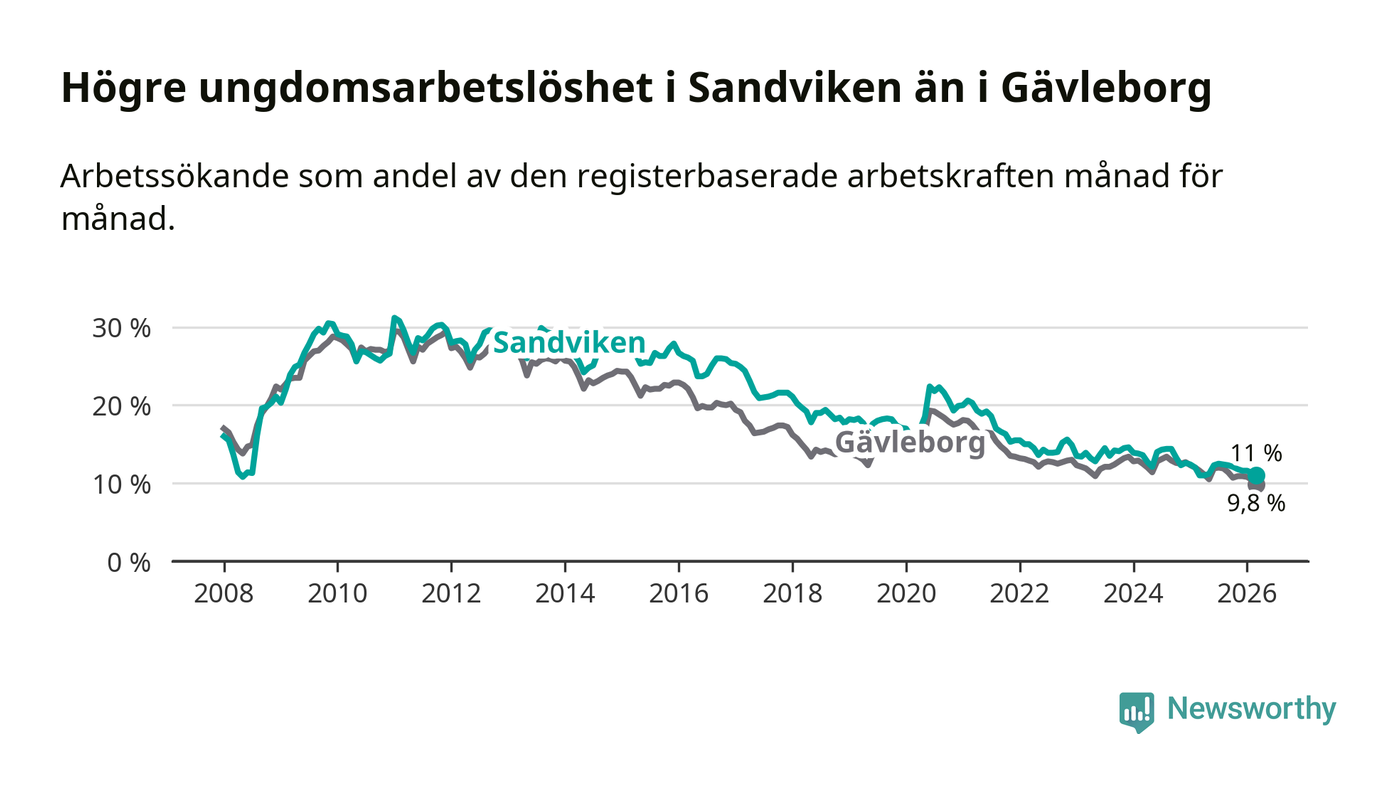 Precis som den totala arbetslösheten ligger ungdomsarbetslösheten i Sandviken högre än i Gävleborg som helhet. Skillnaden mellan kommunen och länet är 1,2 procentenheter.
