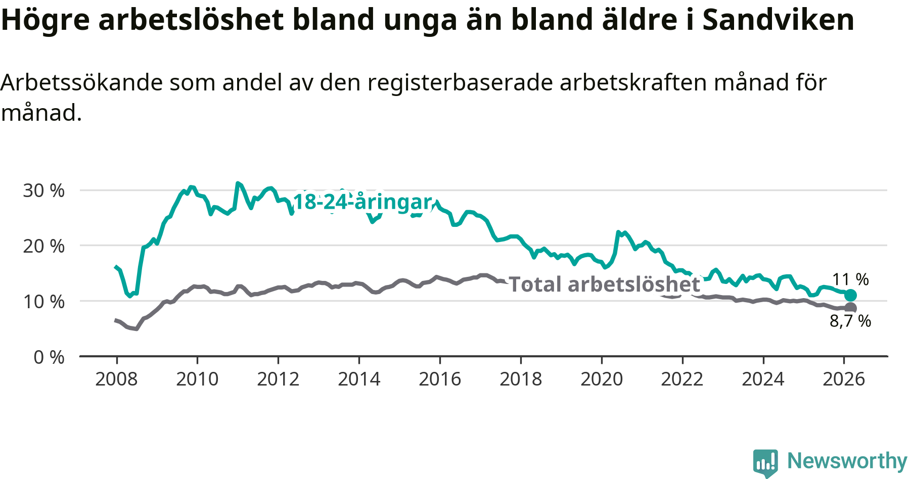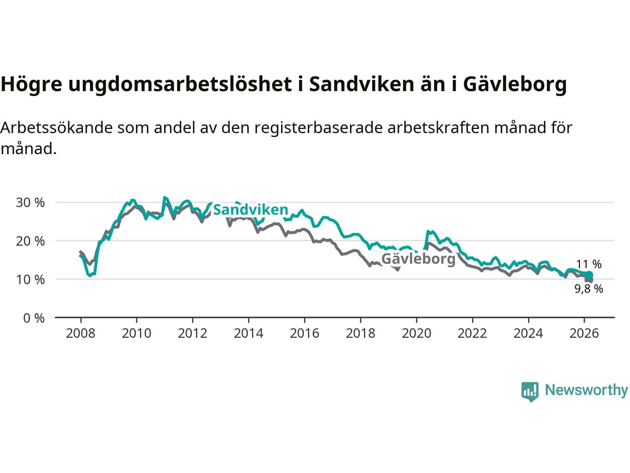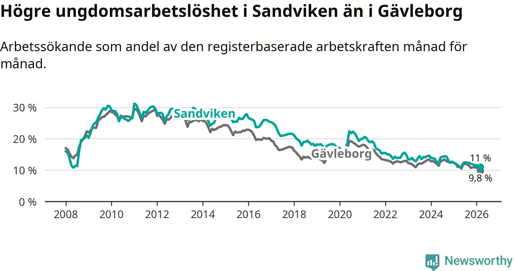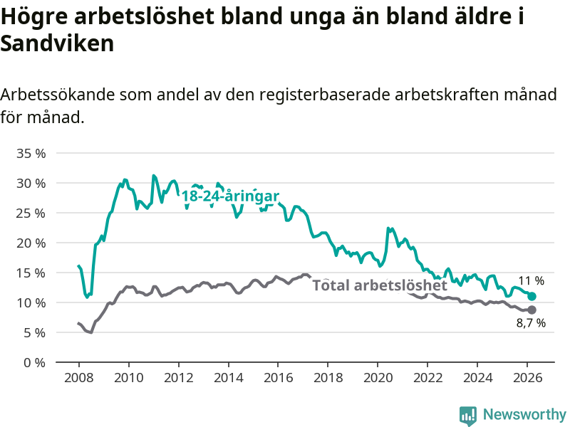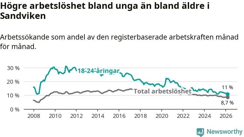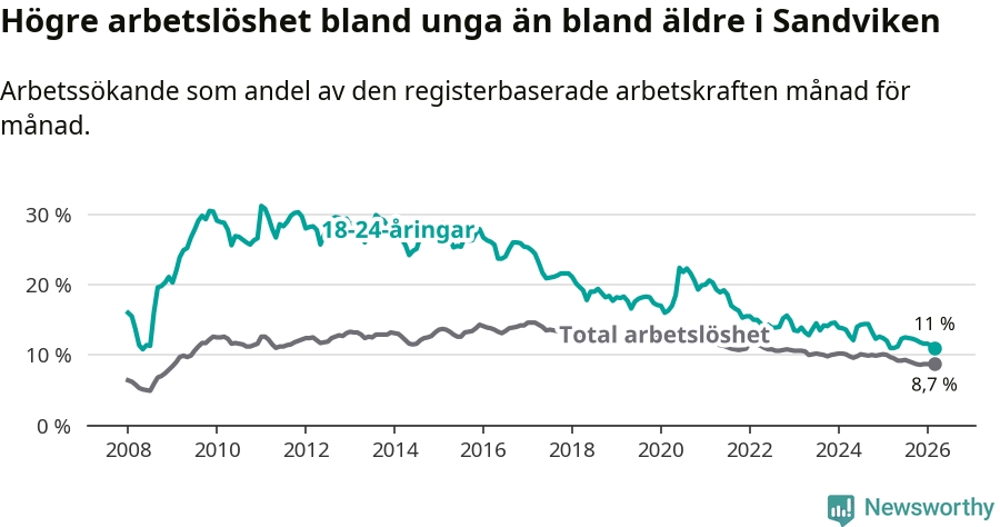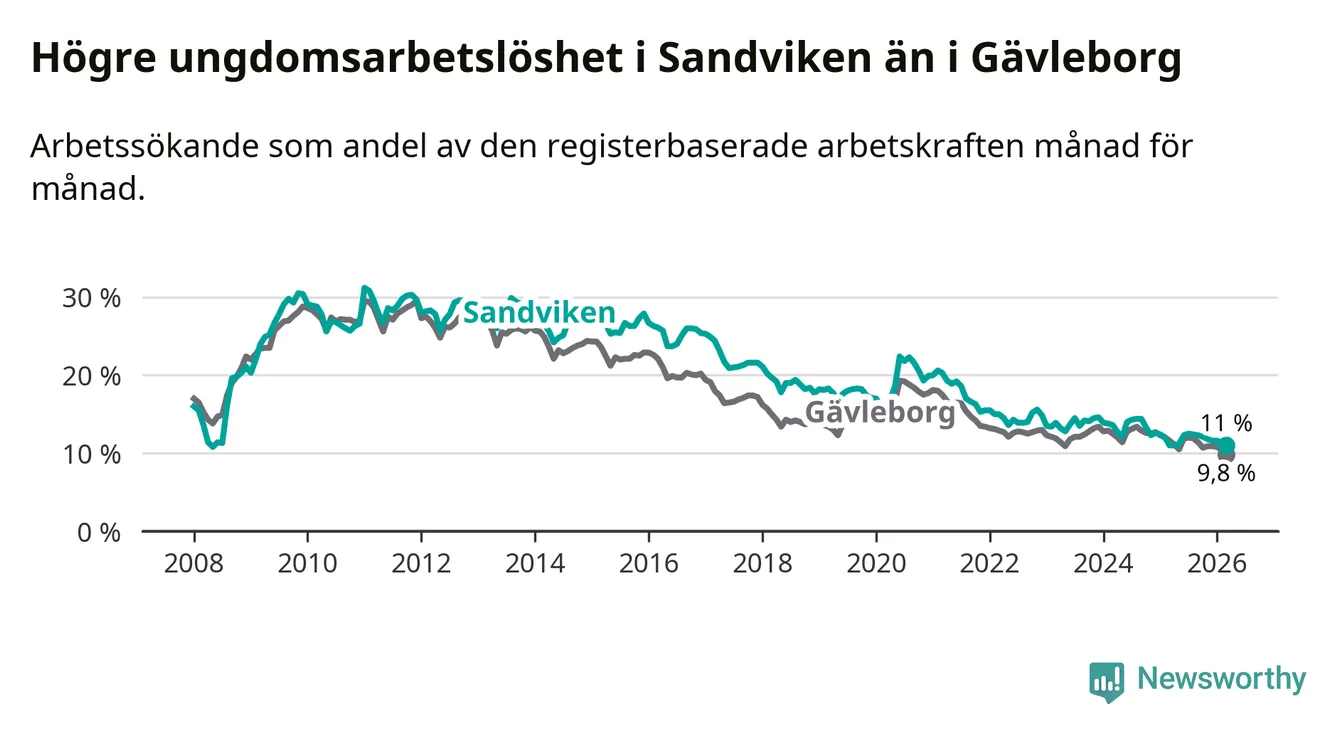 Precis som den totala arbetslösheten ligger ungdomsarbetslösheten i Sandviken högre än i Gävleborg som helhet. Skillnaden mellan kommunen och länet är 1,2 procentenheter.