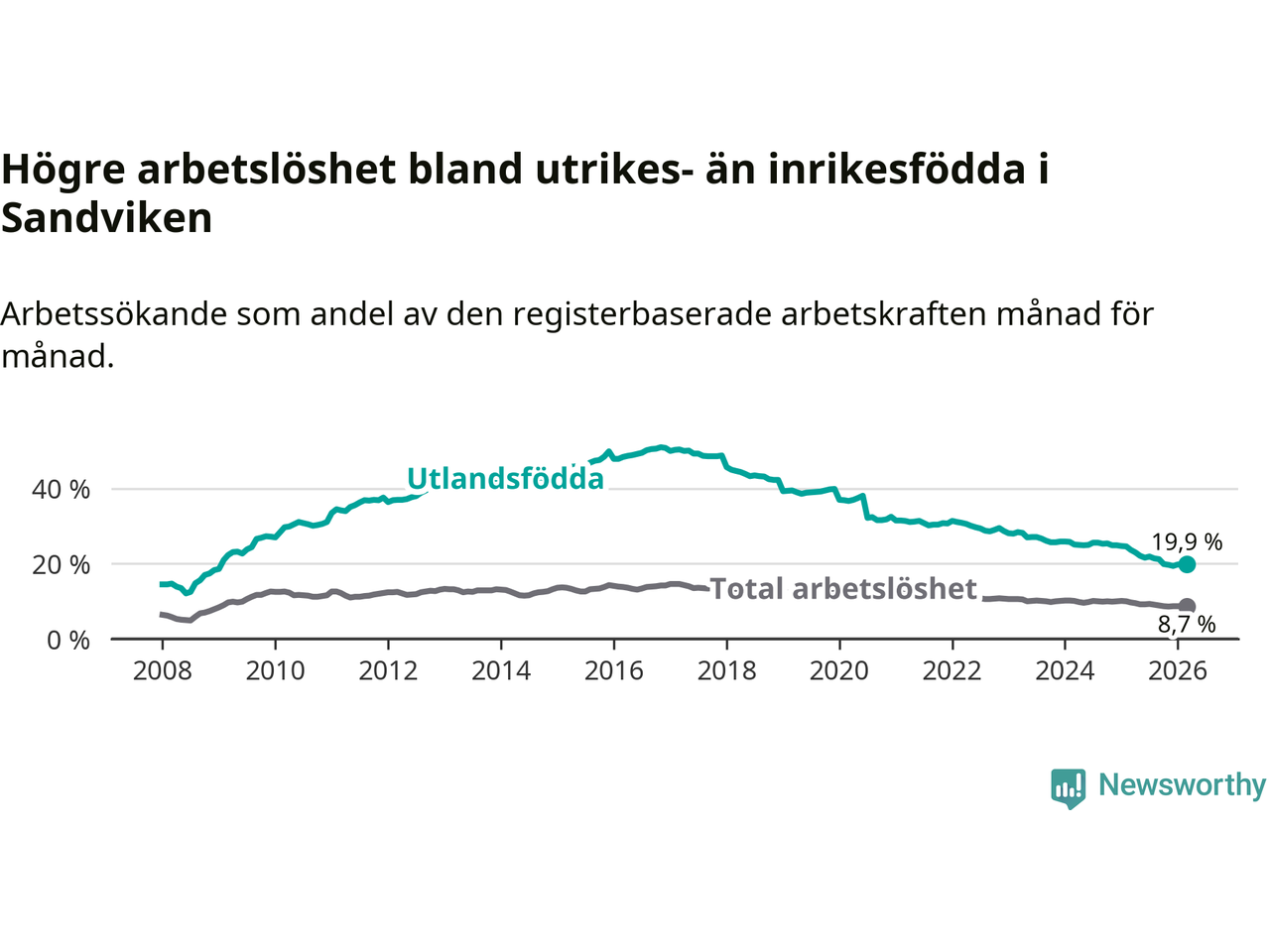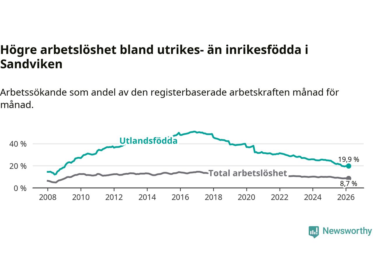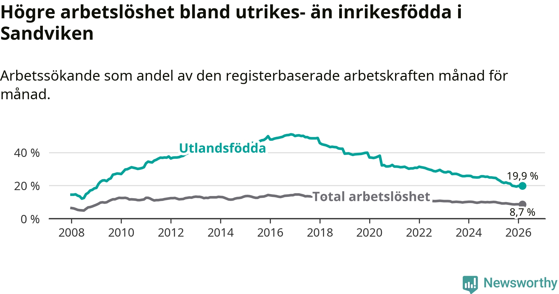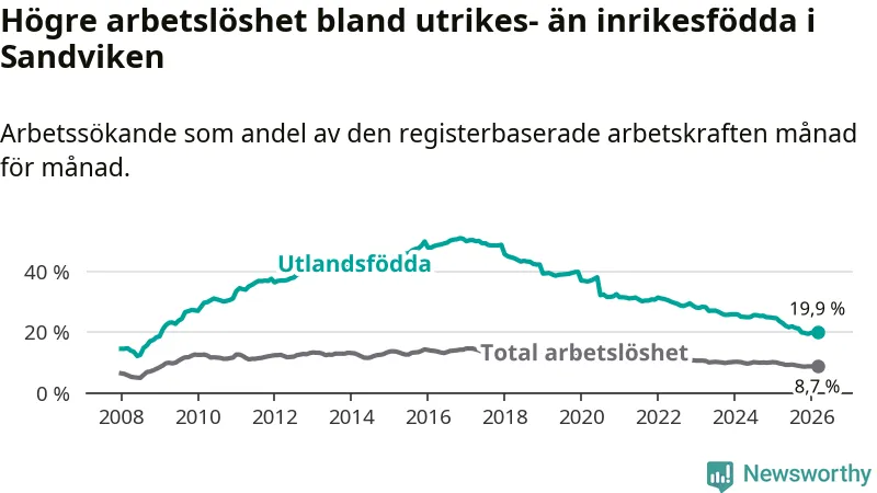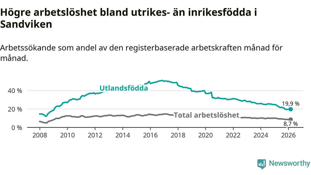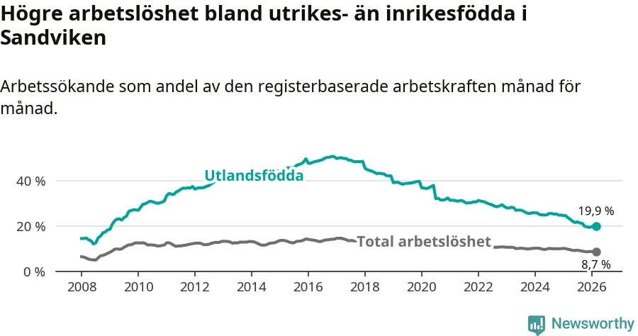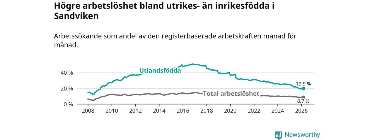 Skillnaden i arbetslöshet mellan utrikesfödda och hela befolkningen är 11,2 procentenheter i Sandviken. Det är en betydligt mindre skillnad än för ett år sedan (−2,8 procentenheter).
