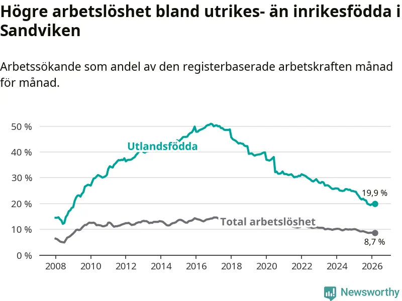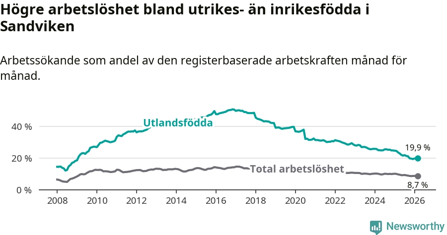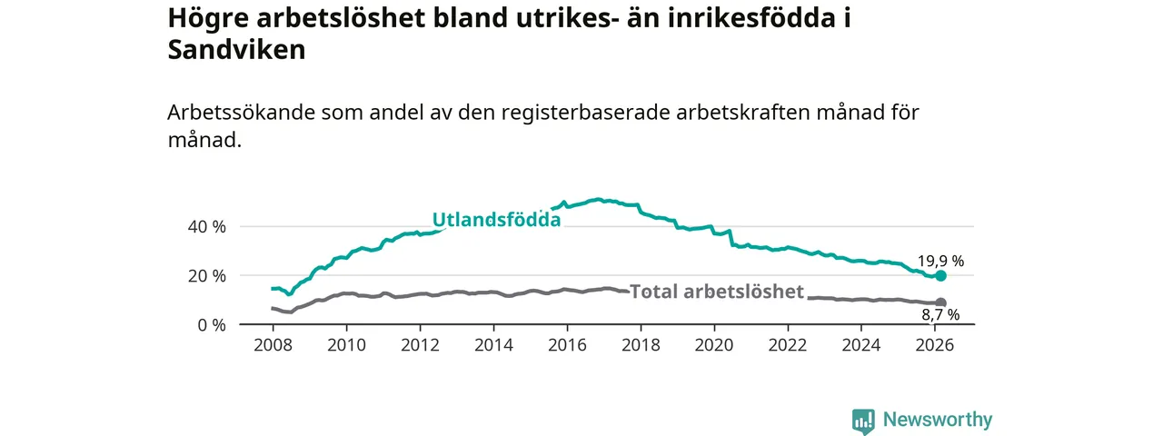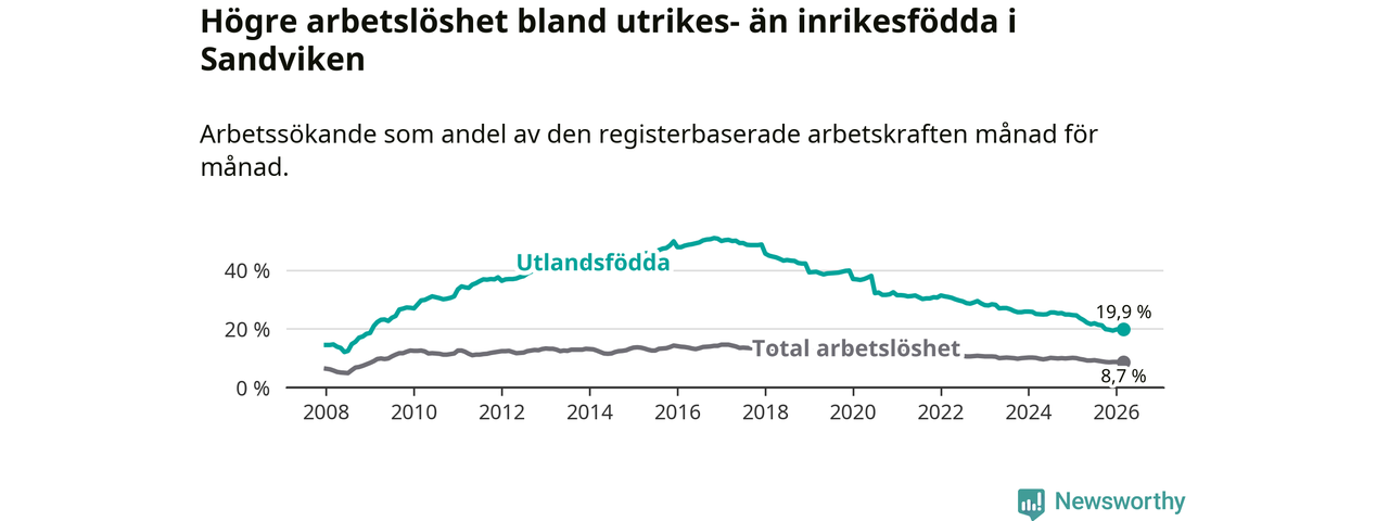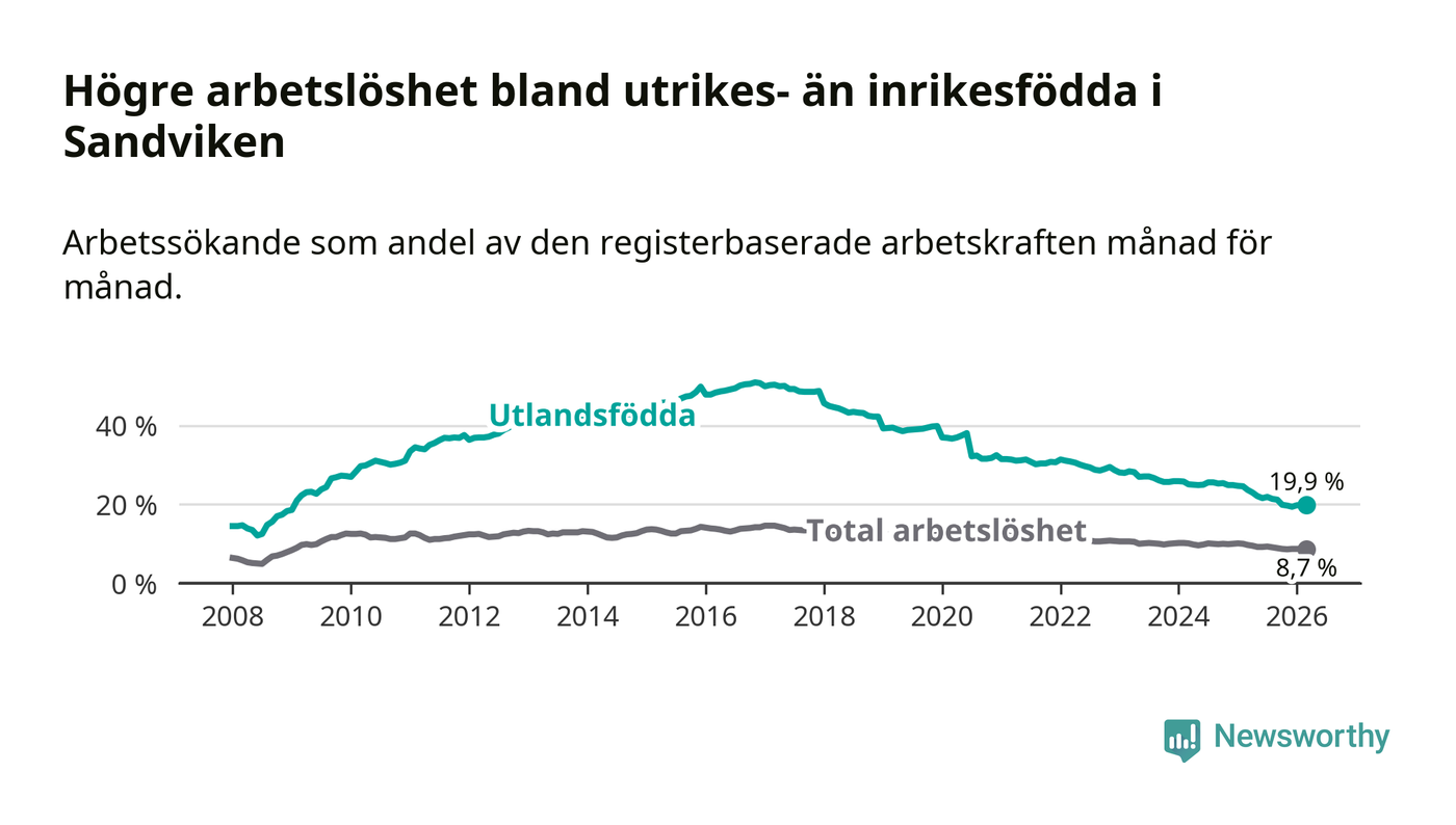 Arbetslösheten bland utlandsfödda var 19,9 procent i Sandviken under mars månad, motsvarande 814 av 4 090 personer. Det är 3,8 procentenheter färre än vid samma tidpunkt i fjol (−147 om man räknar personer). Därmed har de utlandsföddas arbetslöshet varit lägre än vid samma tidpunkt i fjol i över åtta år i sträck. Sedan juni 2017 har arbetslösheten bland utlandsfödda minskat från 49,3 till 19,9 procent.