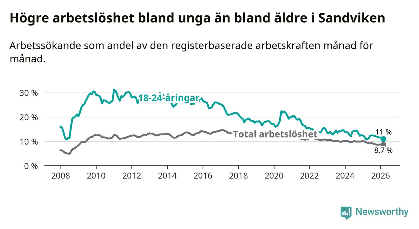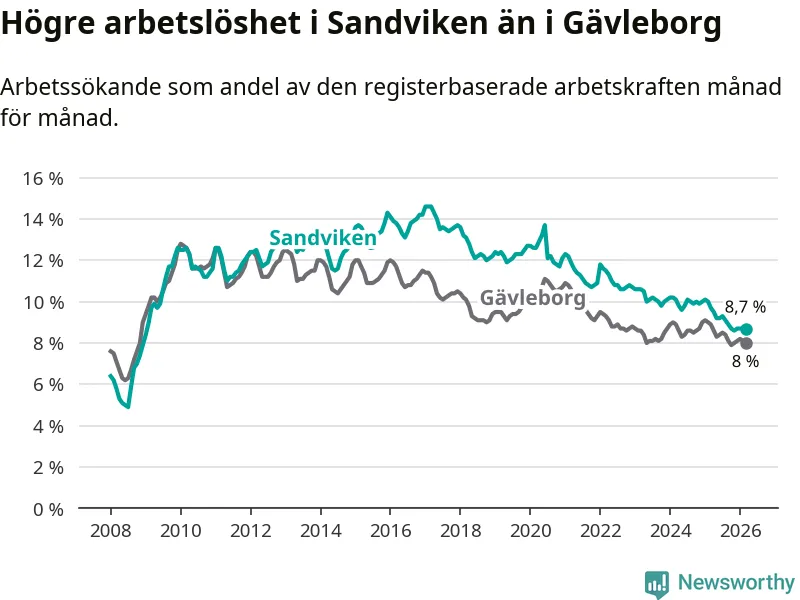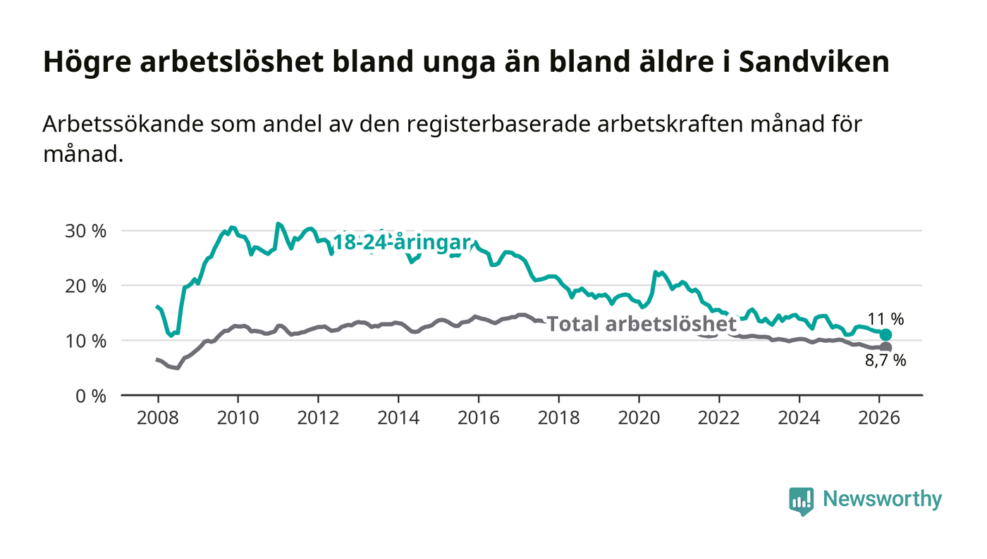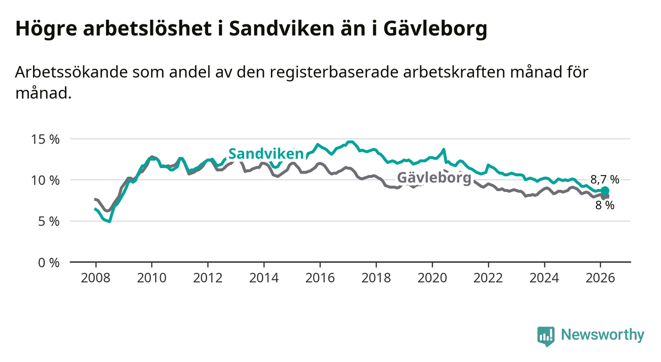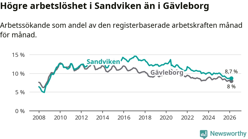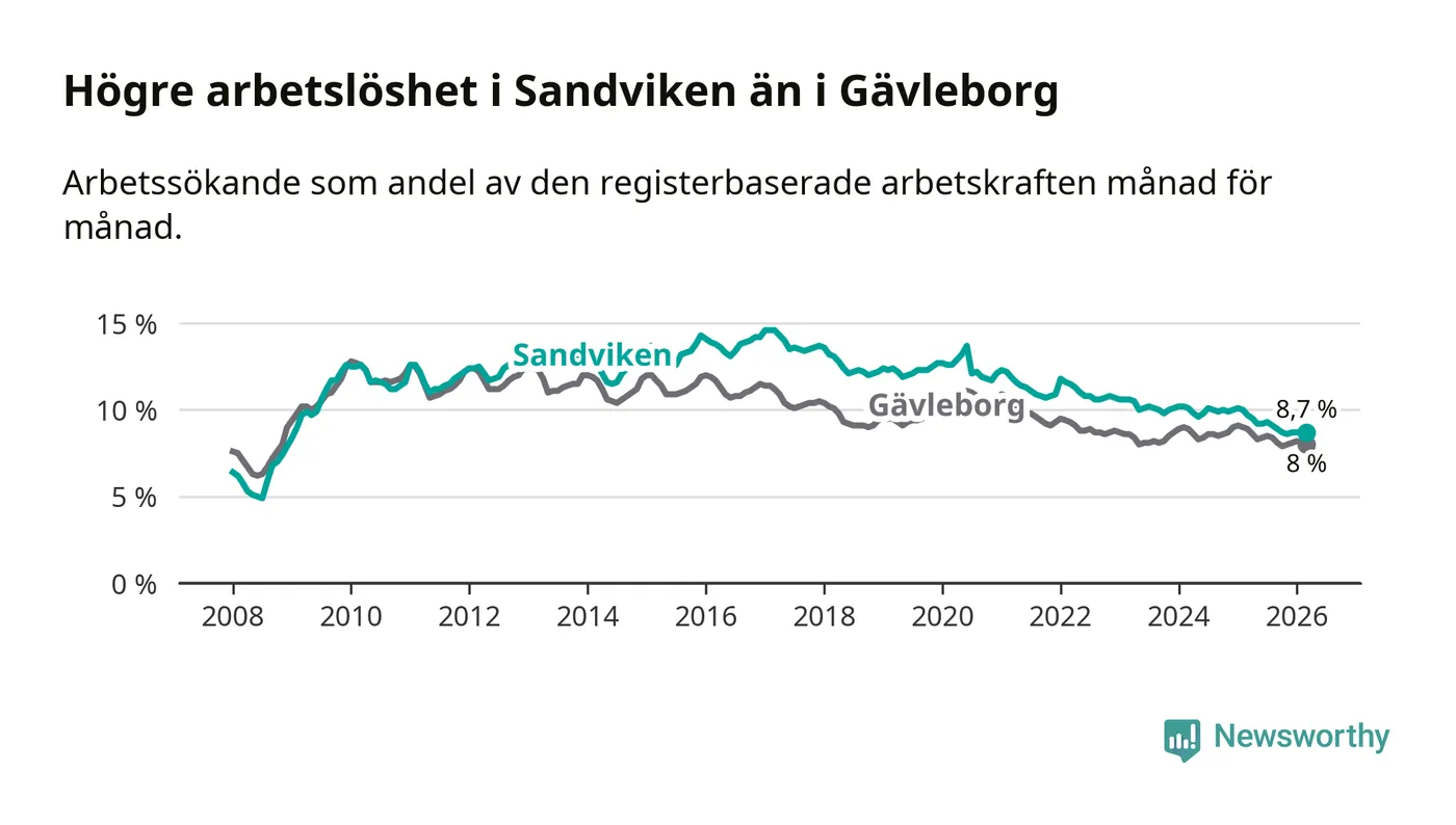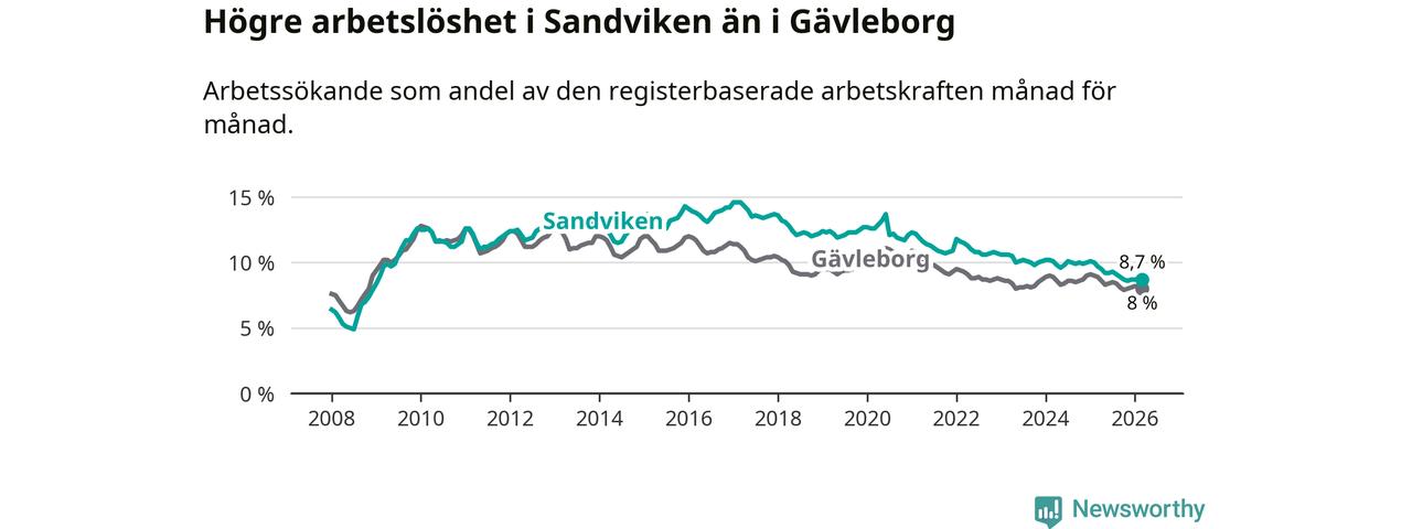 Det är 17:e månaden i följd som arbetslösheten i Sandviken är lägre än den var under samma tidpunkt året innan. Sedan oktober 2024 har arbetslösheten gått ner från 10,0 till 8,7 procent.