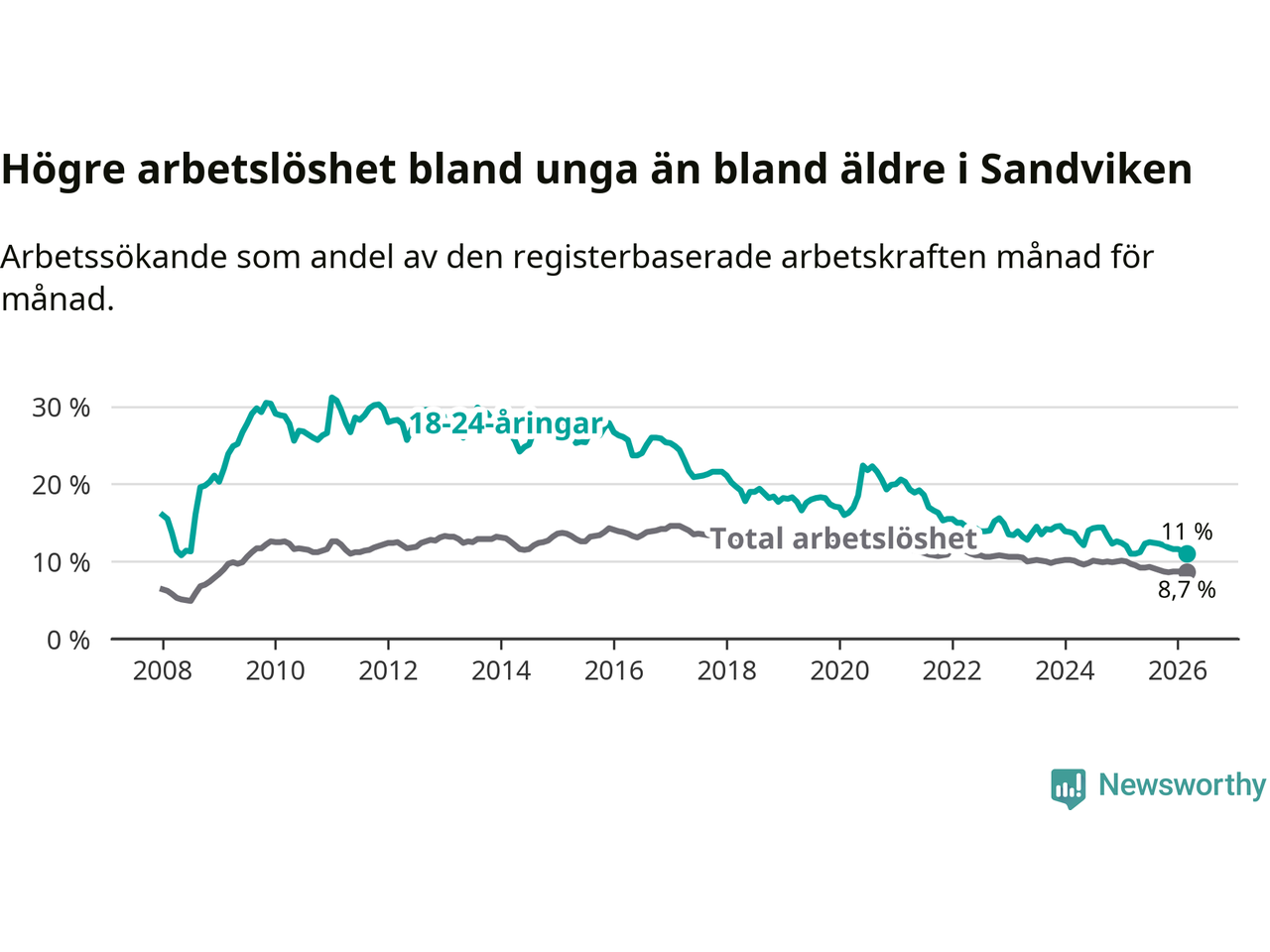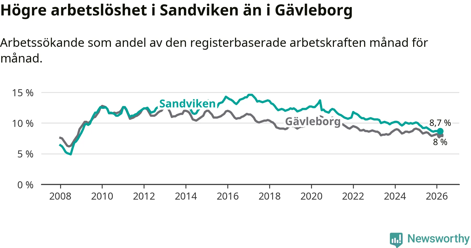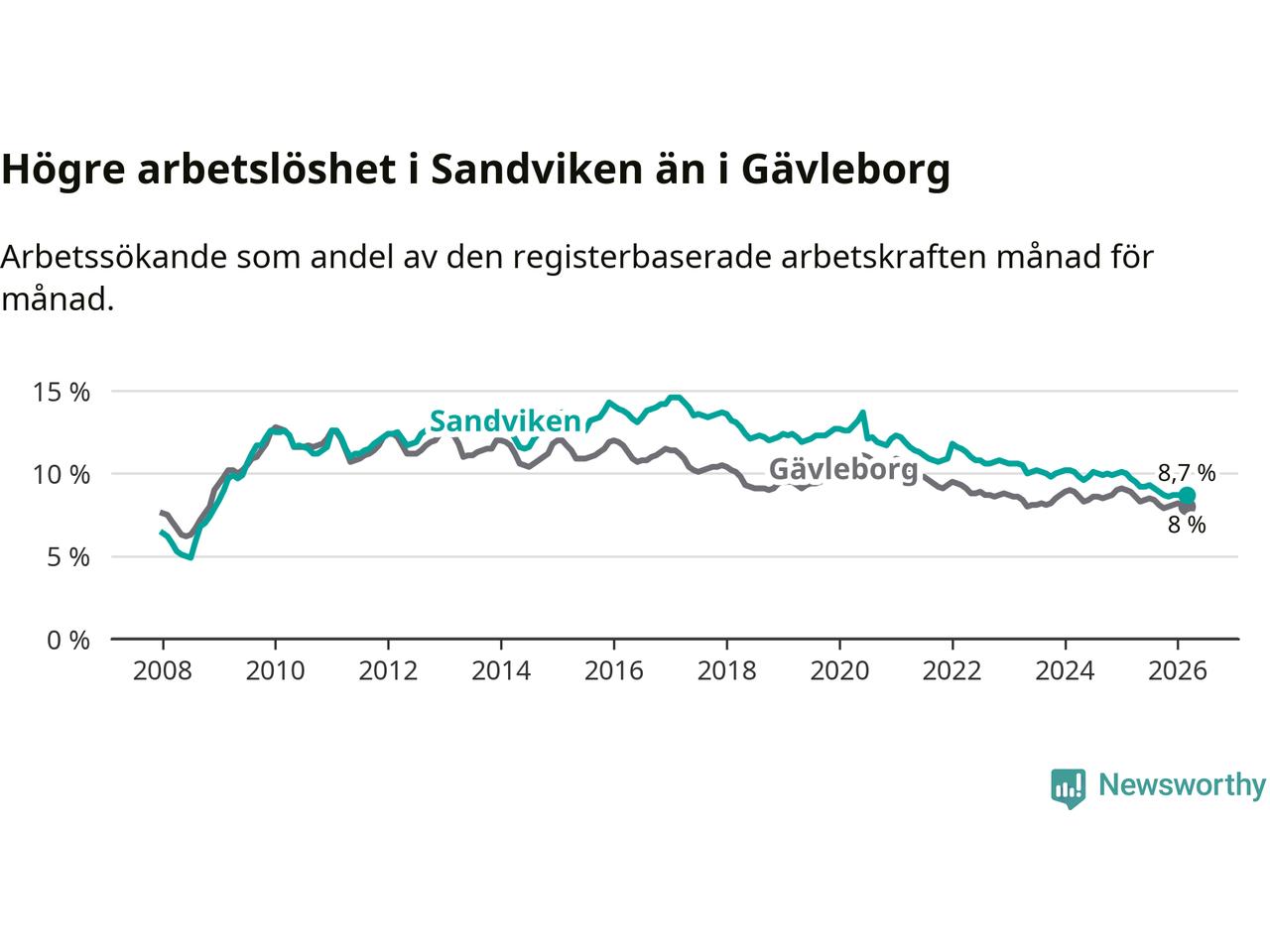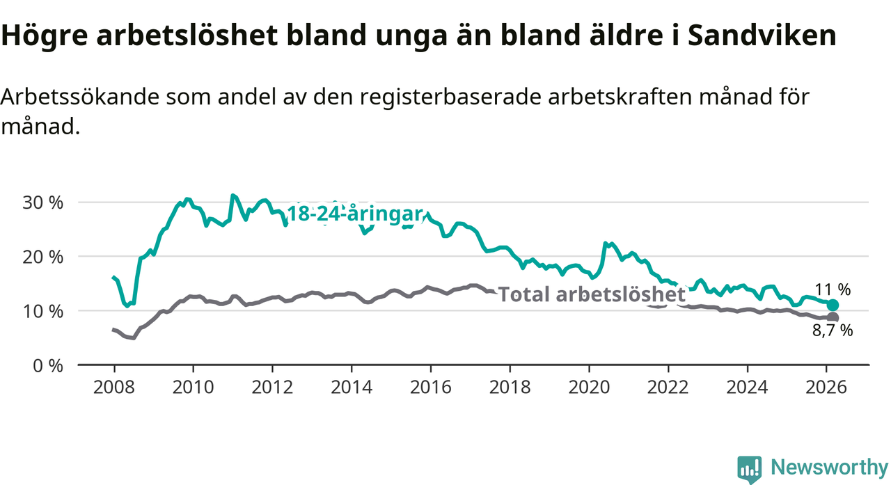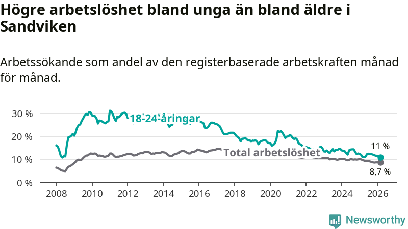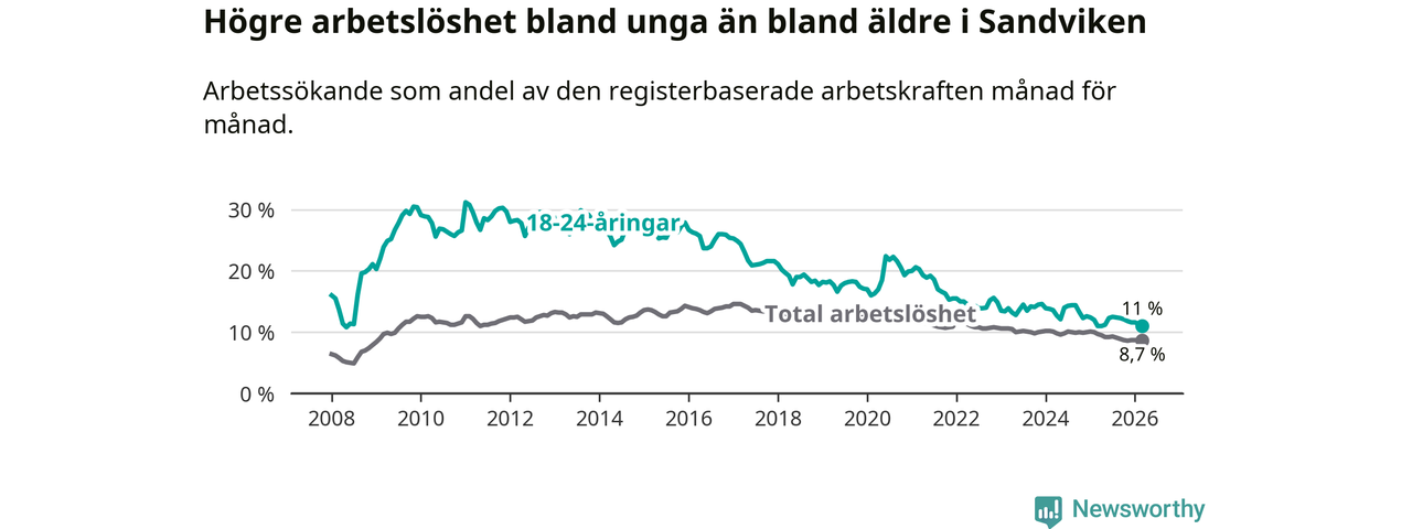 Det är 17:e månaden i följd som arbetslösheten i Sandviken är lägre än den var under samma tidpunkt året innan. Sedan oktober 2024 har arbetslösheten gått ner från 10,0 till 8,7 procent.