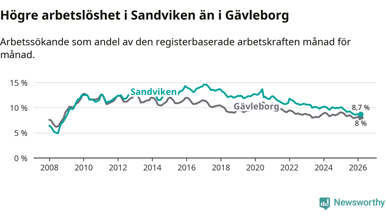 Under mars månad rapporterade Sandvikens kommun en total arbetslöshet på 8,7 procent. Det är en minskning jämfört med samma tidpunkt i fjol (−1,0 procentenheter). Även i Gävleborgs län sjunker arbetslösheten .