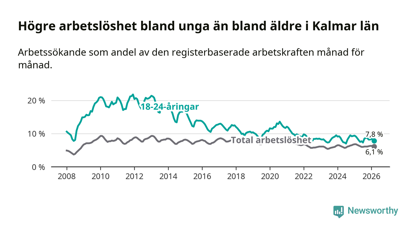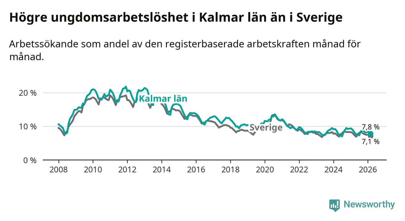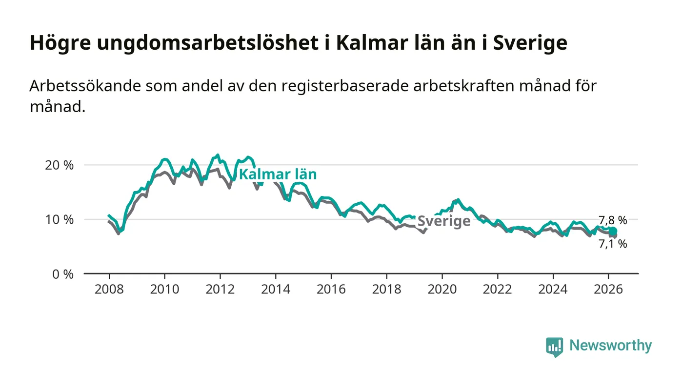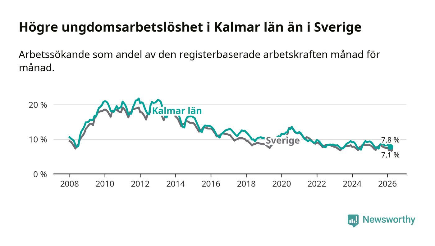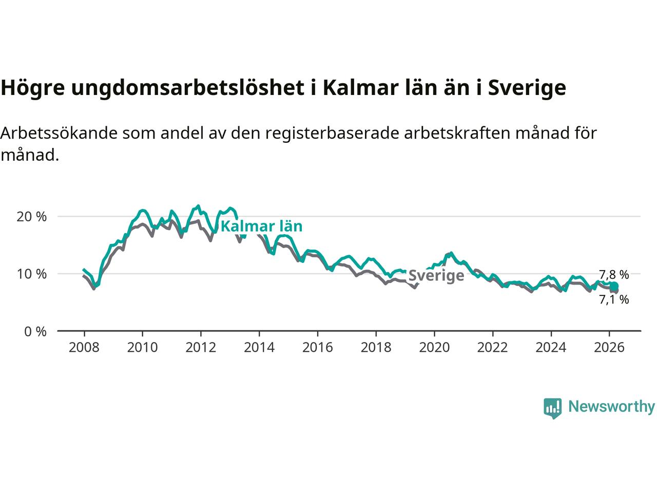 Medan Kalmar län har lägre total arbetslöshet än Sverige, ligger ungdomsarbetslösheten 0,7 procentenheter högre i Kalmar.