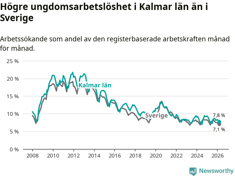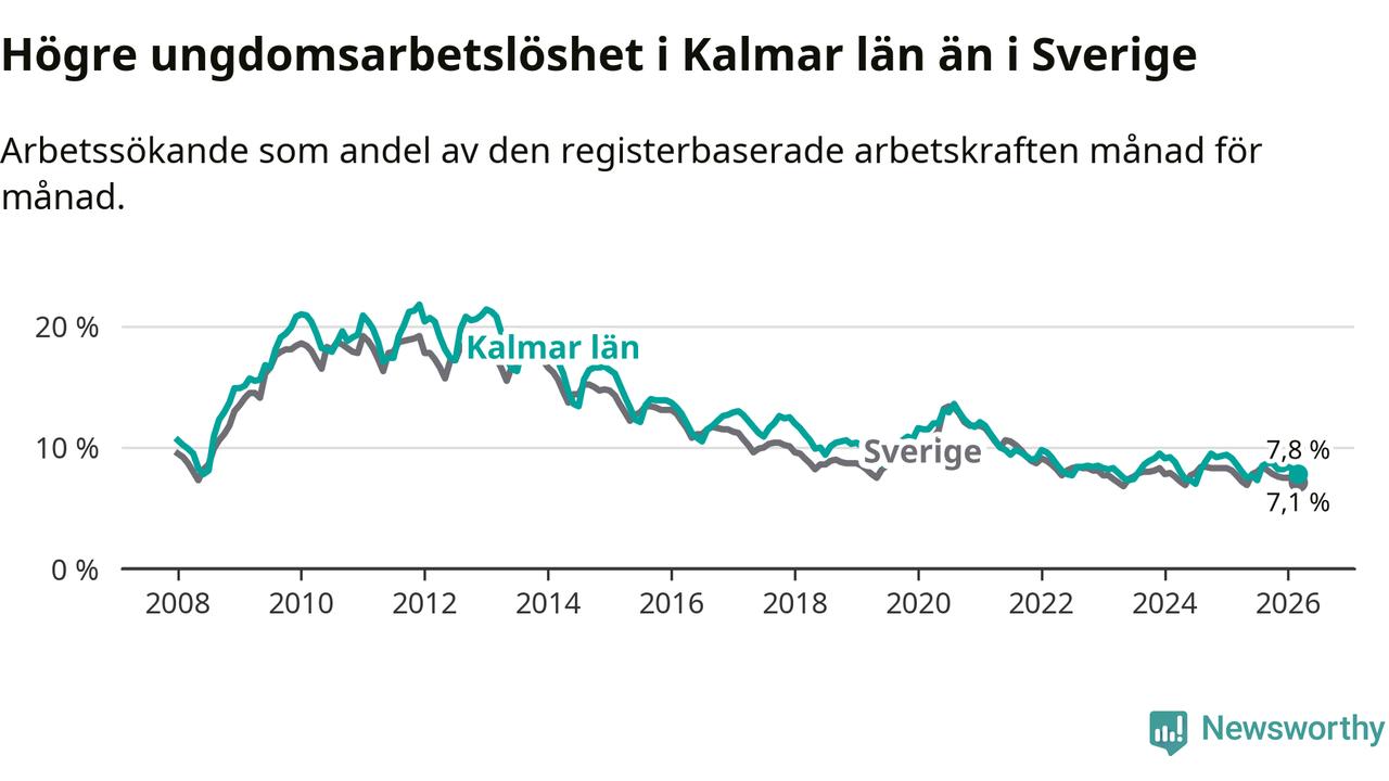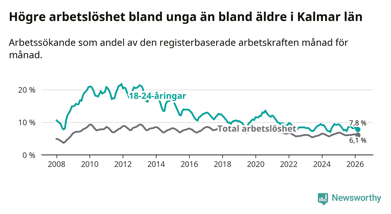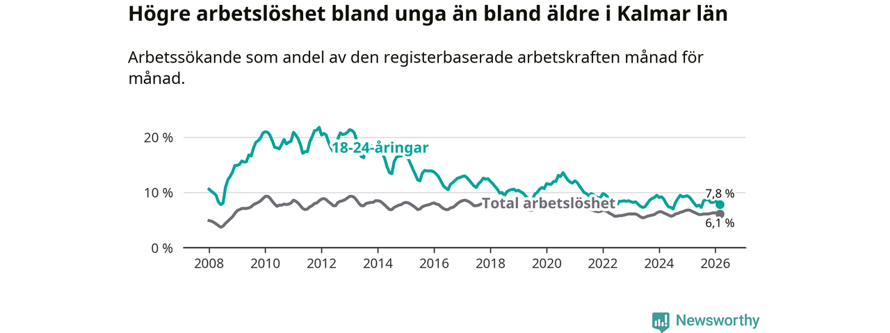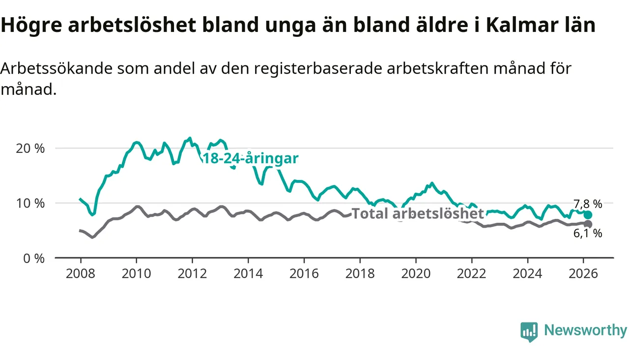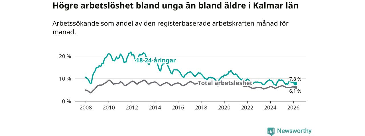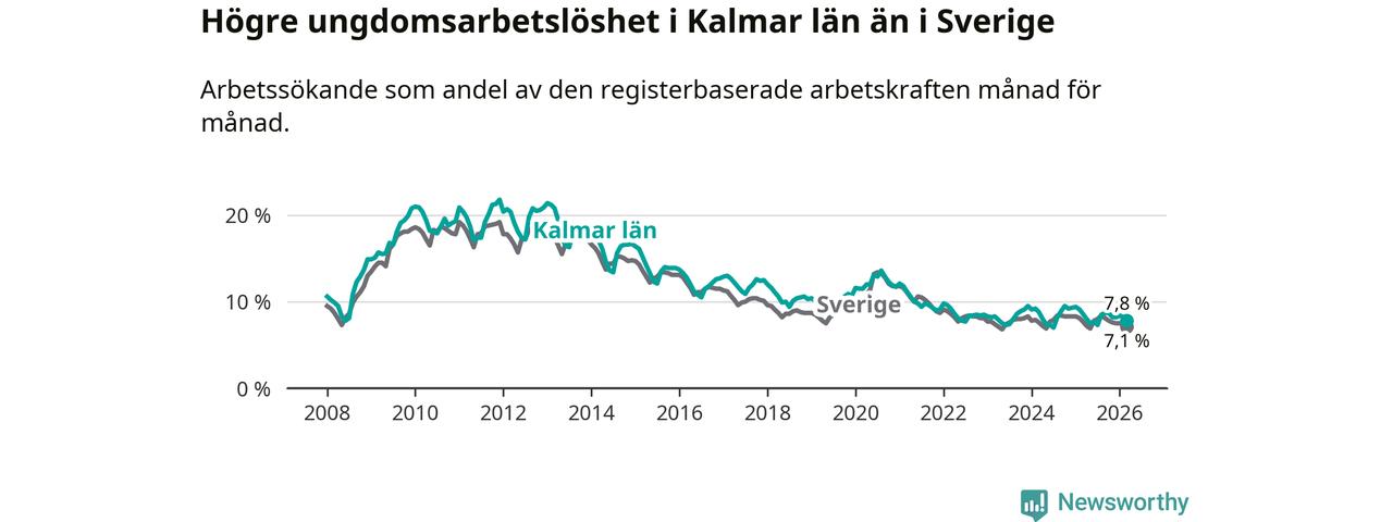 Medan Kalmar län har lägre total arbetslöshet än Sverige, ligger ungdomsarbetslösheten 0,7 procentenheter högre i Kalmar.