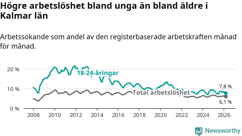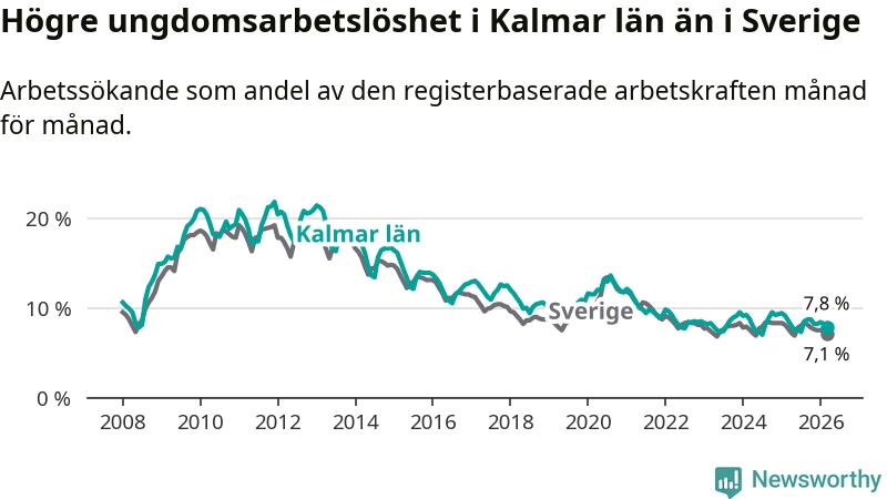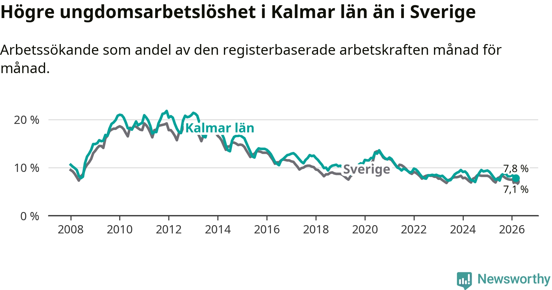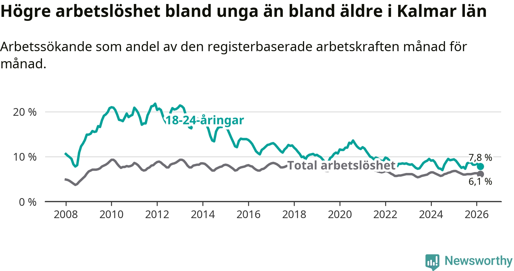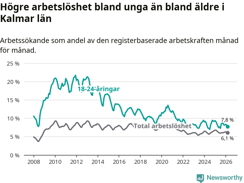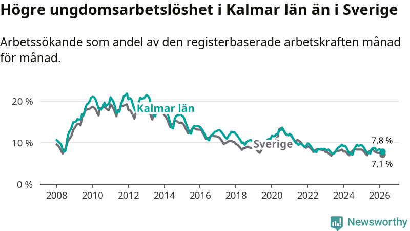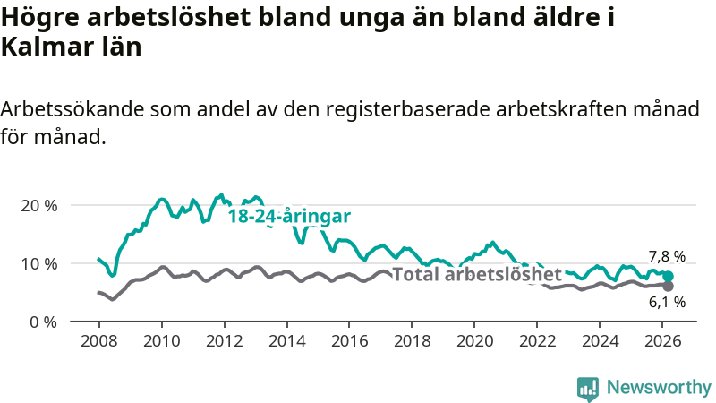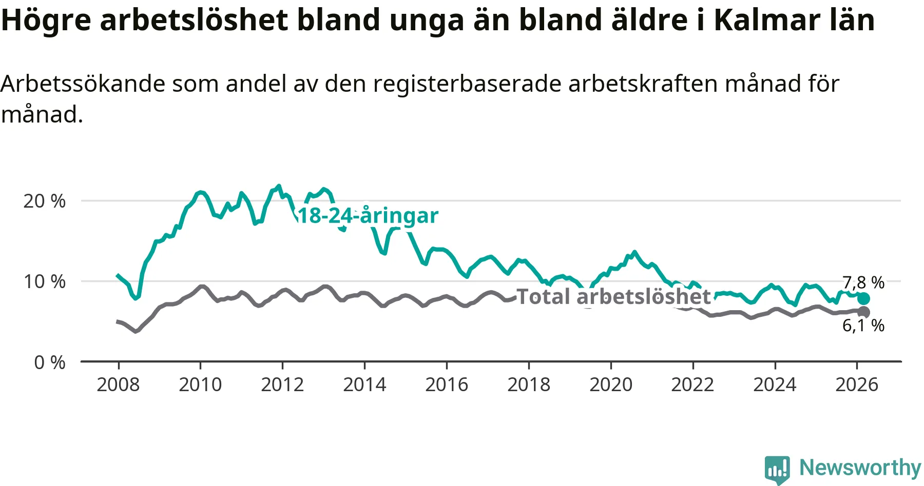 Medan Kalmar län har lägre total arbetslöshet än Sverige, ligger ungdomsarbetslösheten 0,7 procentenheter högre i Kalmar.