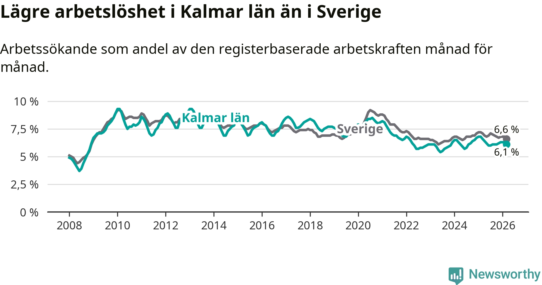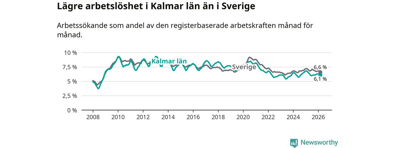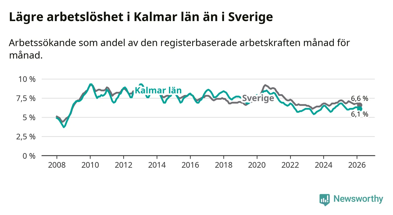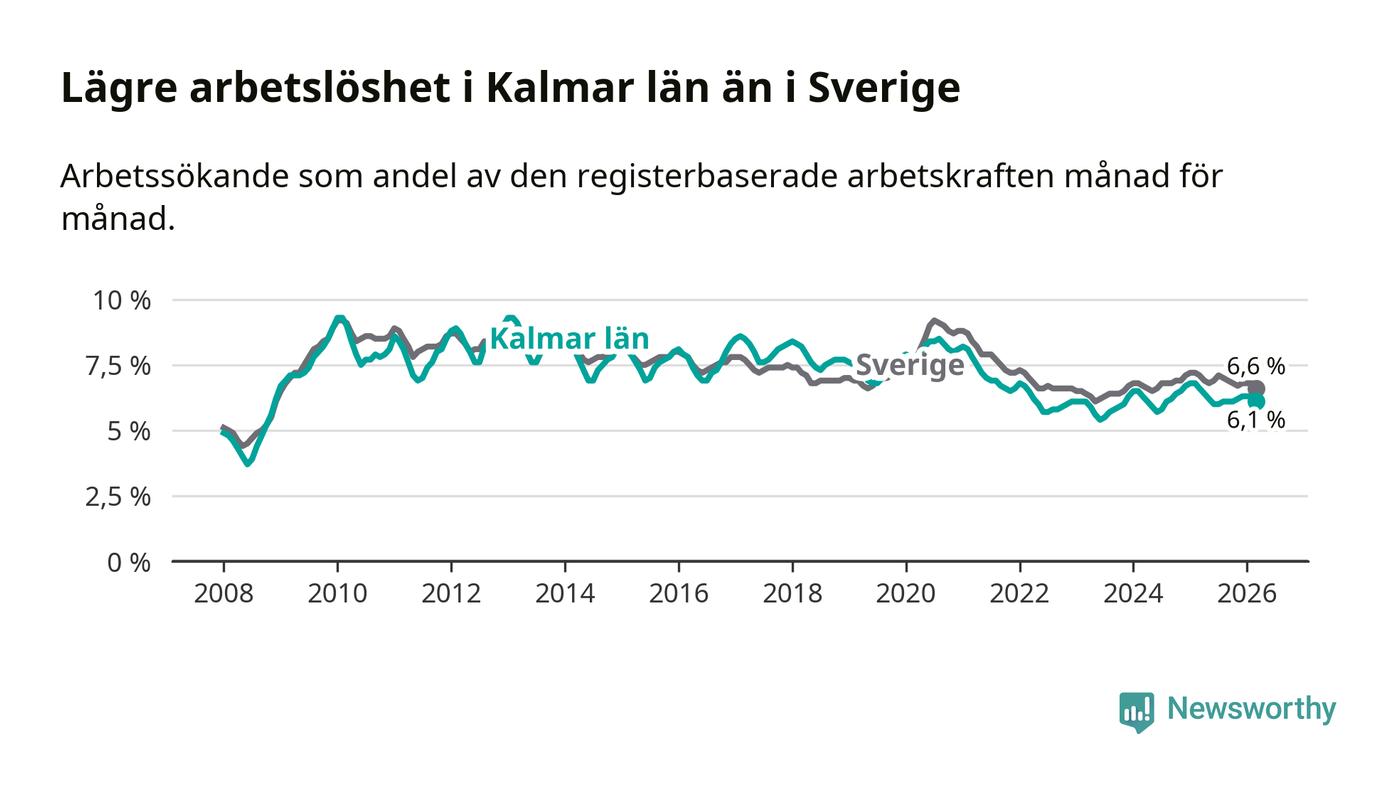 Under mars månad rapporterade Kalmar län en total arbetslöshet på 6,1 procent. Det är en minskning jämfört med samma tidpunkt i fjol (−0,5 procentenheter). Även i Sverige sjunker arbetslösheten .