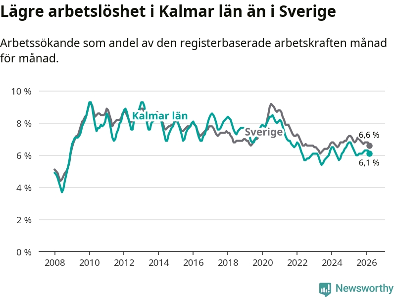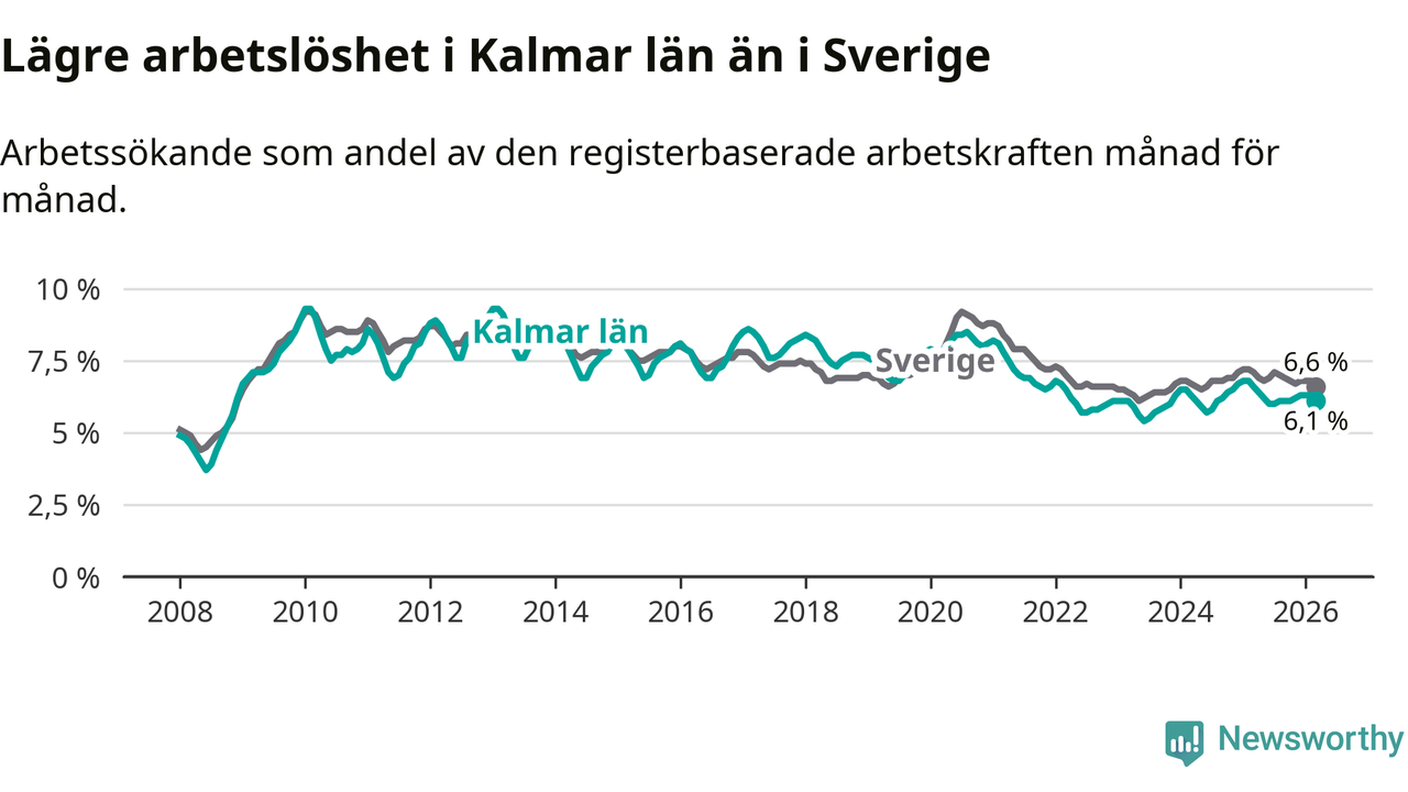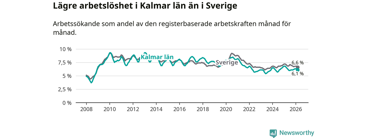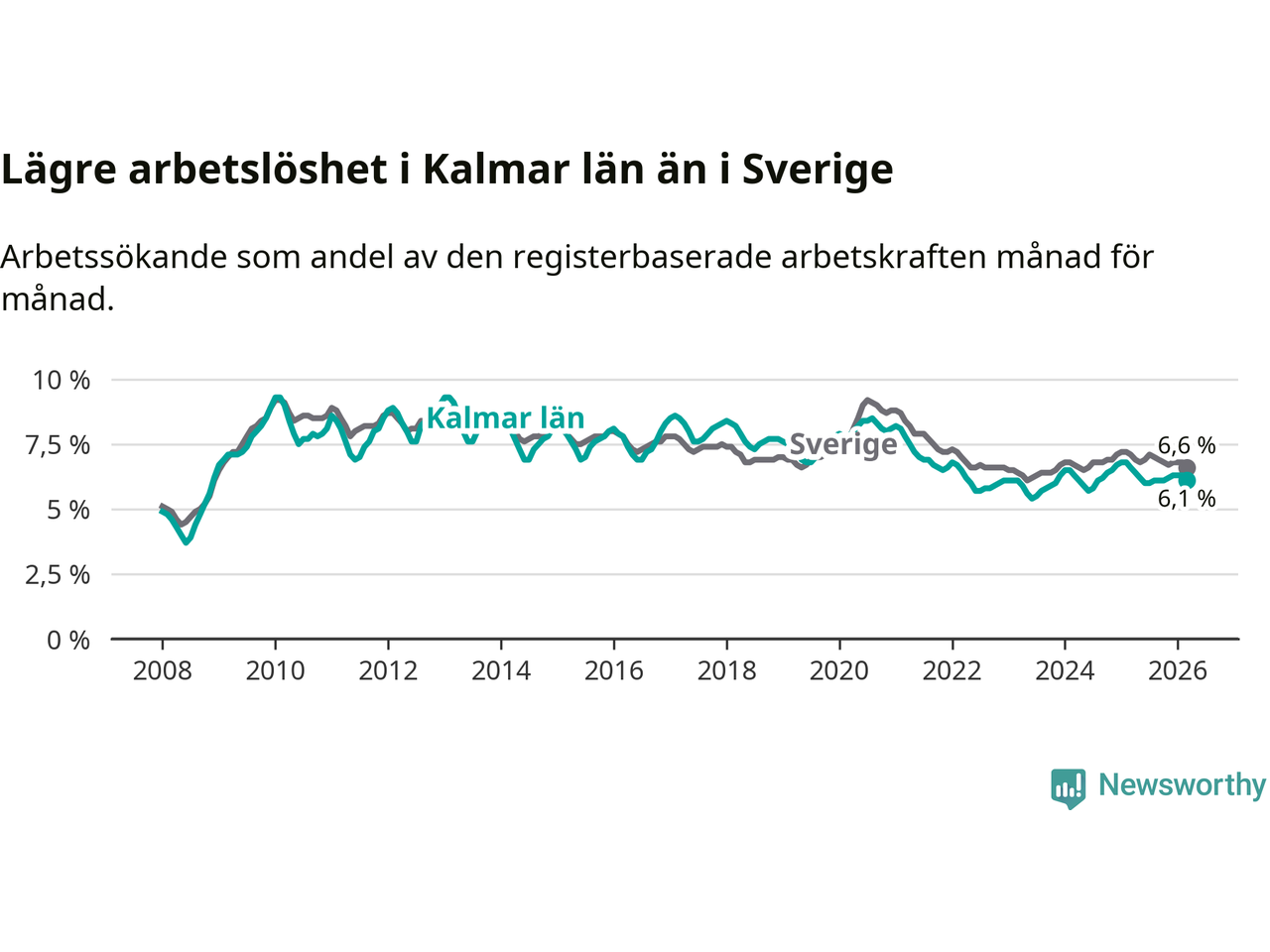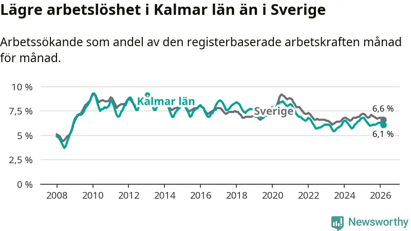 Under mars månad rapporterade Kalmar län en total arbetslöshet på 6,1 procent. Det är en minskning jämfört med samma tidpunkt i fjol (−0,5 procentenheter). Även i Sverige sjunker arbetslösheten .