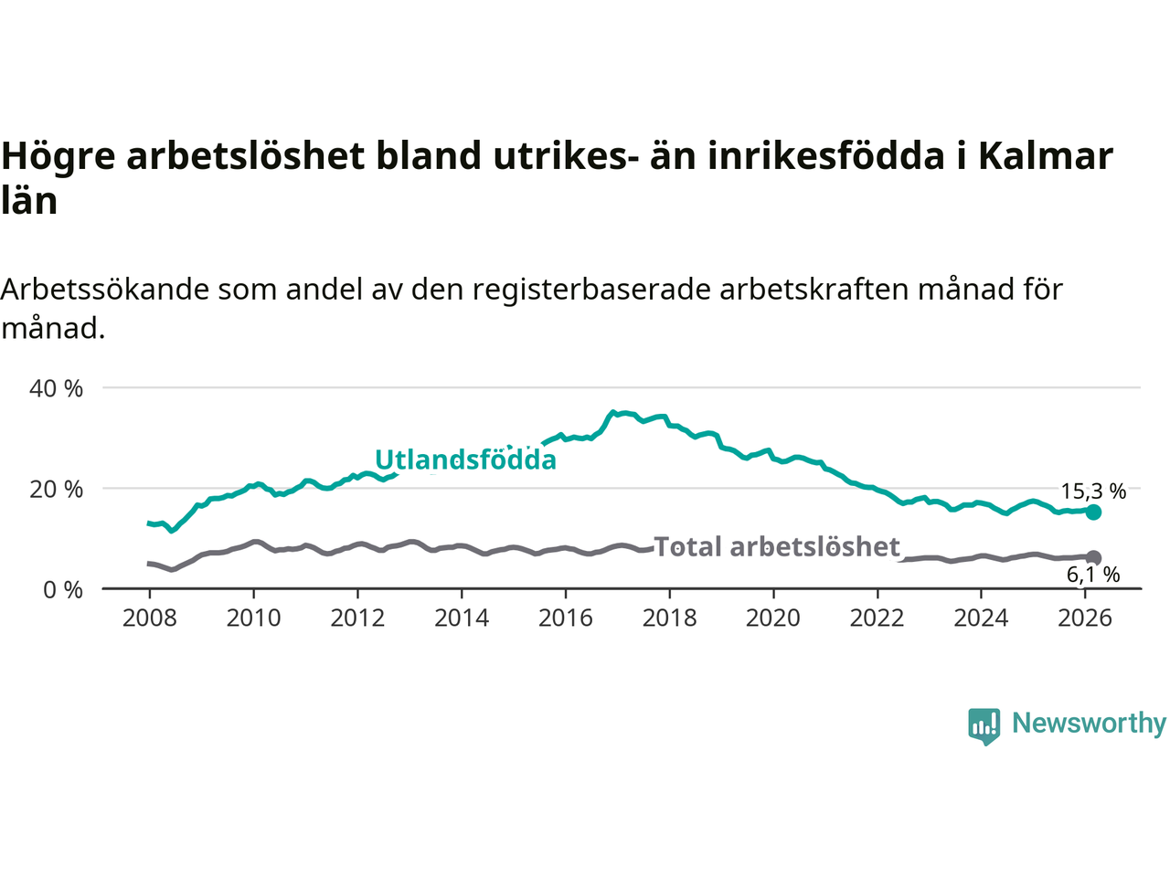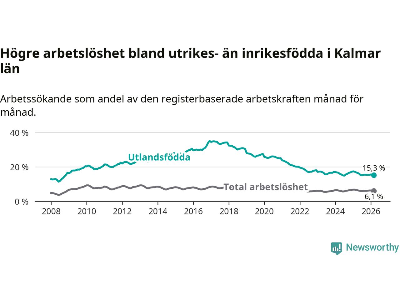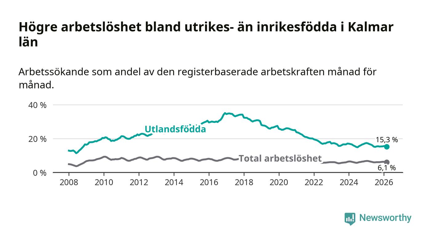 Arbetslösheten bland utlandsfödda var 15,3 procent i Kalmar under mars månad, motsvarande 3 267 av 21 353 personer. Det är 1,5 procentenheter färre än vid samma tidpunkt i fjol (−264 om man räknar personer). Därmed är de utlandsföddas arbetslöshet lägre än vid samma tidpunkt i fjol för åttonde månaden i följd.