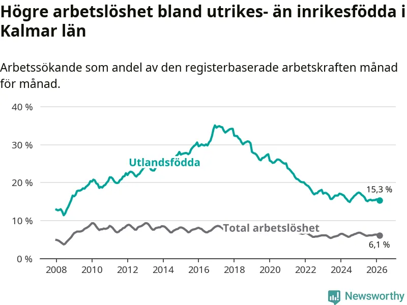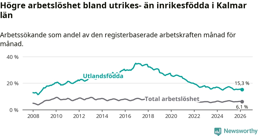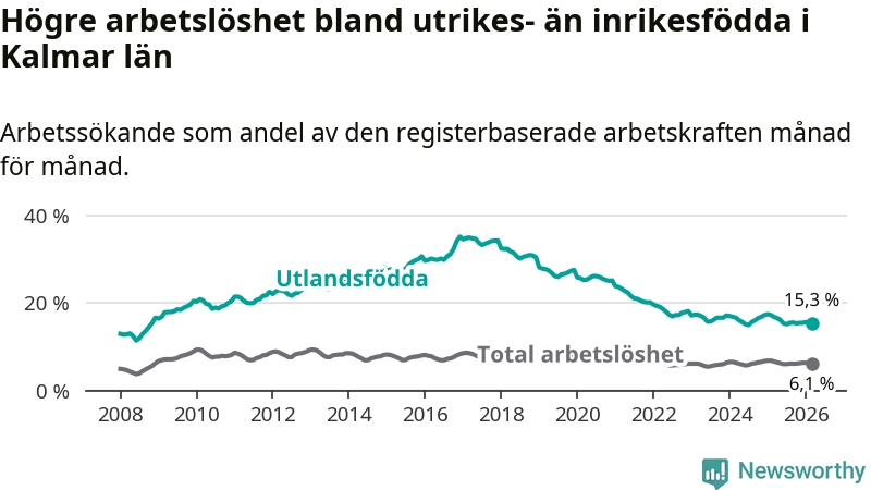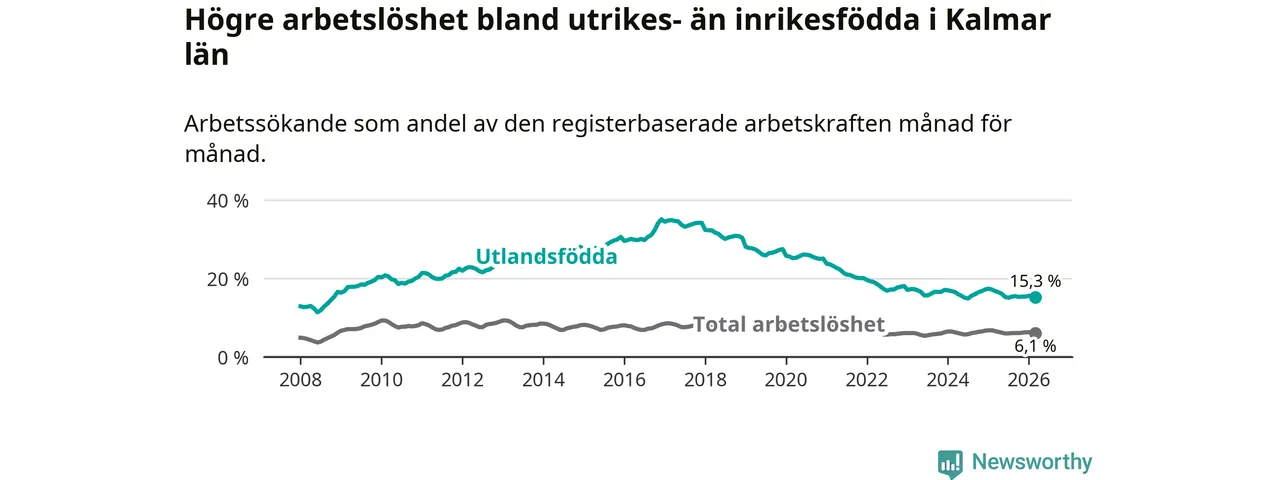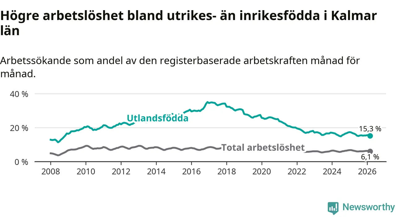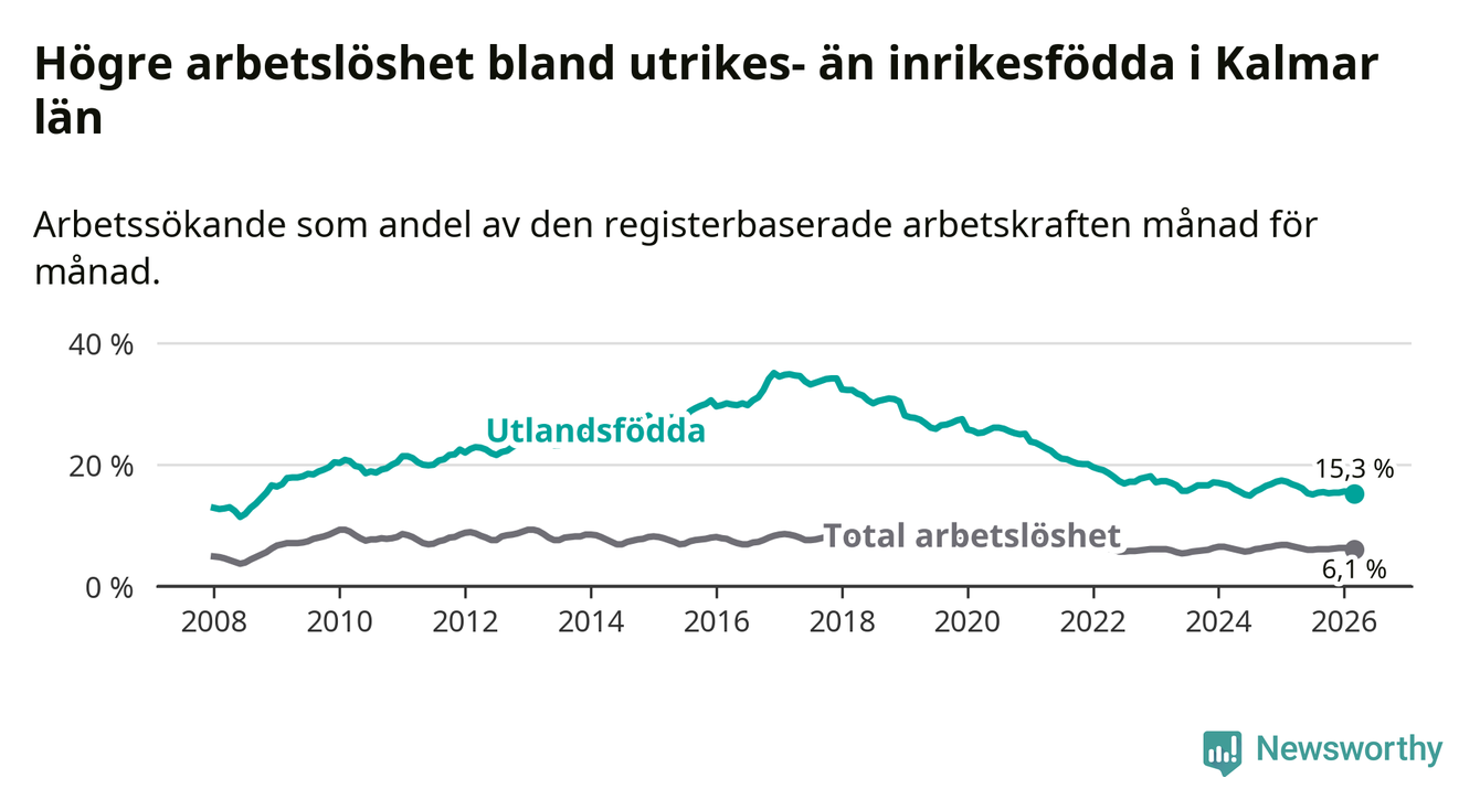 Arbetslösheten bland utlandsfödda var 15,3 procent i Kalmar under mars månad, motsvarande 3 267 av 21 353 personer. Det är 1,5 procentenheter färre än vid samma tidpunkt i fjol (−264 om man räknar personer). Därmed är de utlandsföddas arbetslöshet lägre än vid samma tidpunkt i fjol för åttonde månaden i följd.