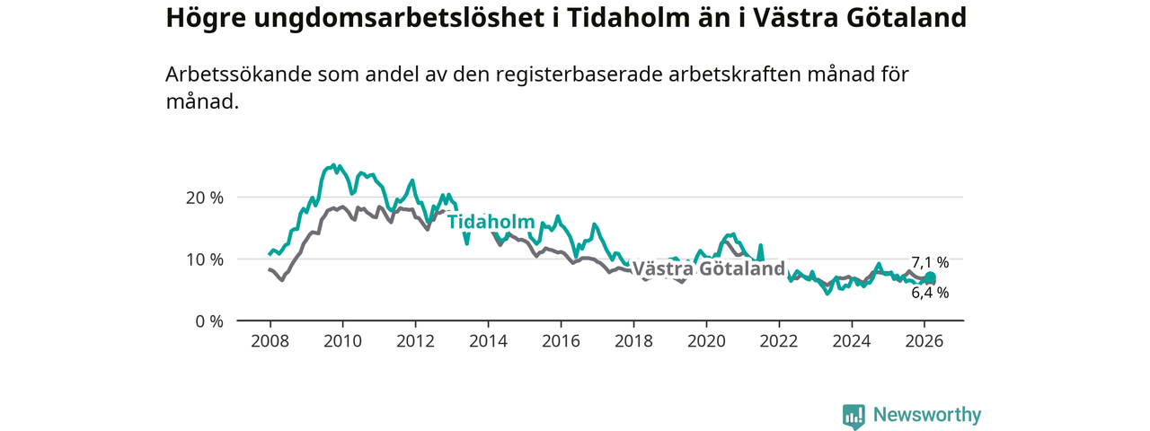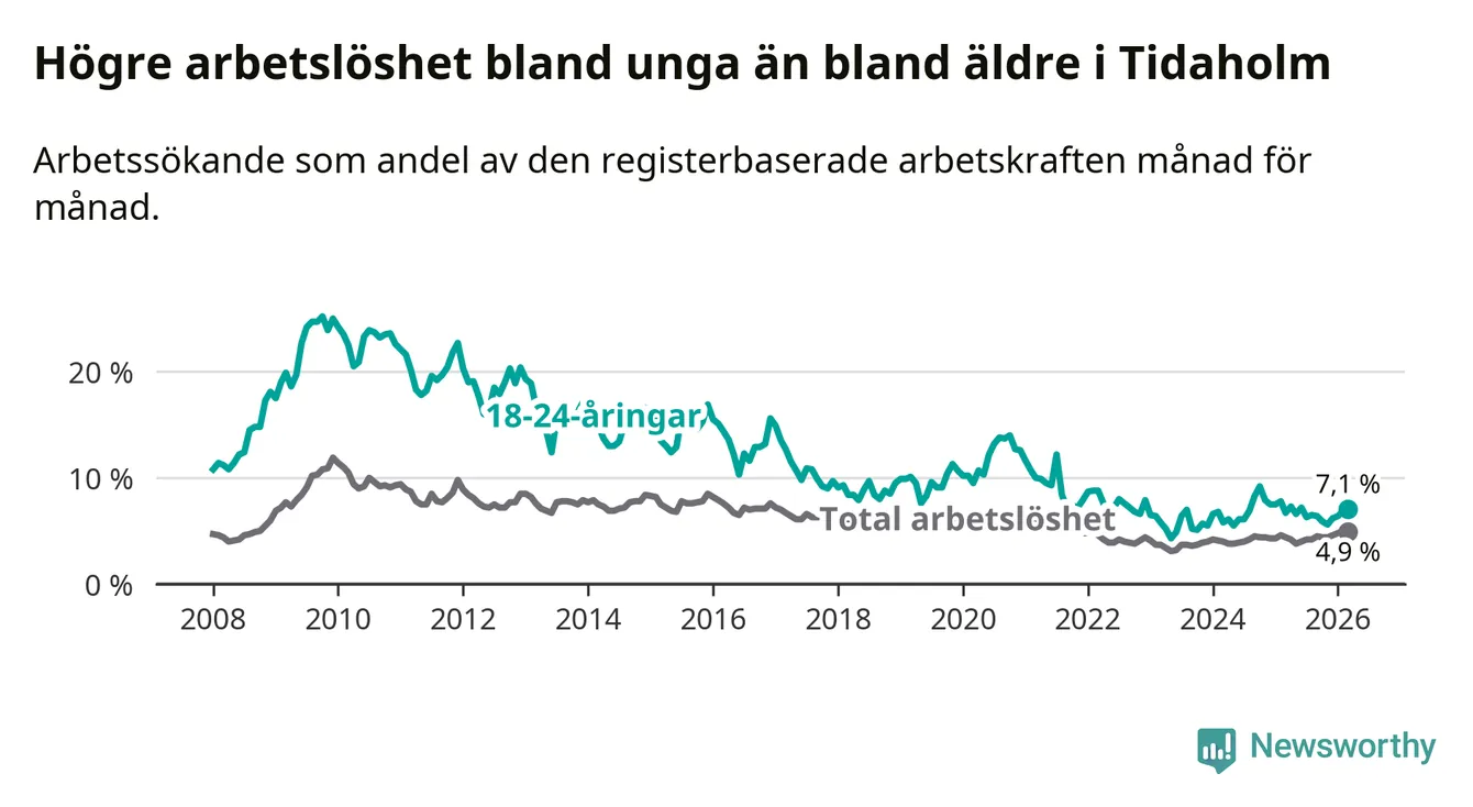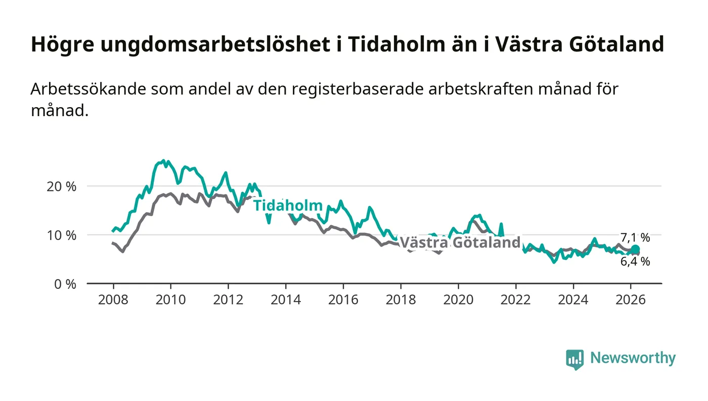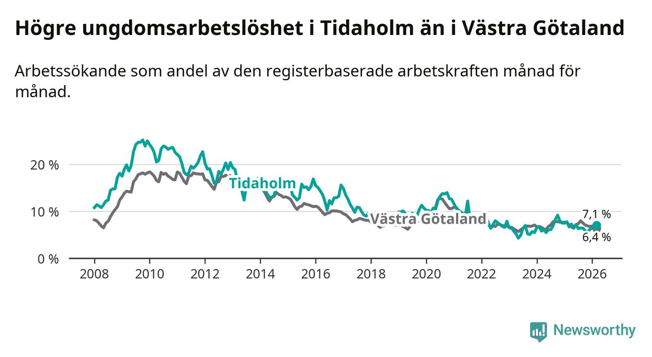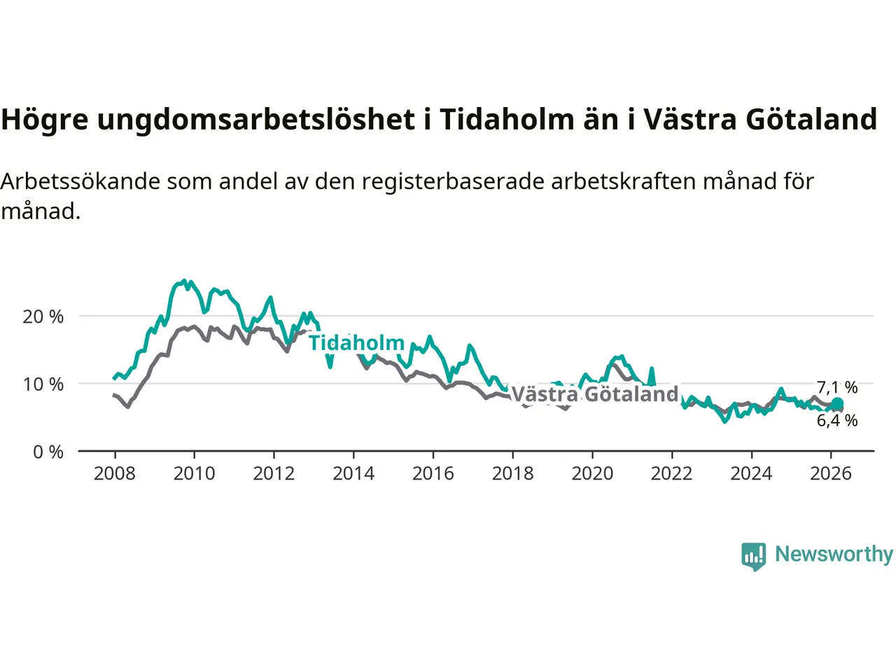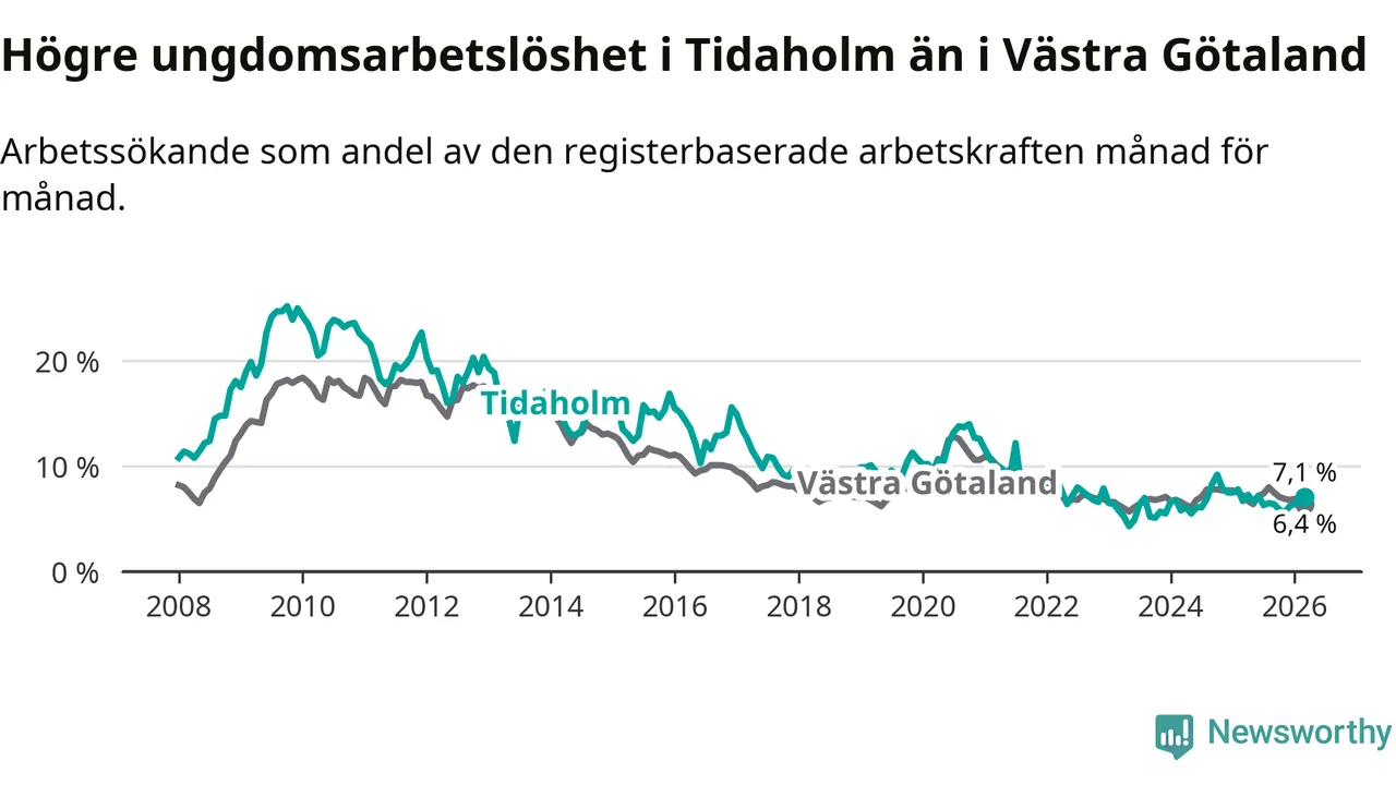 Medan Tidaholm har lägre total arbetslöshet än Västra Götaland, ligger ungdomsarbetslösheten 0,7 procentenheter högre i Tidaholm.