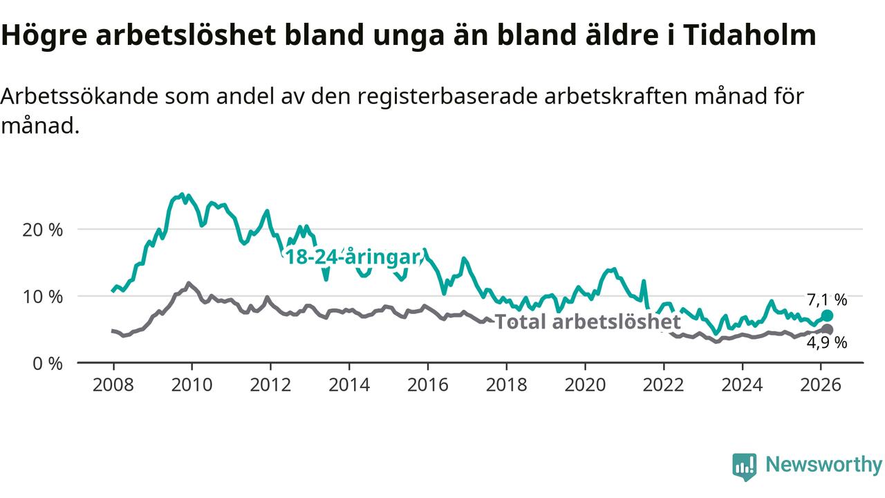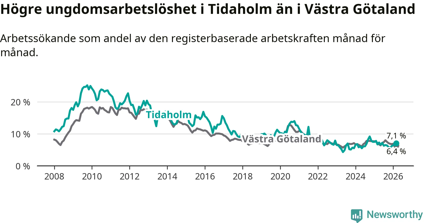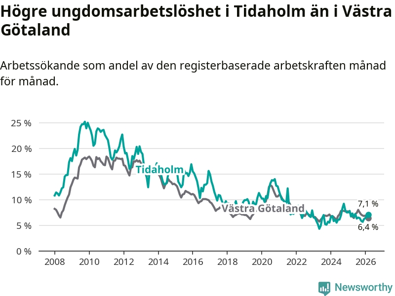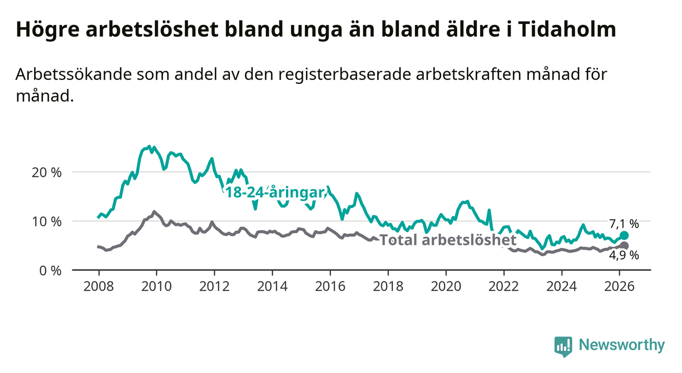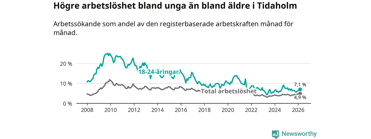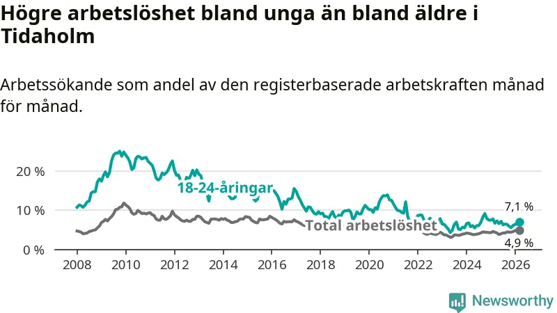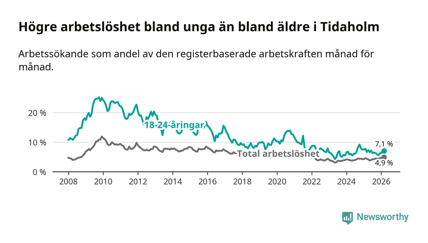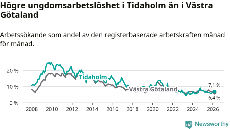 Medan Tidaholm har lägre total arbetslöshet än Västra Götaland, ligger ungdomsarbetslösheten 0,7 procentenheter högre i Tidaholm.