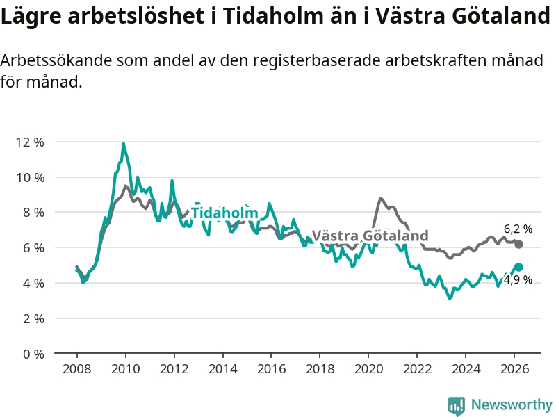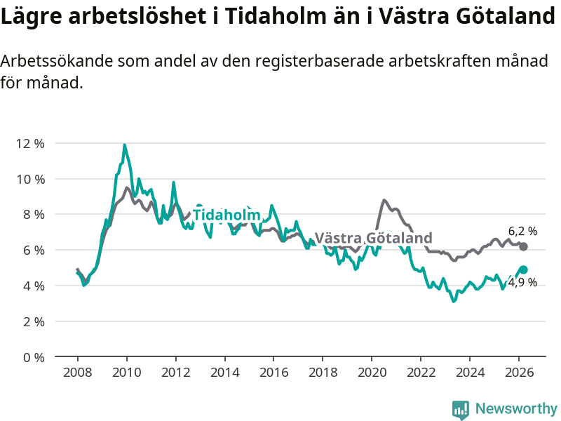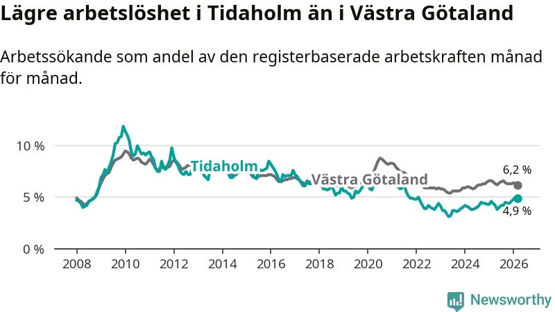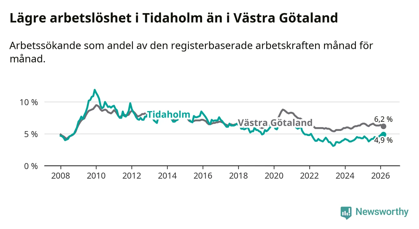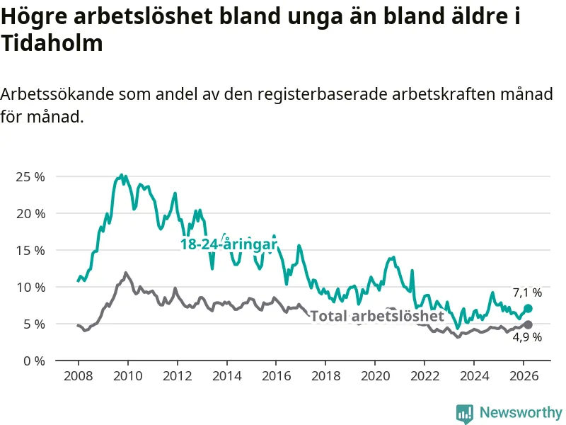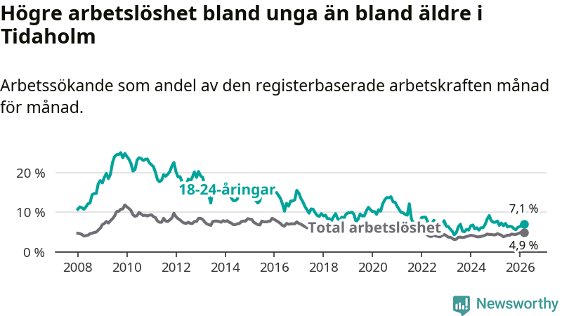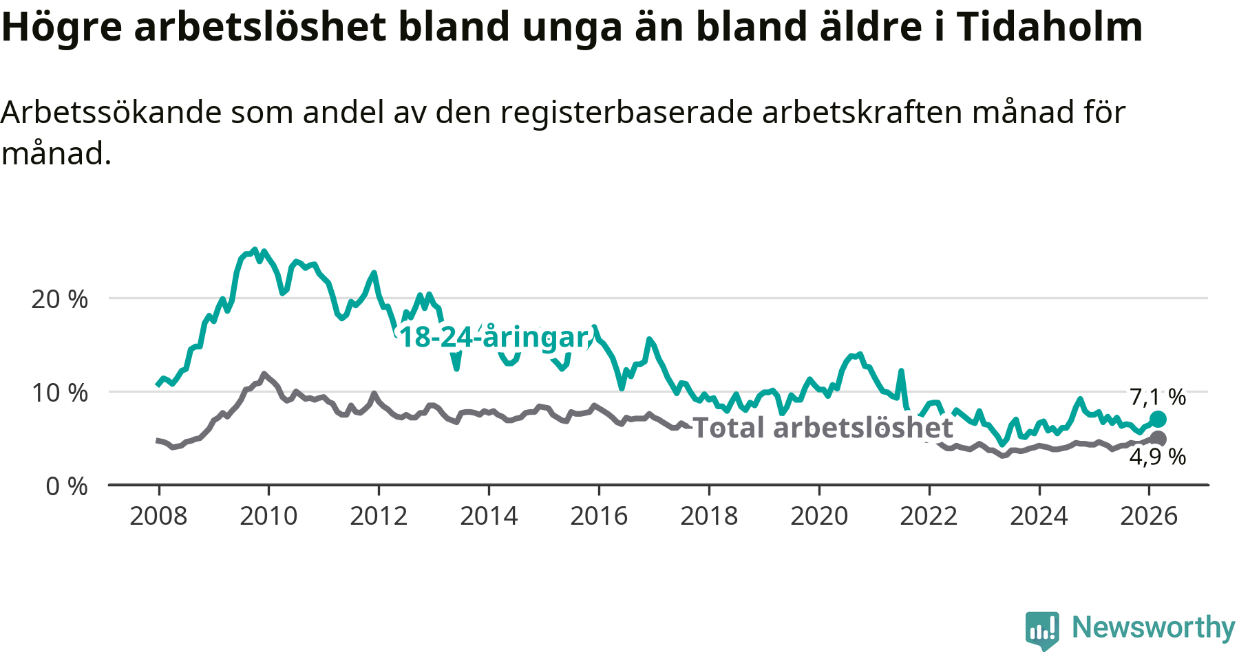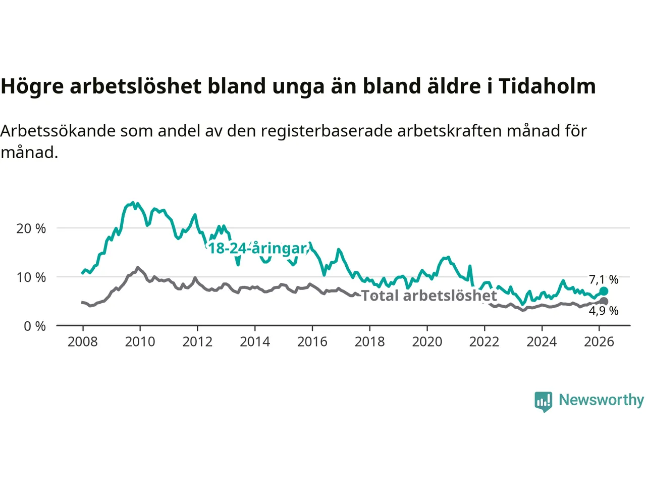 Medan Tidaholm har lägre total arbetslöshet än Västra Götaland, ligger ungdomsarbetslösheten 0,7 procentenheter högre i Tidaholm.