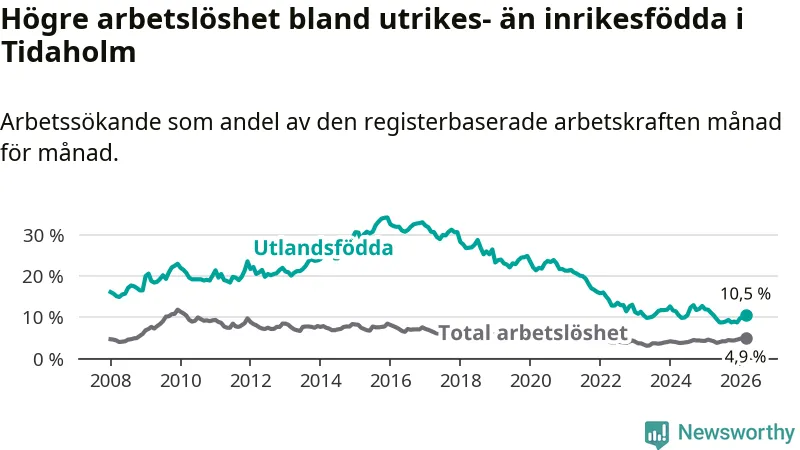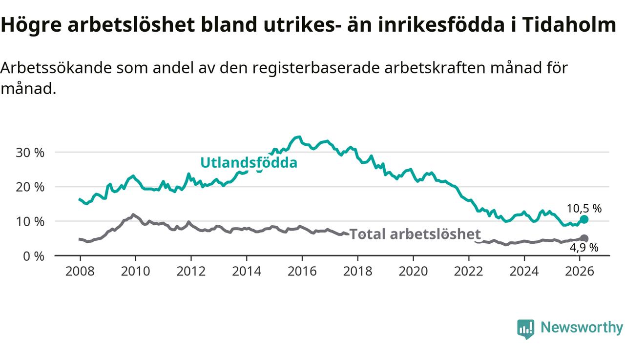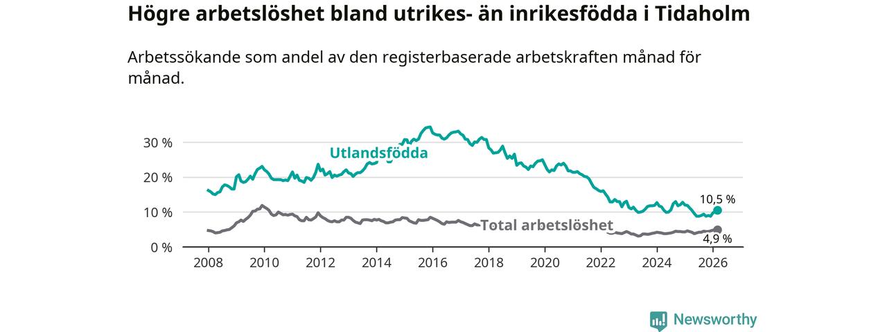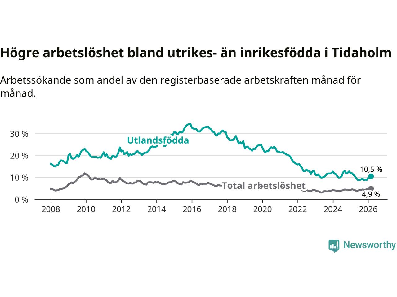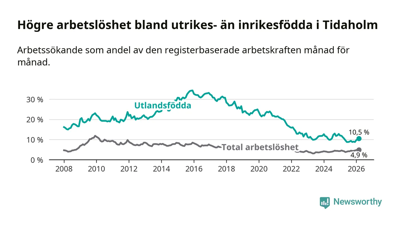 Skillnaden i arbetslöshet mellan utrikesfödda och hela befolkningen är 5,6 procentenheter i Tidaholm. Det är en mindre skillnad än för ett år sedan (−1,2 procentenheter).