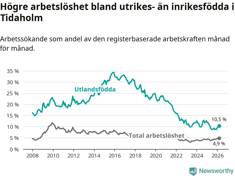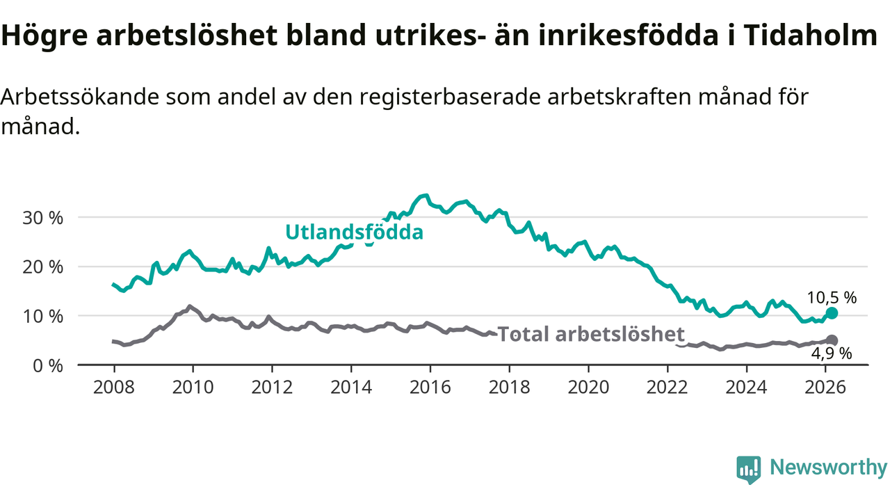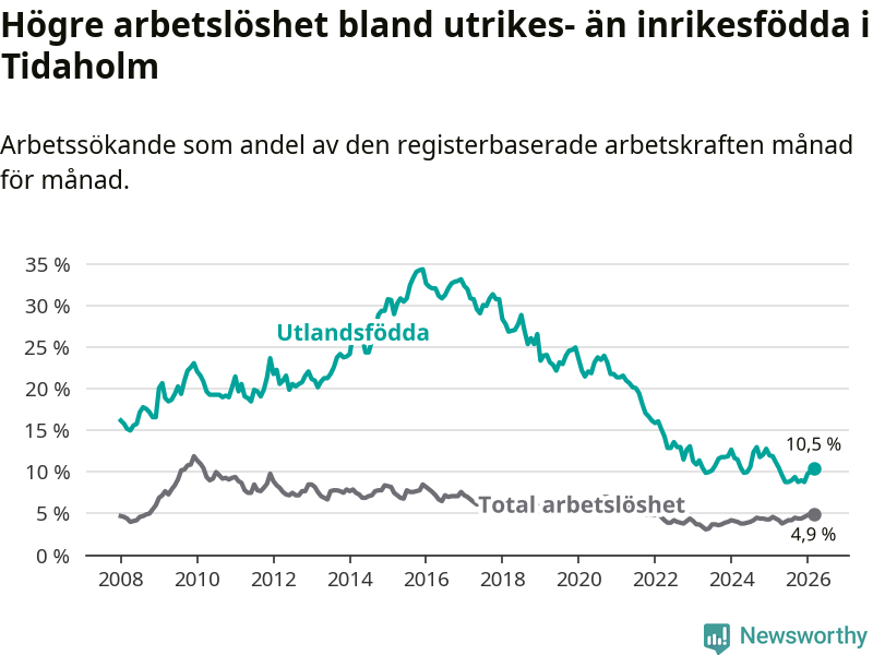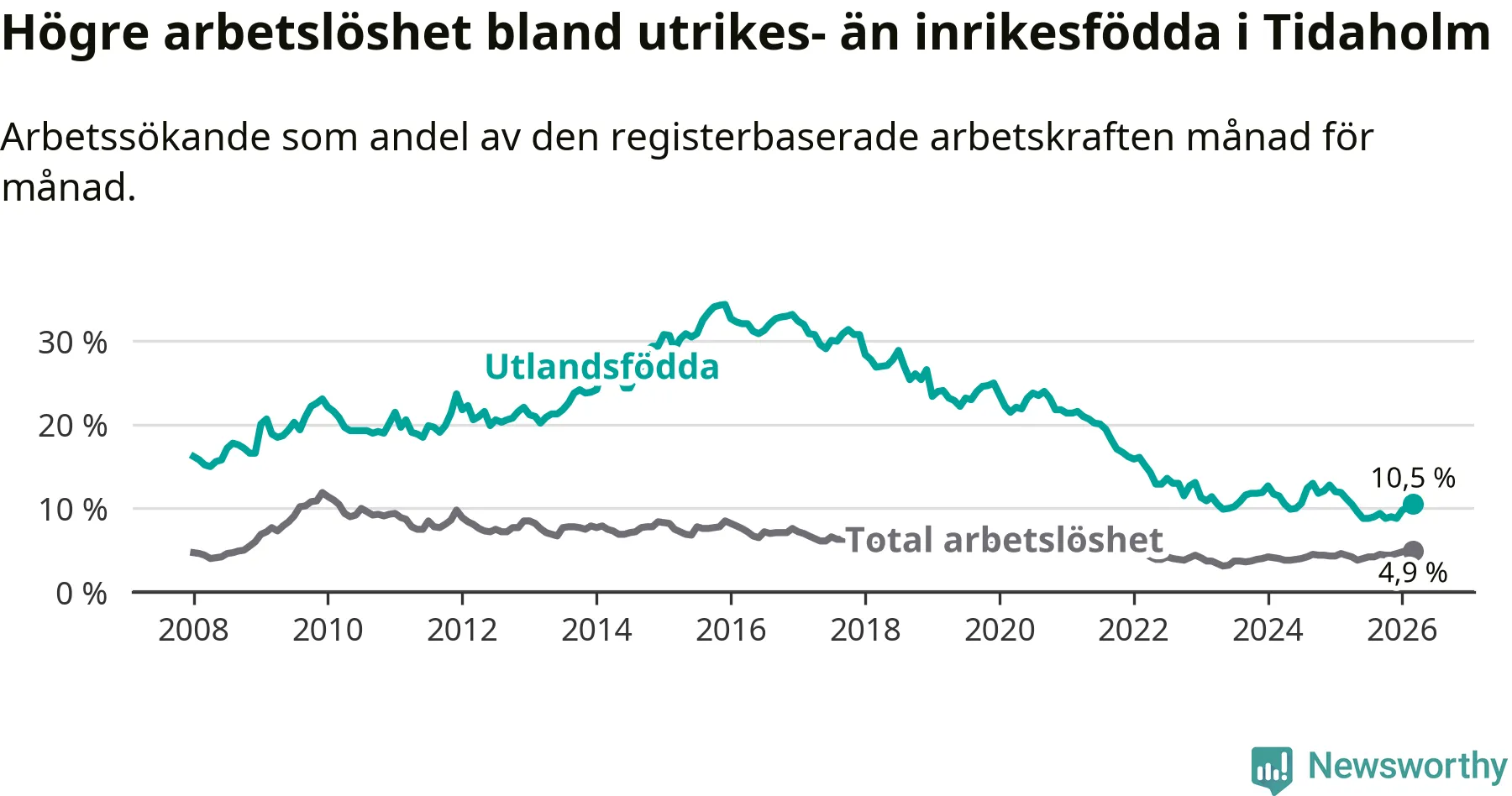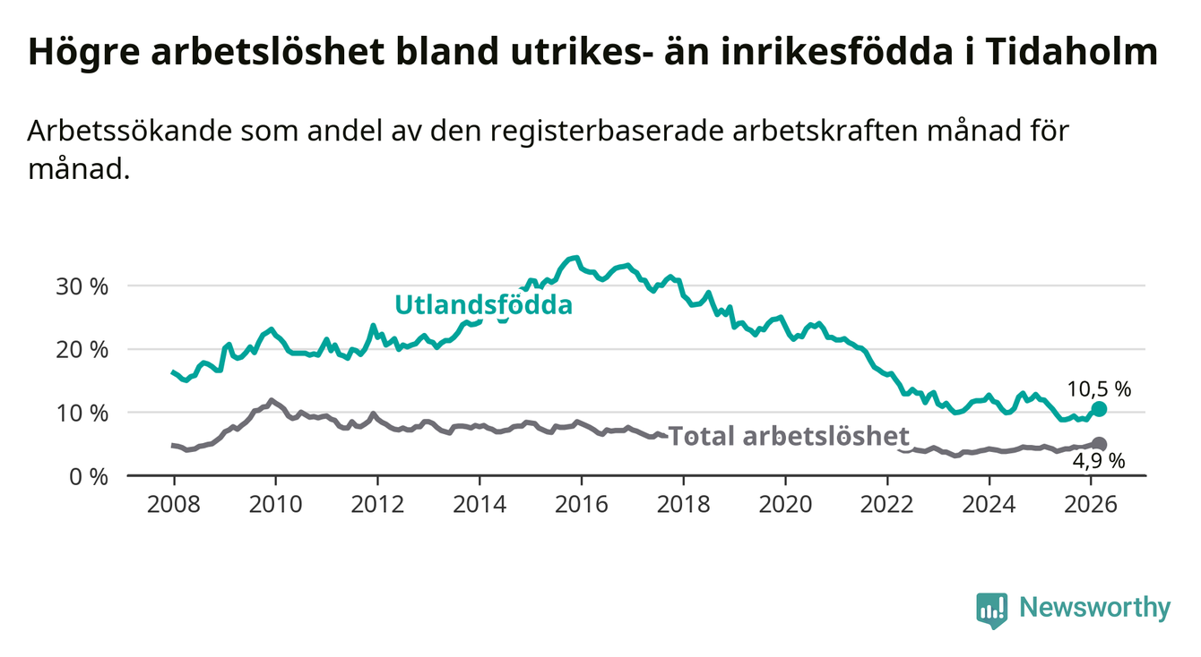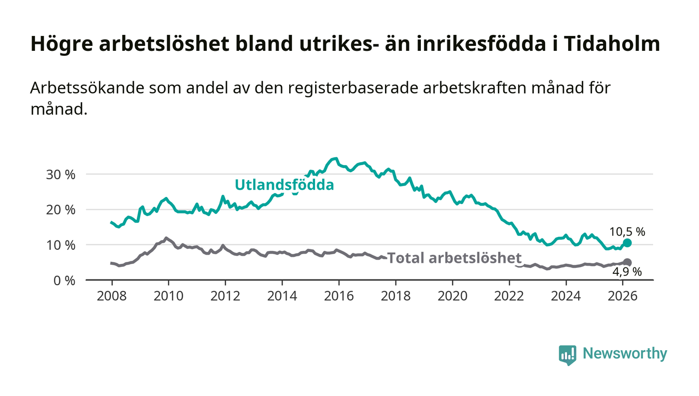 Skillnaden i arbetslöshet mellan utrikesfödda och hela befolkningen är 5,6 procentenheter i Tidaholm. Det är en mindre skillnad än för ett år sedan (−1,2 procentenheter).