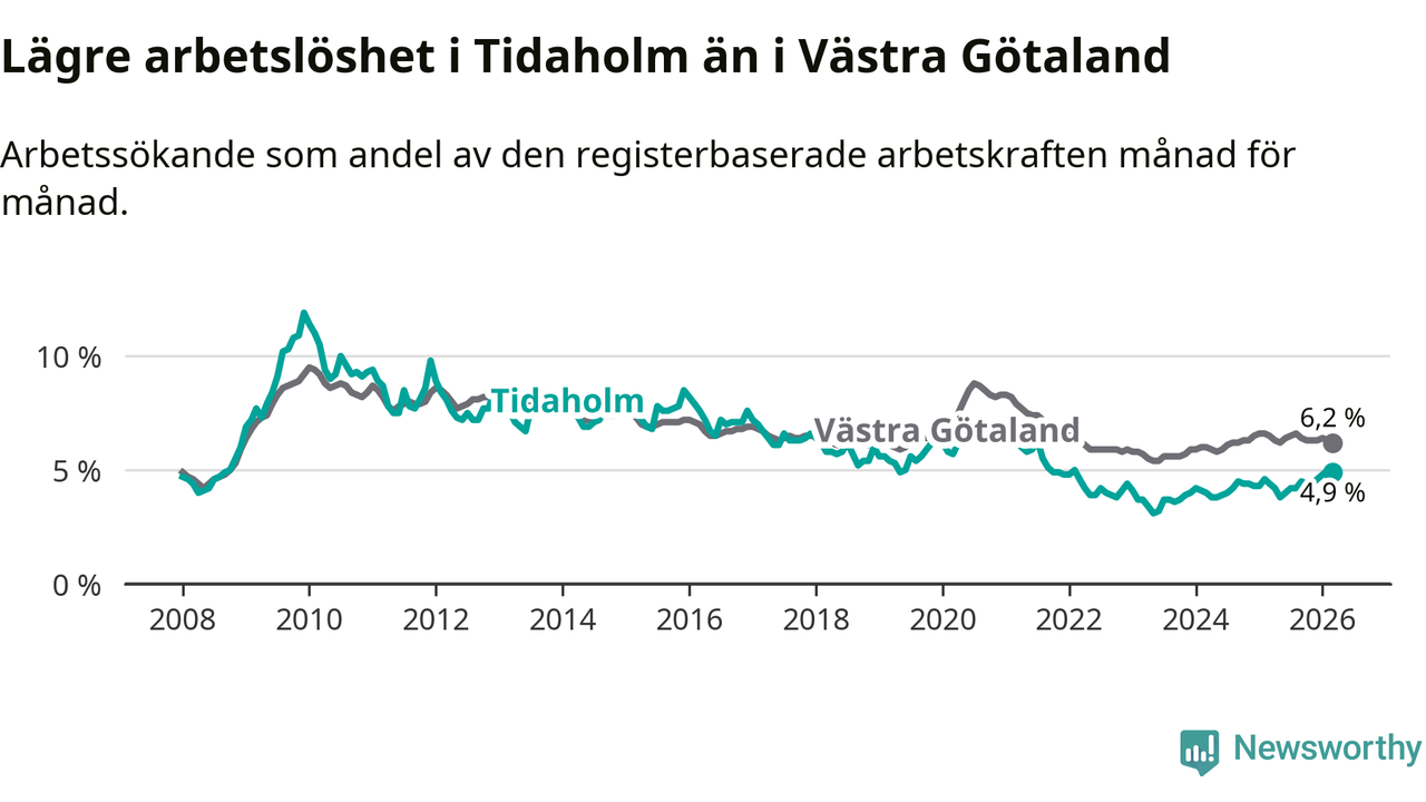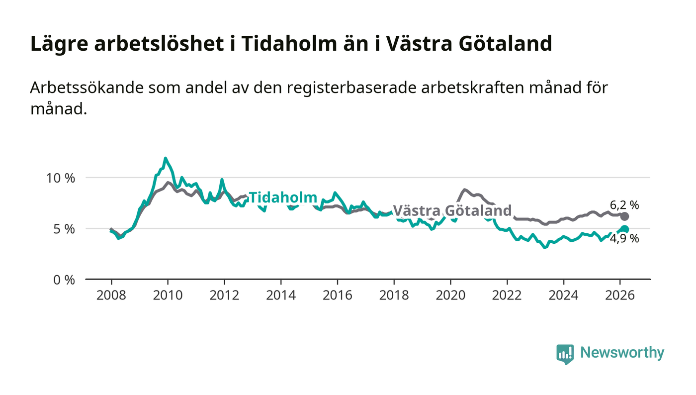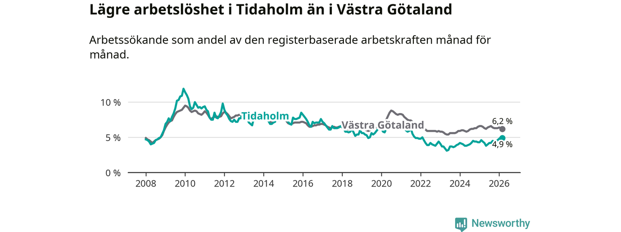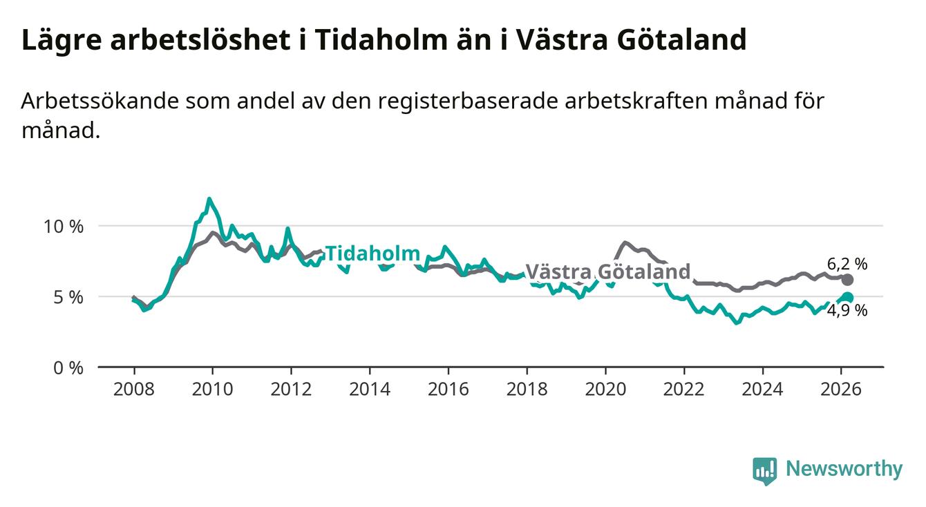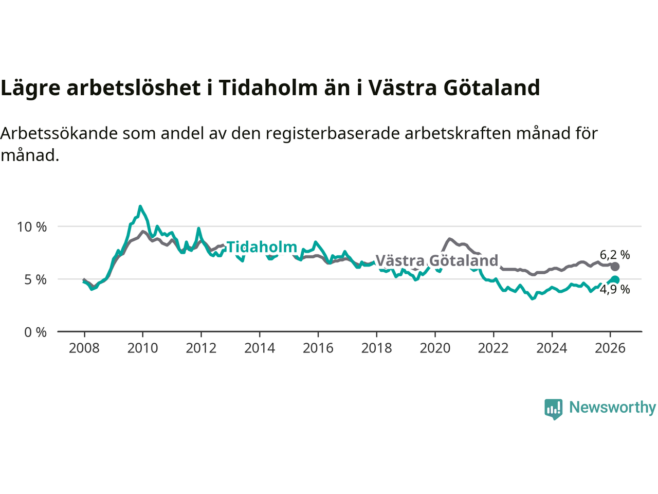 Under mars månad rapporterade Tidaholms kommun en total arbetslöshet på 4,9 procent. Det är en ökning jämfört med samma tidpunkt i fjol (+0,5 procentenheter). I Västra Götalands län däremot sjunker arbetslösheten .