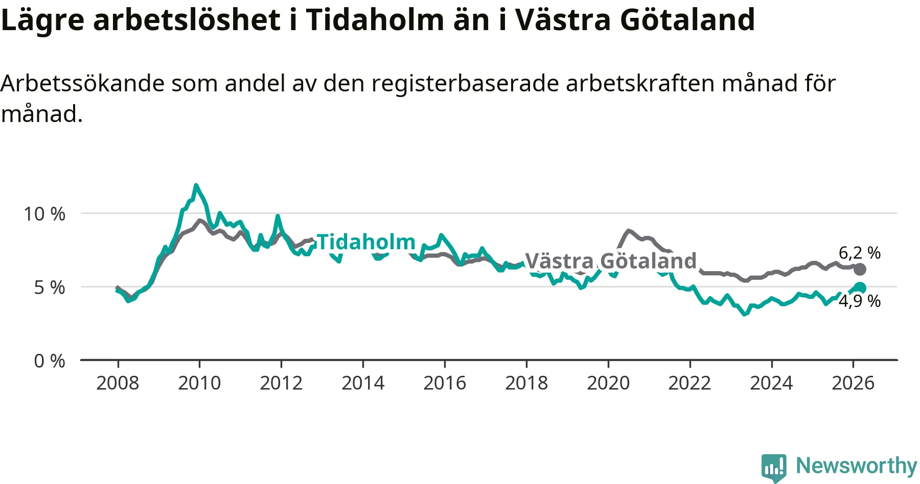Även om arbetslösheten i Tidaholm alltså ökar, så ligger den fortfarande under snittet i hela Västra Götalands län (4,9 procent i kommunen, jämfört med 6,2 procent i hela länet). Öckerö har den lägsta arbetslösheten i länet (2,6 procent), medan Gullspång har den högsta (8,1 procent). För att Tidaholm skulle komma ner i samma arbetslöshetsnivå som Öckerö skulle 141 personer behöva sysselsättas.