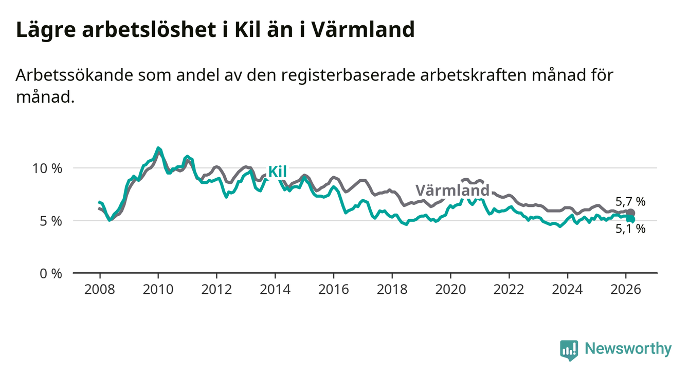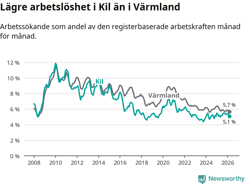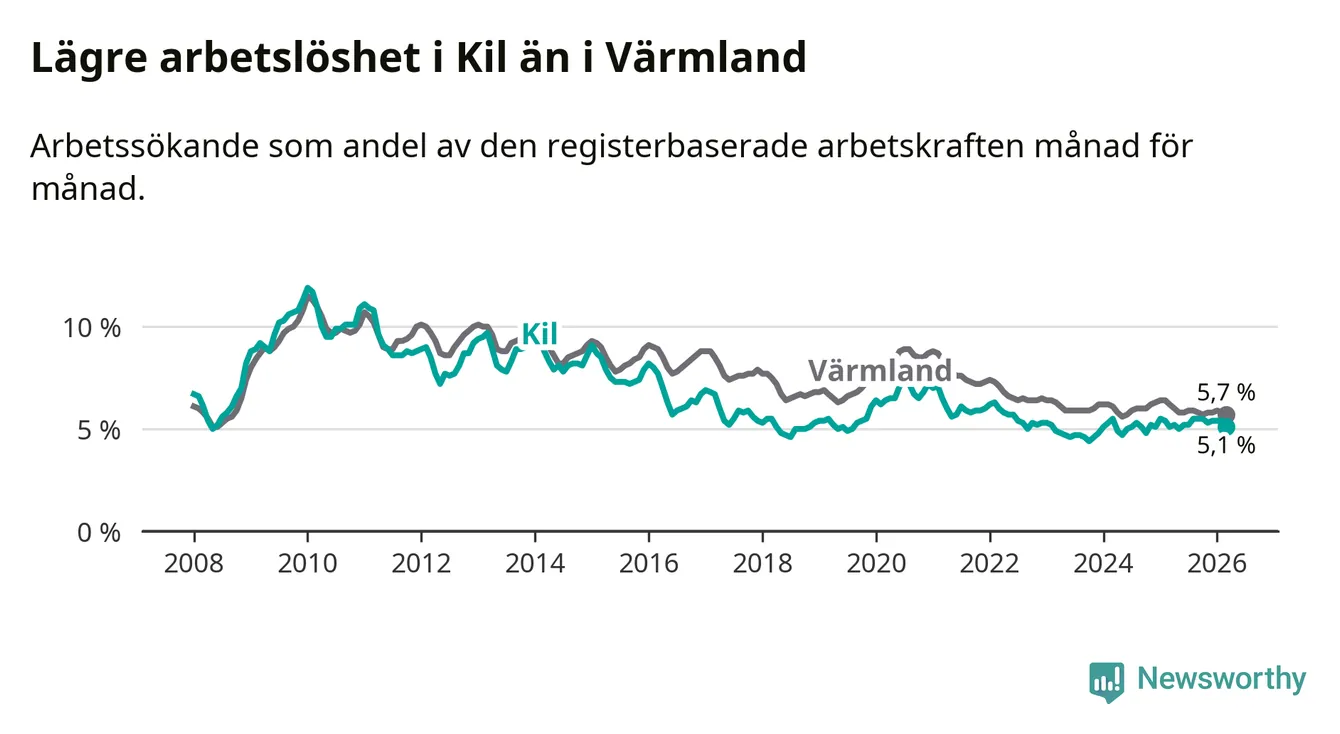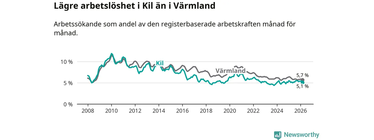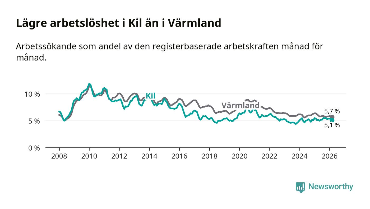 Kil går därmed mot strömmen i förhållande till andra kommuner i Värmlands län. I de flesta andra kommuner i länet går arbetslösheten nedåt. Störst är minskningen i Kristinehamn, där arbetslösheten sjunker med 1,2 procentenheter. I tabellen längre ner ser du utvecklingen i samtliga kommuner i länet.