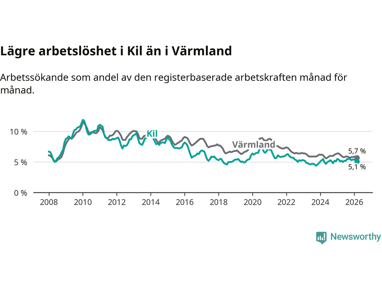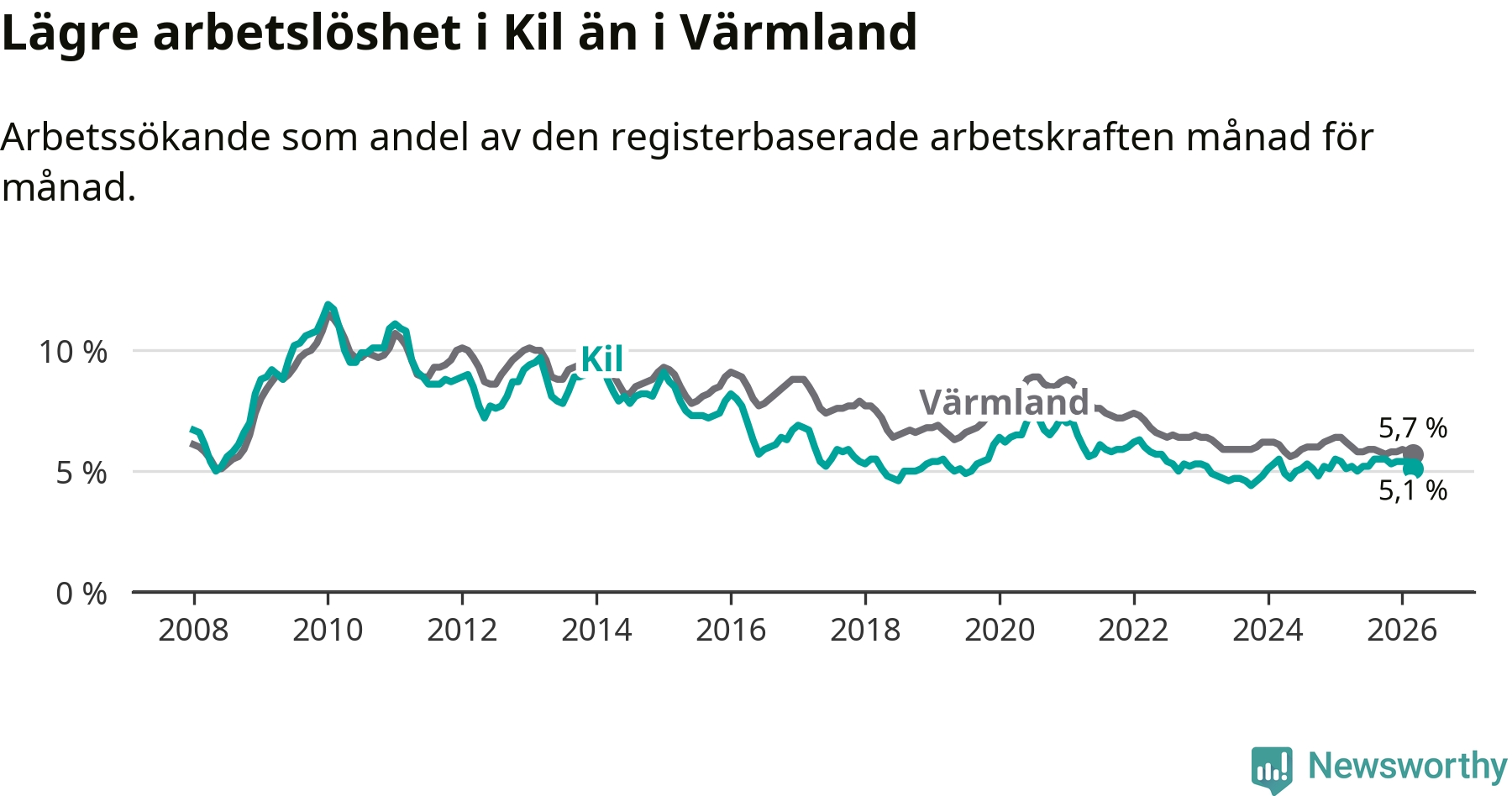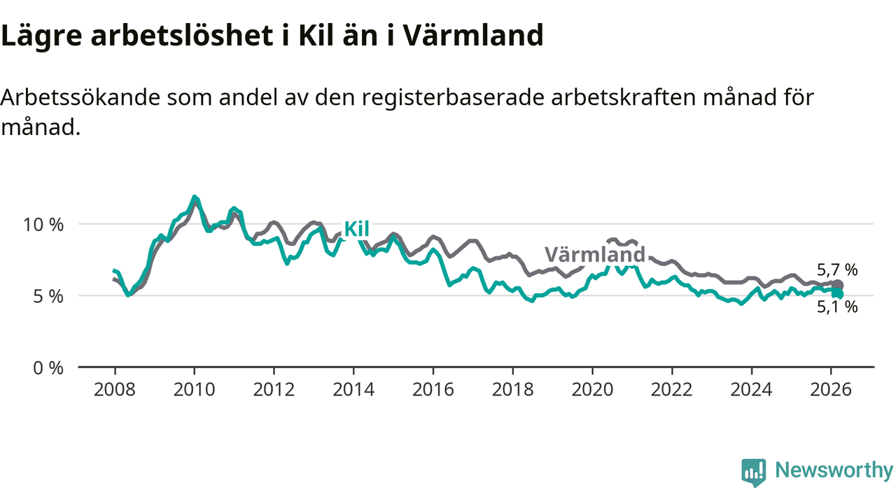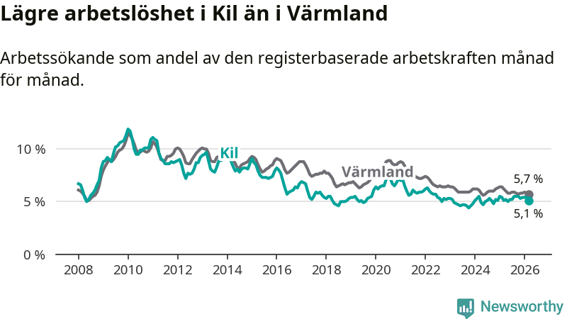 Kil går därmed mot strömmen i förhållande till andra kommuner i Värmlands län. I de flesta andra kommuner i länet går arbetslösheten nedåt. Störst är minskningen i Kristinehamn, där arbetslösheten sjunker med 1,2 procentenheter. I tabellen längre ner ser du utvecklingen i samtliga kommuner i länet.