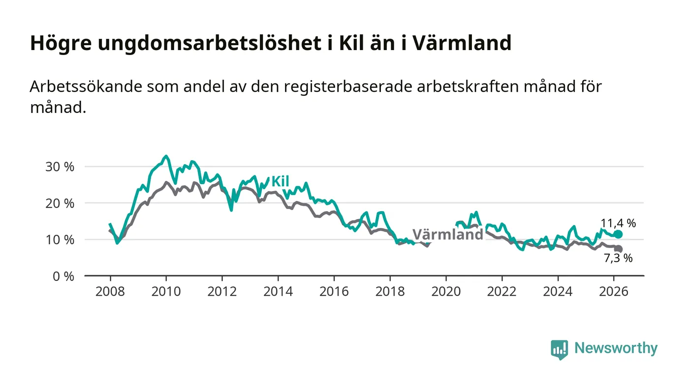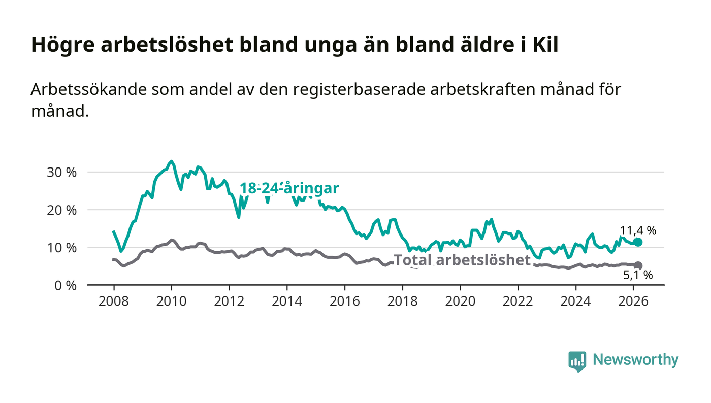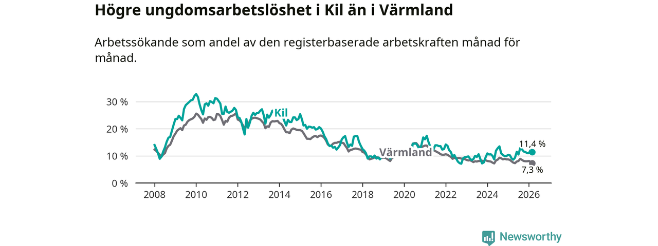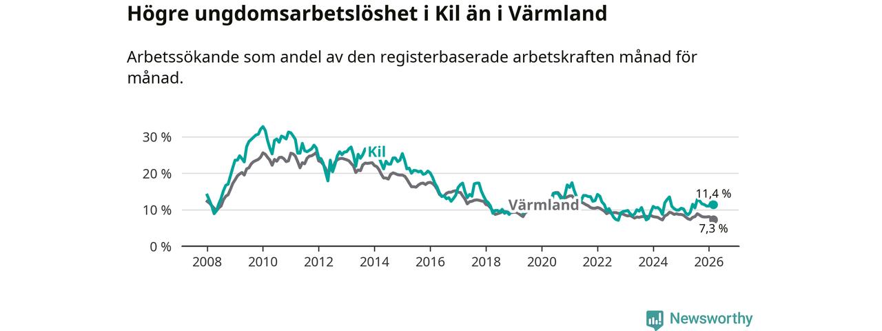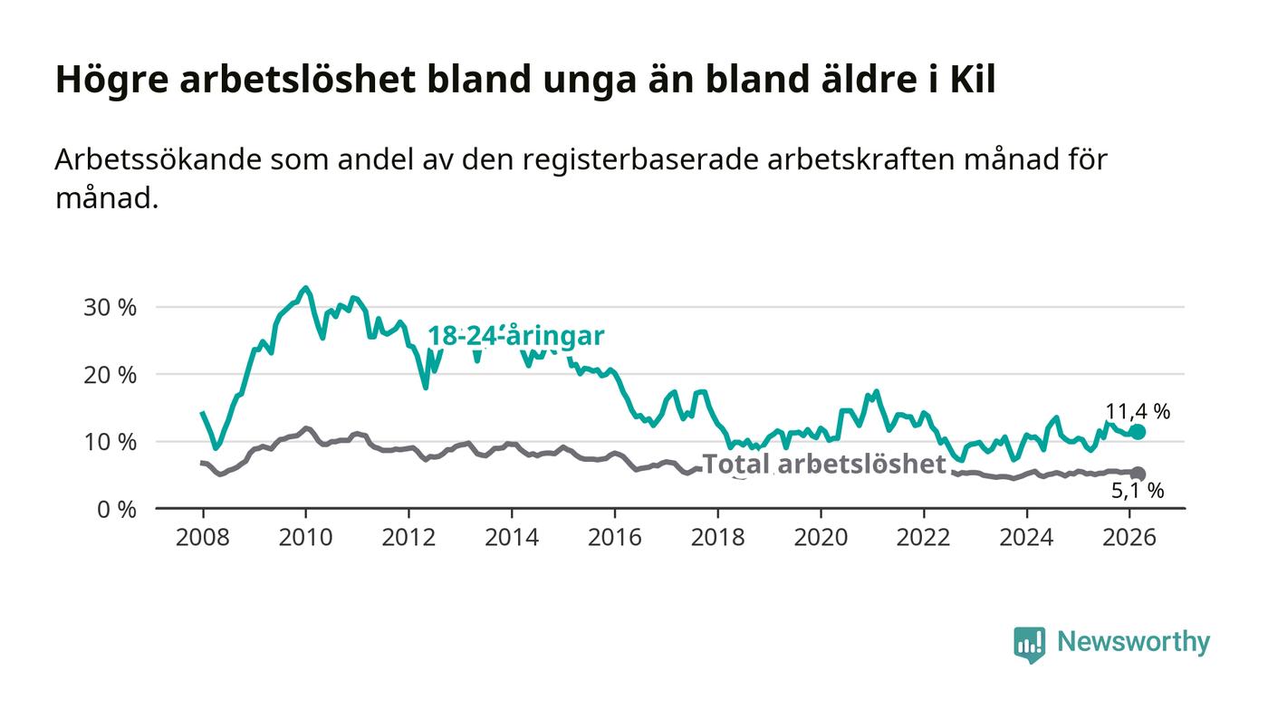 I och med den senaste månadens uppgång har de ungas arbetslöshet i Kil stigit sju månader i följd (upp från 12,9 procent i augusti 2025 till 11,4 procent nu).
