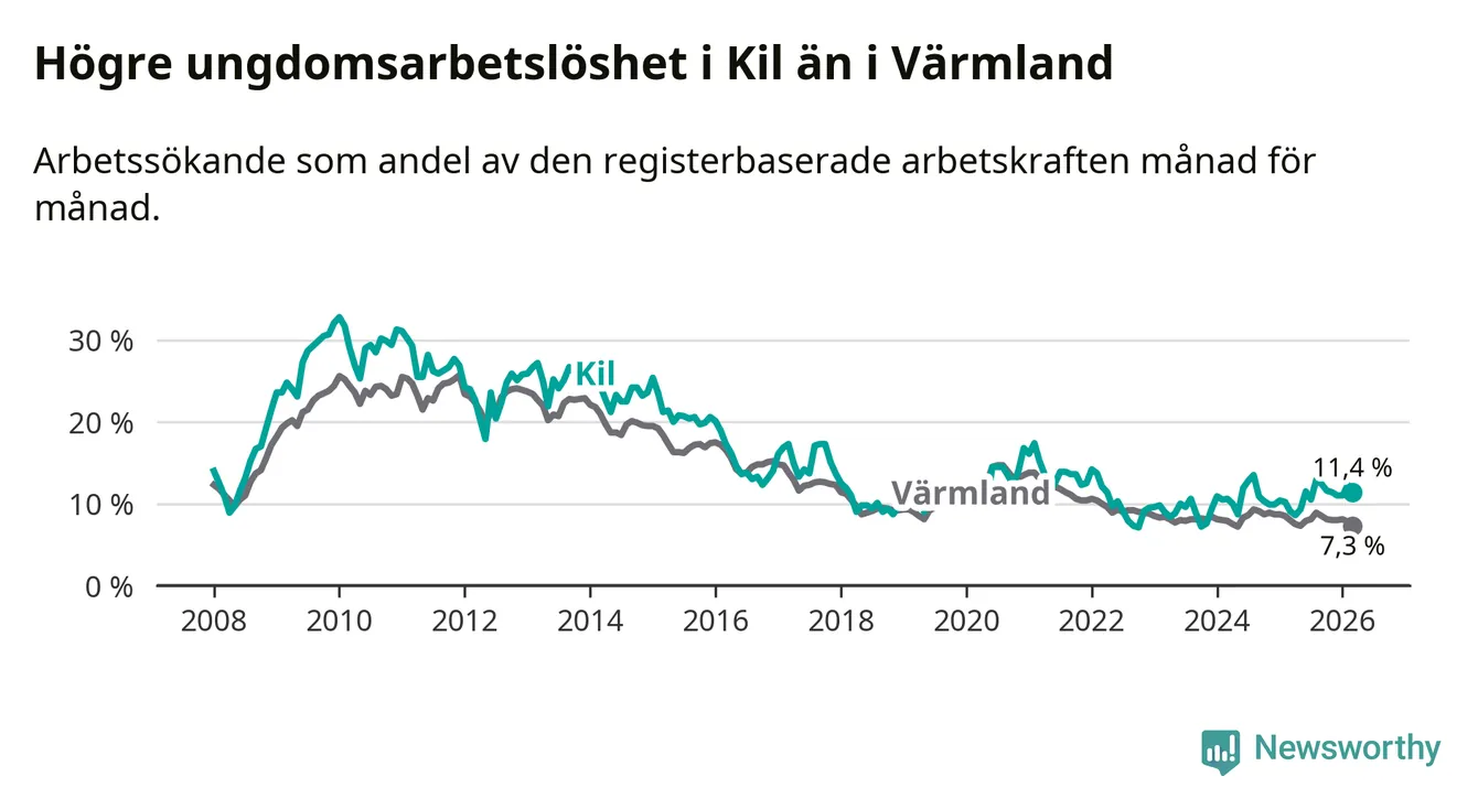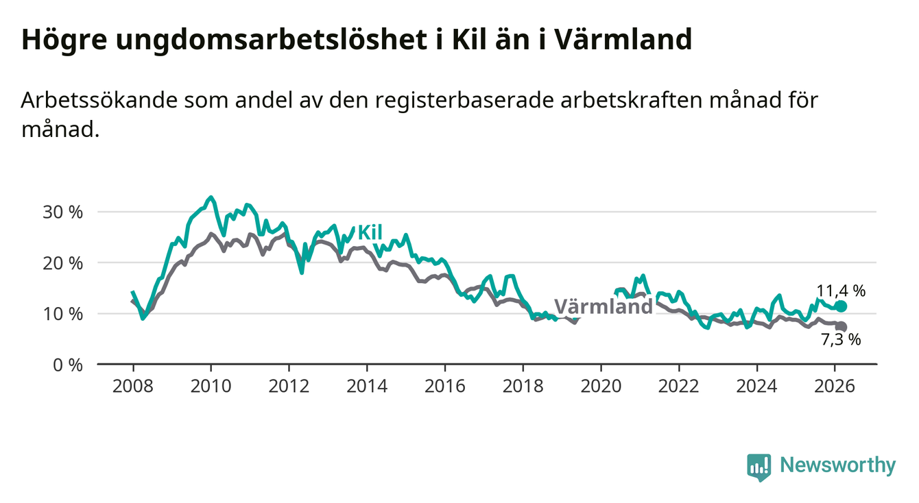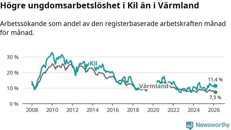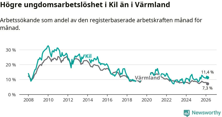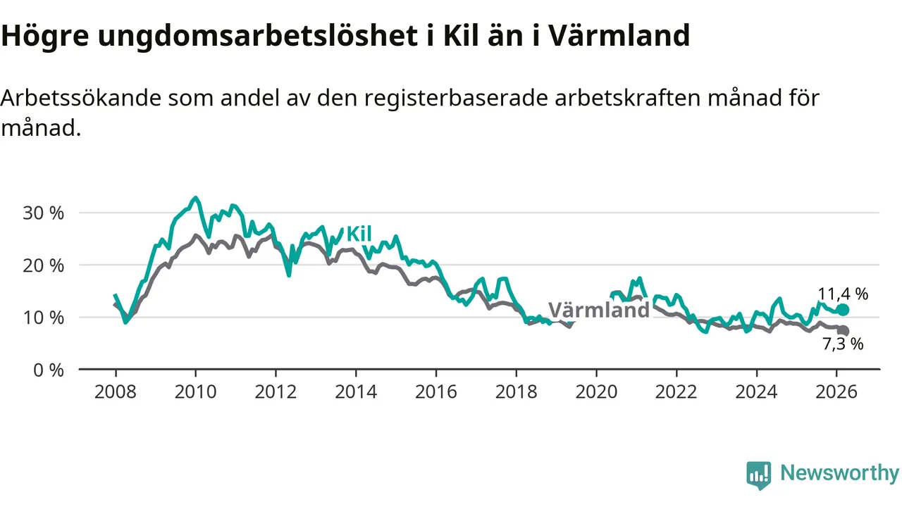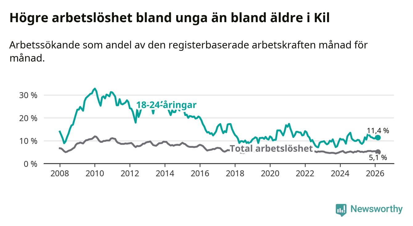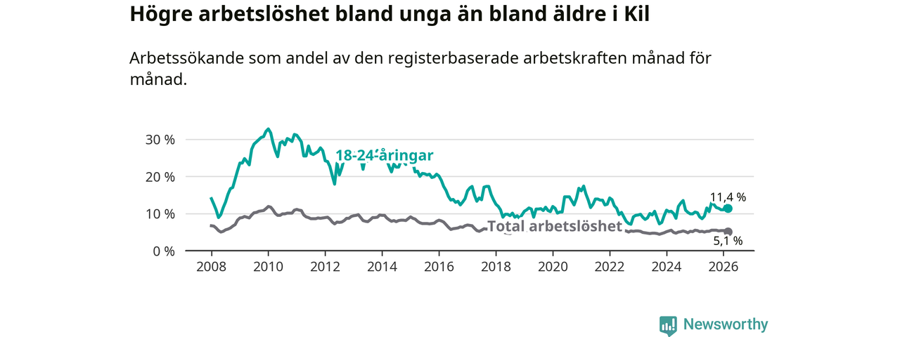 I och med den senaste månadens uppgång har de ungas arbetslöshet i Kil stigit sju månader i följd (upp från 12,9 procent i augusti 2025 till 11,4 procent nu).
