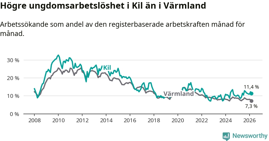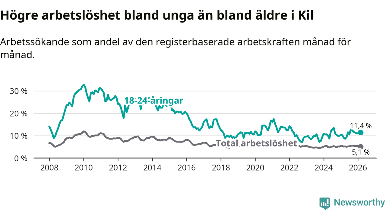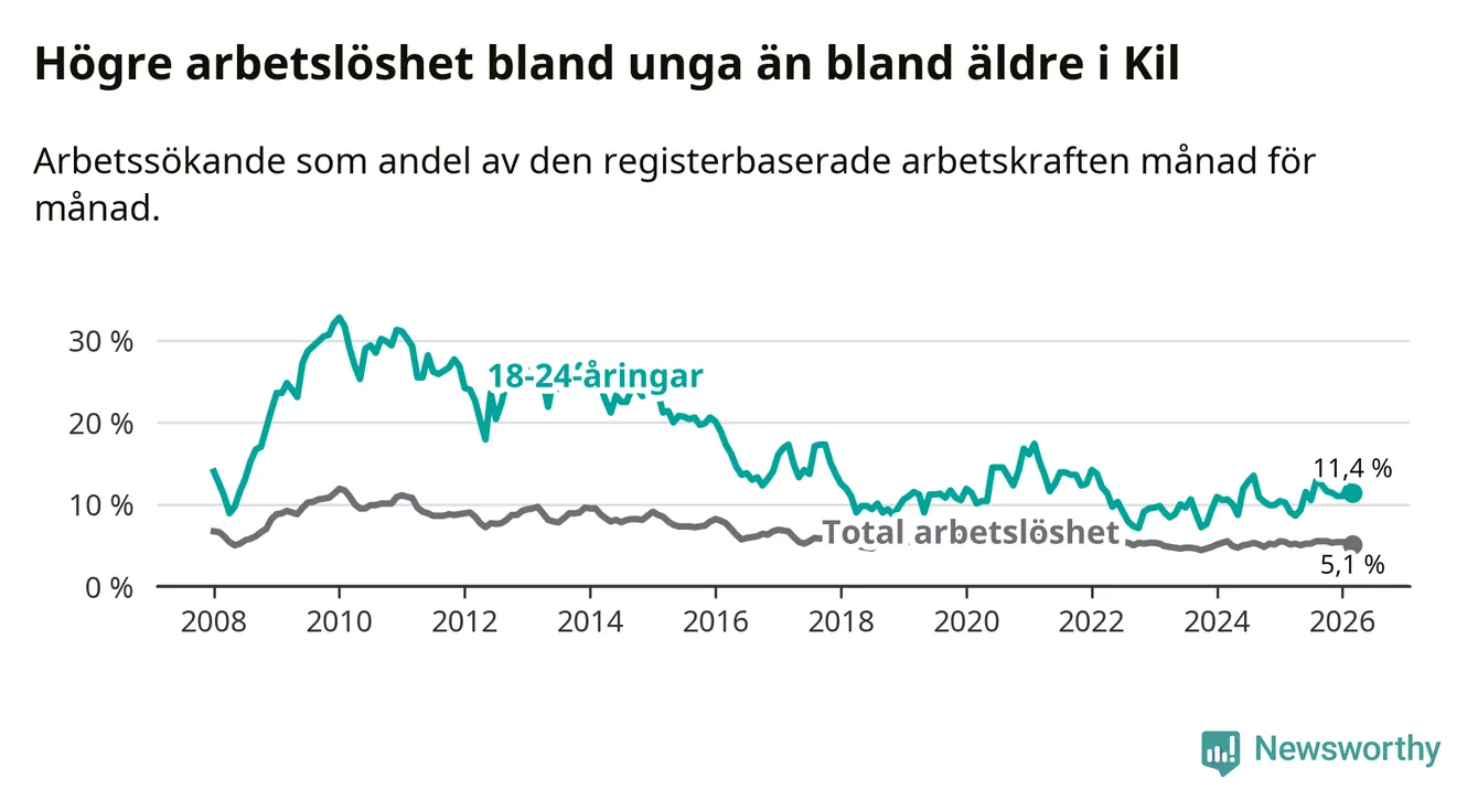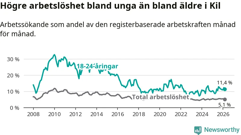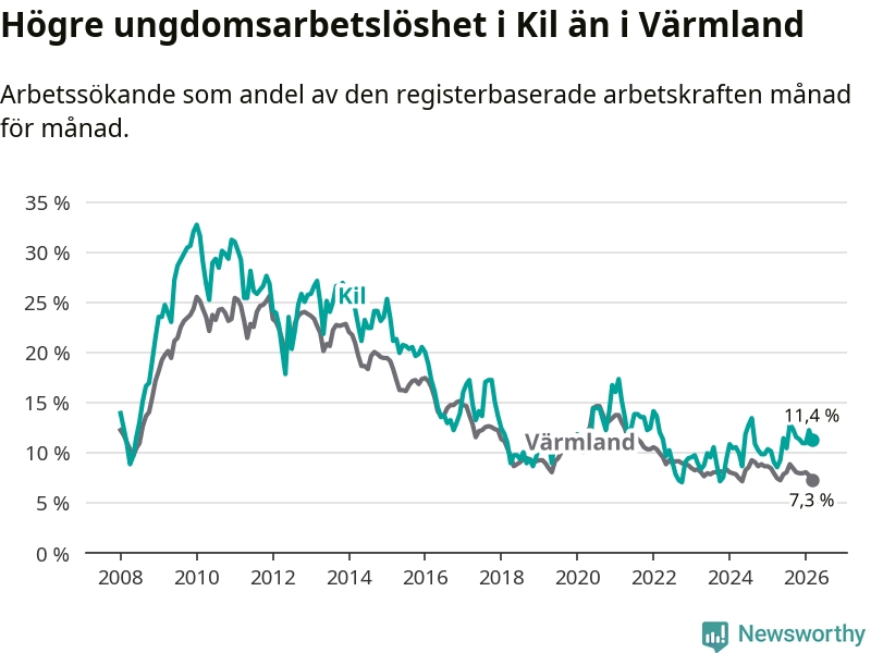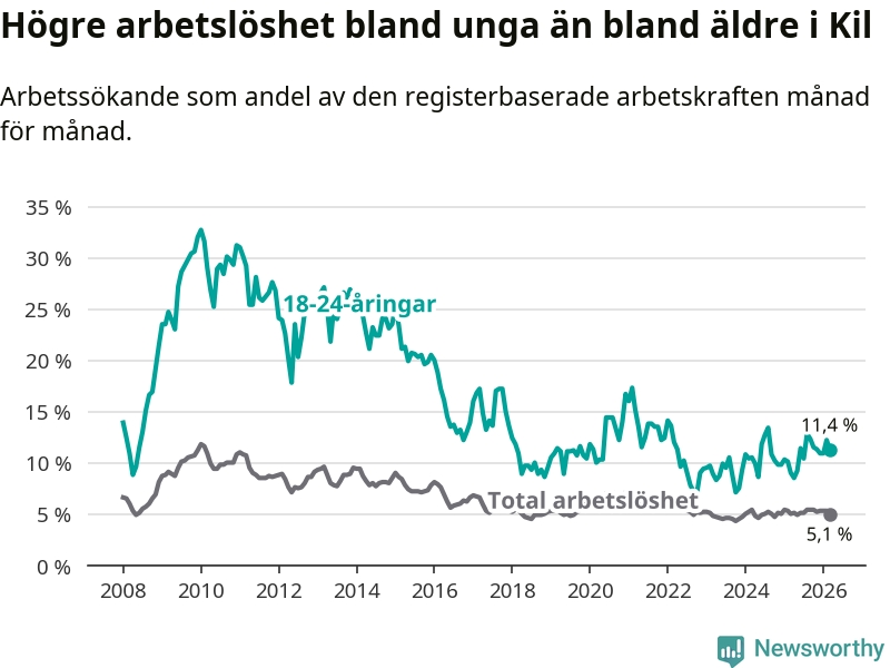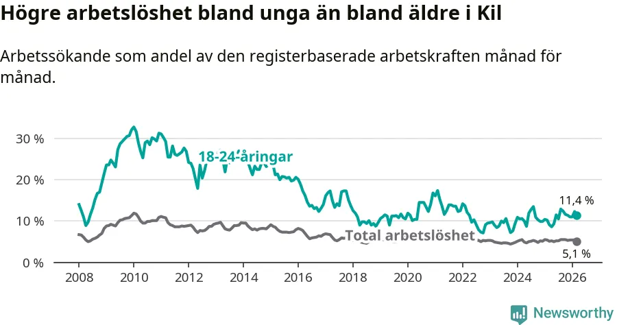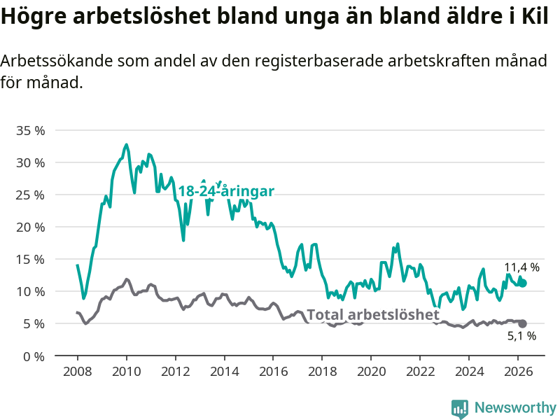 I och med den senaste månadens uppgång har de ungas arbetslöshet i Kil stigit sju månader i följd (upp från 12,9 procent i augusti 2025 till 11,4 procent nu).